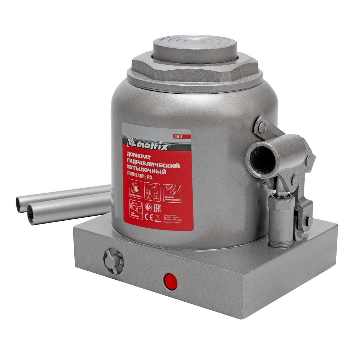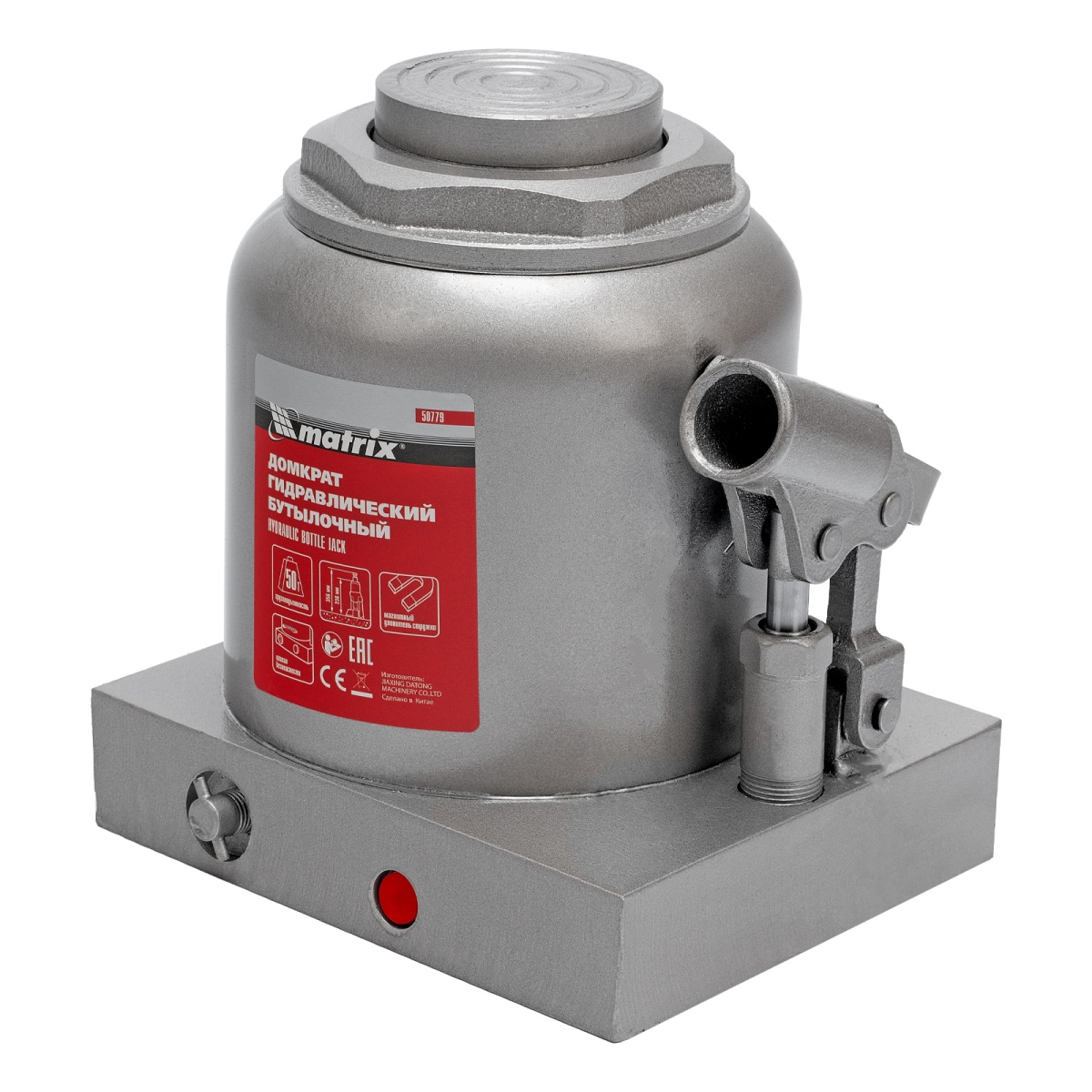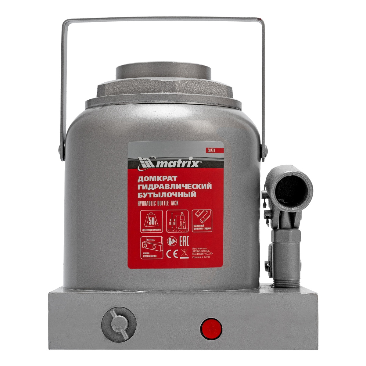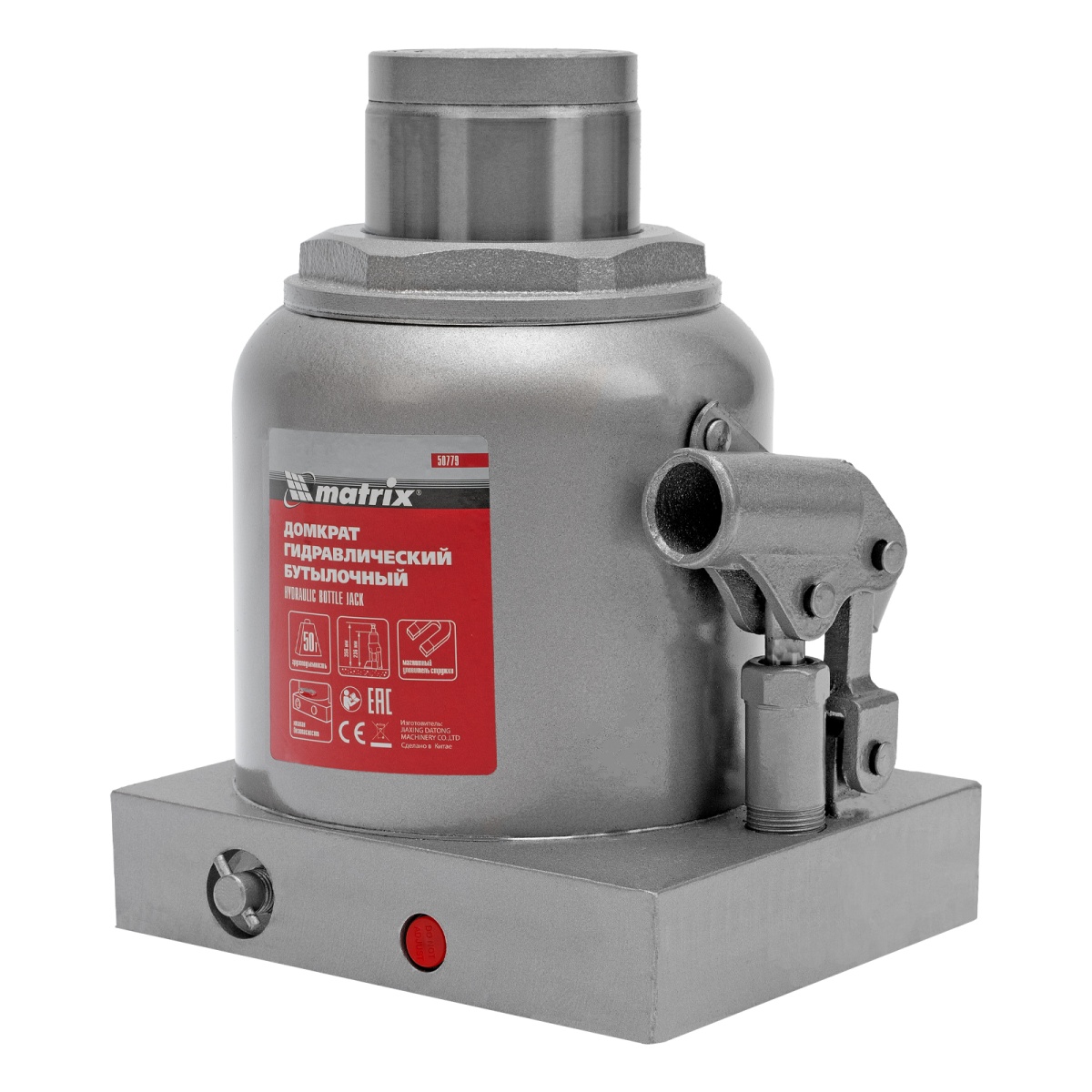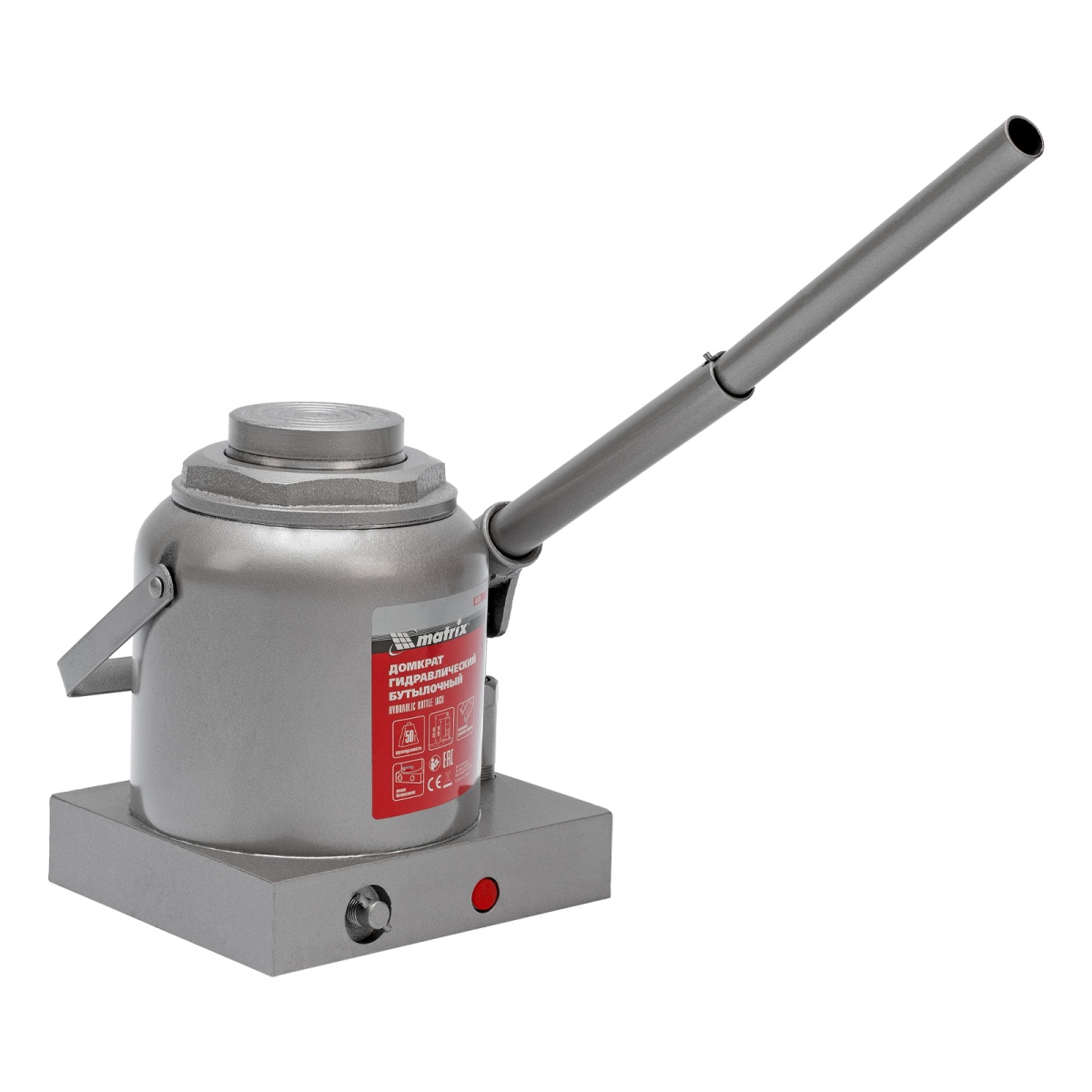 Гидравлический бутылочный домкрат Matrix 50779 быстро поднимает грузы весом до 50 т и может использоваться в гараже, на станциях ТО или небольших строительных площадках.