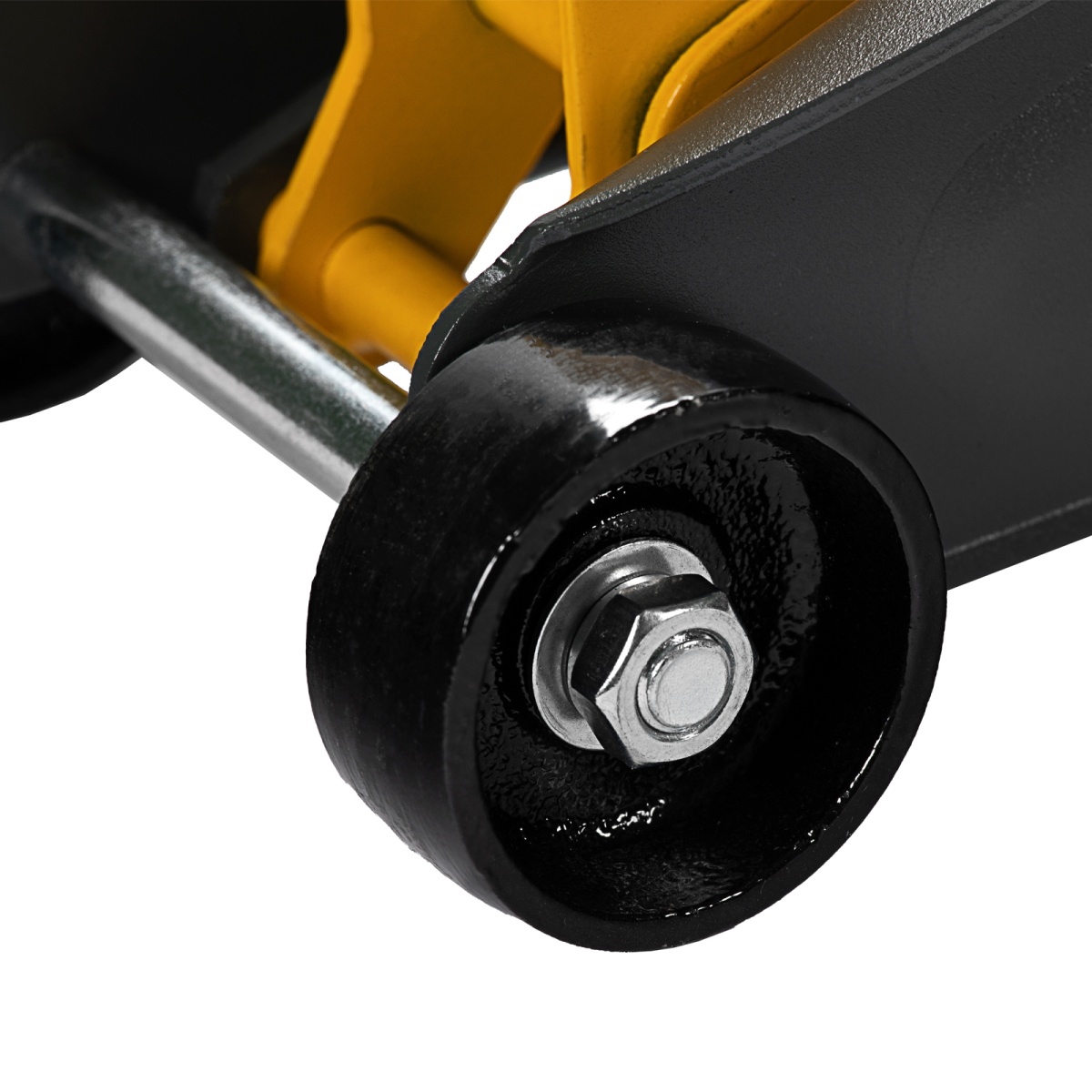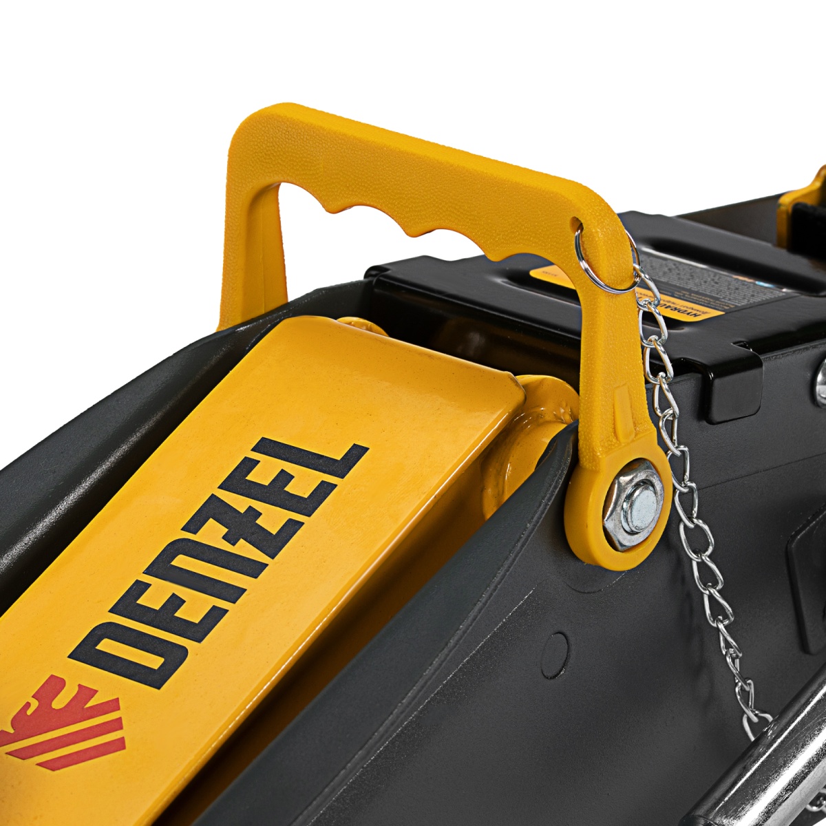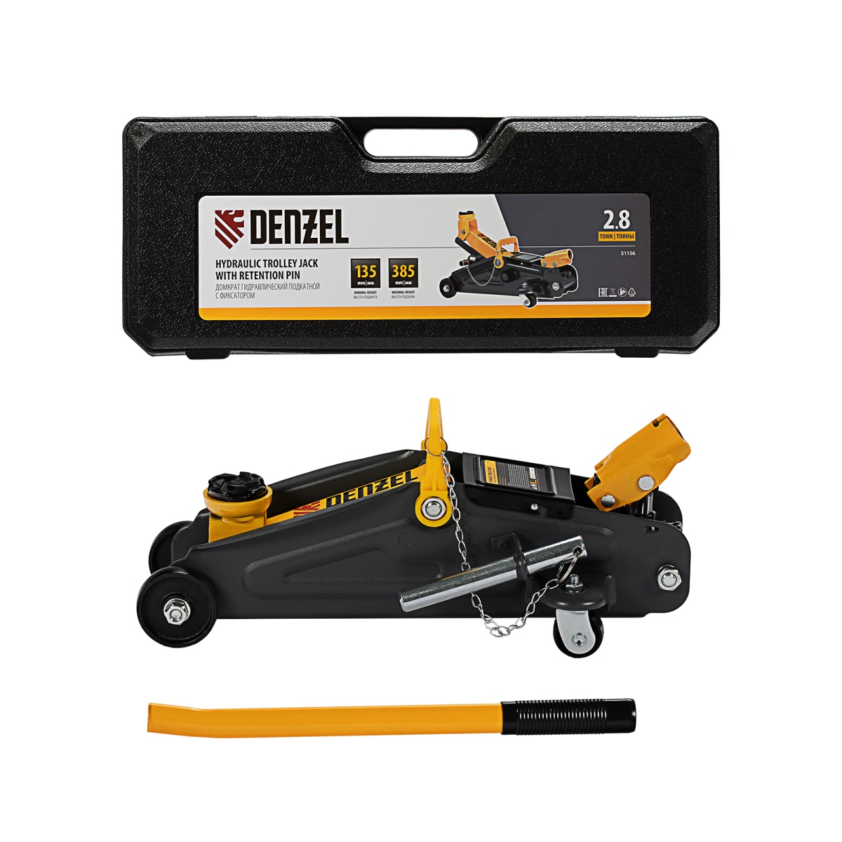 Гидравлический подкатной домкрат с фиксатором Denzel 51156, с высотой подхвата 135 мм, предназначен для плавного подъема грузов массой до 2,8 т на высоту до 385 мм.