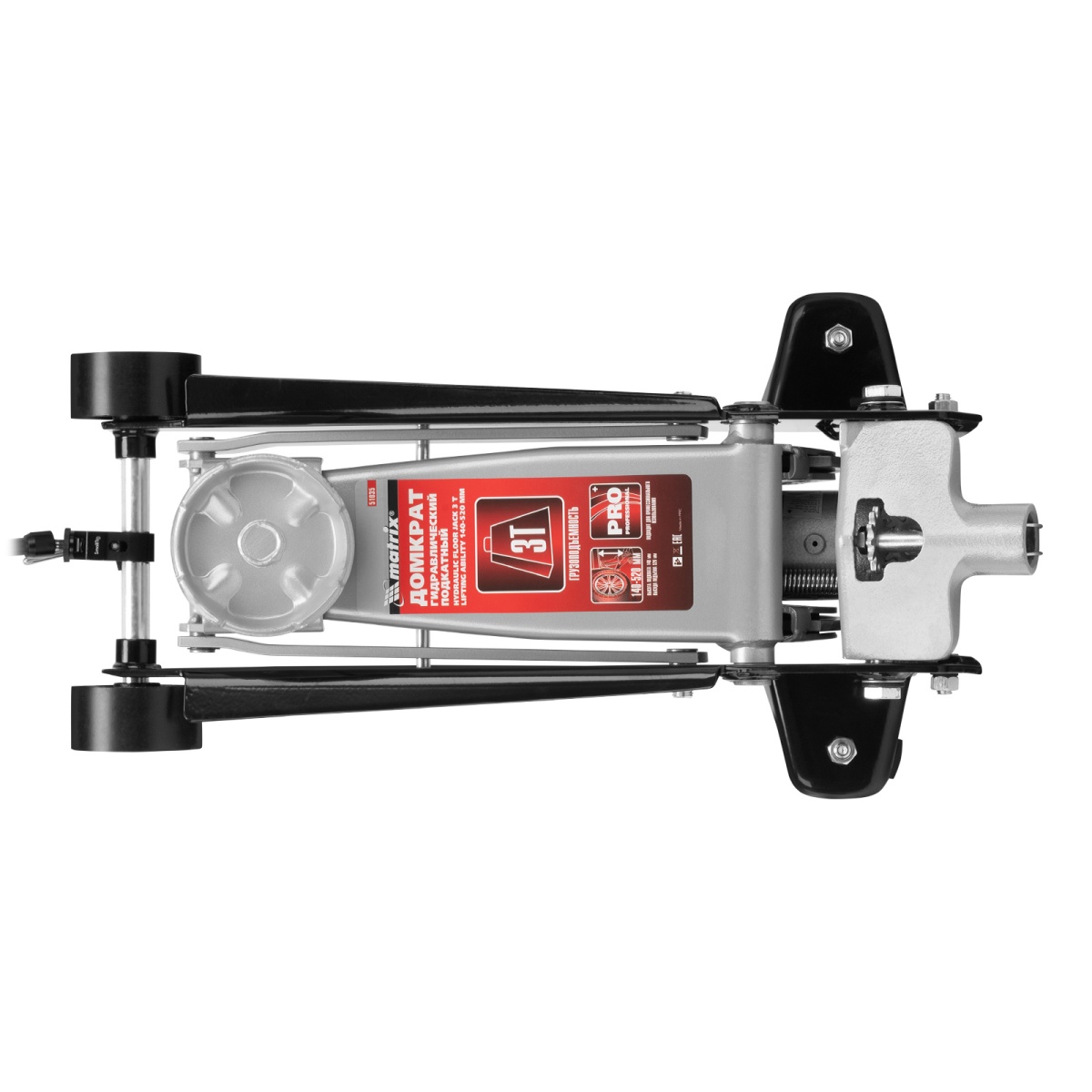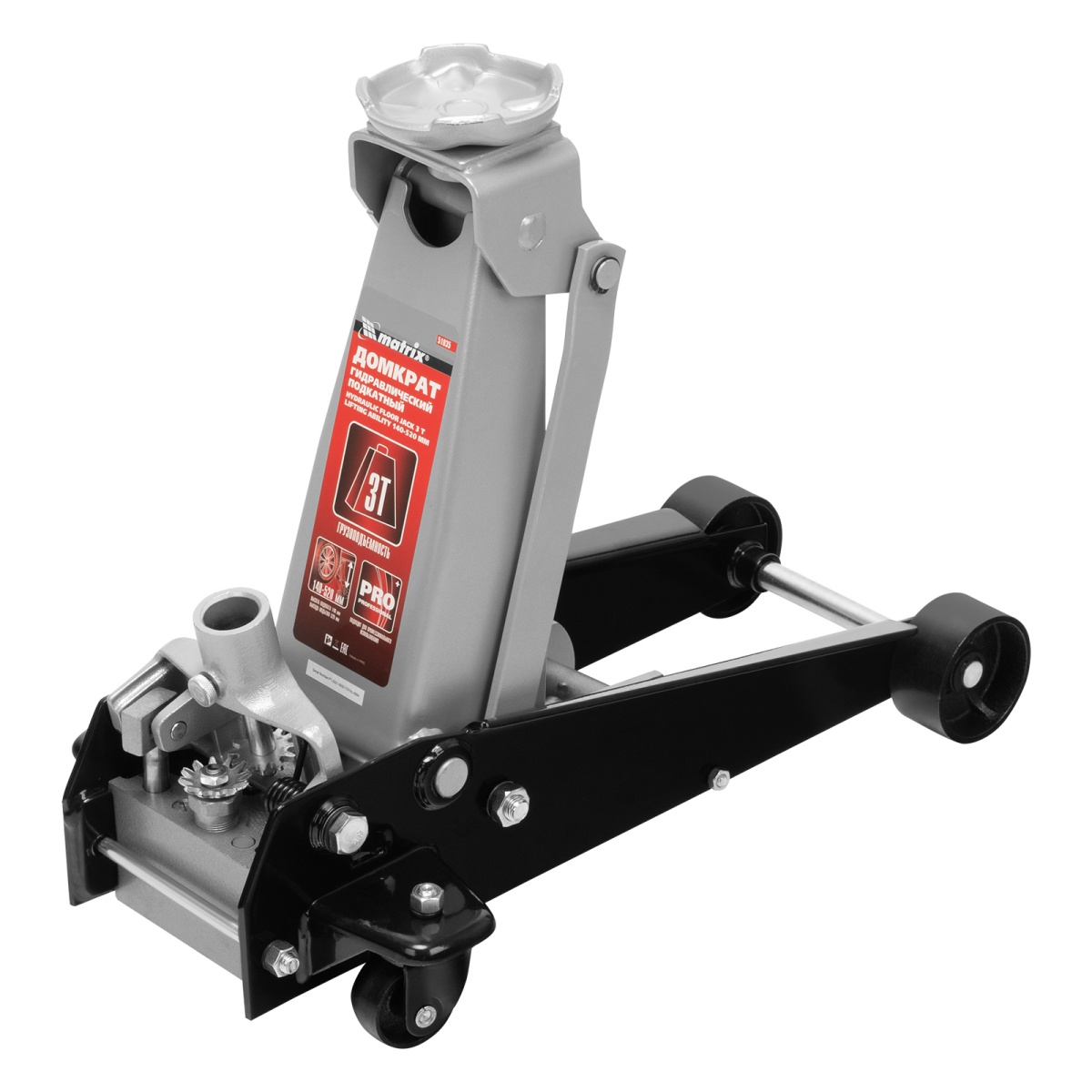 Подкатной гидравлический домкрат Matrix 51035 с высотой подхвата 140 мм, — полупрофессиональное гаражное оборудование, способное поднимать груз массой до 3 т на высоту до 520 мм.