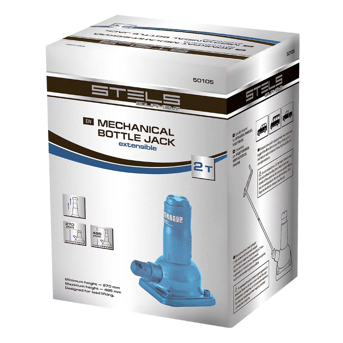 Механический бутылочный домкрат Stels 50105 состоит из 2-х частей: самого домкрата и ручки, имеет телескопический шток и используется для быстрого подъема грузов массой до 2 т на высоту 270-485 мм.