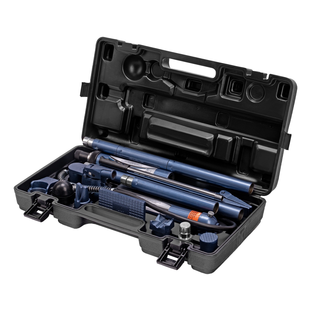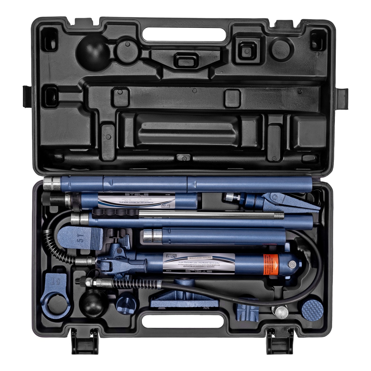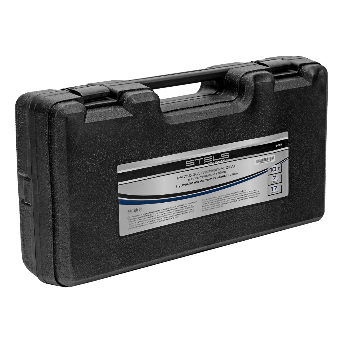 Гидравлическая растяжка Stels 51355, 10 т, — компактный набор в пластиковом кейсе, включающий 17 предметов — цилиндр, гидронасос, адаптер, удлинители, основание и 7 сменных насадок.