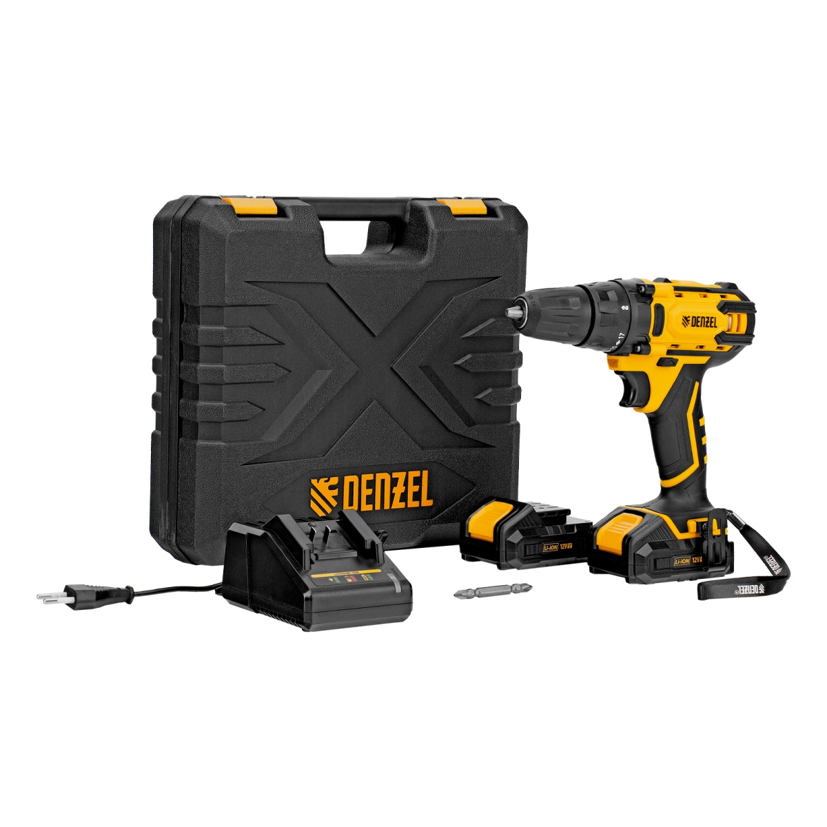 Аккумуляторная дрель-шуруповерт Denzel CDL-12-02BM 26105 с 2 батареями Li-Ion 12 В предназначена для монтажа и демонтажа резьбовых соединений, cверления отверстий в металле (до 10 мм), древесине (до 16 мм), пластмассе и других материалах. Инструмент пригодится профессионалам и любителям на строительной площадке, дома или на даче.Надежные литий-ионные аккумуляторы без эффекта памяти и защитой от глубокого разряда обеспечивают долгий срок службы инструмента. Дрель не зависит от сети питания, что делает удобной работу на строительных объектах, на высоте и в отдаленных участках дома.Преимущества17+1 ступень регулировки крутящего момента — вы с легкостью подберете оптимальное усилие затяжки под тип крепежа.Два режима вращения — можно настроить скорость в диапазоне 0-400 или 0-1450 об/мин для работы с резьбовыми крепежами и сверления отверстий.Мгновенное переключение между задачами — реверс позволяет быстро перейти от монтажа к демонтажу крепежных элементов.Подсветка рабочей зоны — решать поставленные задачи удобно даже в условиях плохой освещенности и в труднодоступных местах.Защита от перетягивания крепежа — благодаря тормозу выбега шпиндель моментально останавливается после выключения.Высокий ресурс — корпус из ударопрочного пластика и металлические шестерни редуктора обеспечивают долгий срок службы инструмента.Бесперебойная работа — в комплект поставки входит зарядное устройство и 2 аккумулятора с индикацией уровня заряда.Быстрая и безопасная зарядка — на восстановление работоспособности аккумулятора требуется всего 1 час, о завершении процесса свидетельствует зеленый цвет индикатора на зарядном устройстве.Быстрая смена оснастки — блокировка шпинделя и одномуфтовый патрон позволяют снимать и устанавливать биты и сверла одной рукой.Дополнительные возможности — инструмент можно закрепить на ремне или кармане при помощи специального крюка.Комфортная работа — прорезиненная рукоятка обеспечивает надежный хват и поглощает вибрации, снижая нагрузку на руки мастера.Удобное хранение и транспортировка — дрель-шуруповерт поставляется в надежном пластиковом кейсе.Гарантия 3 года — качество инструмента подтверждено производителем.