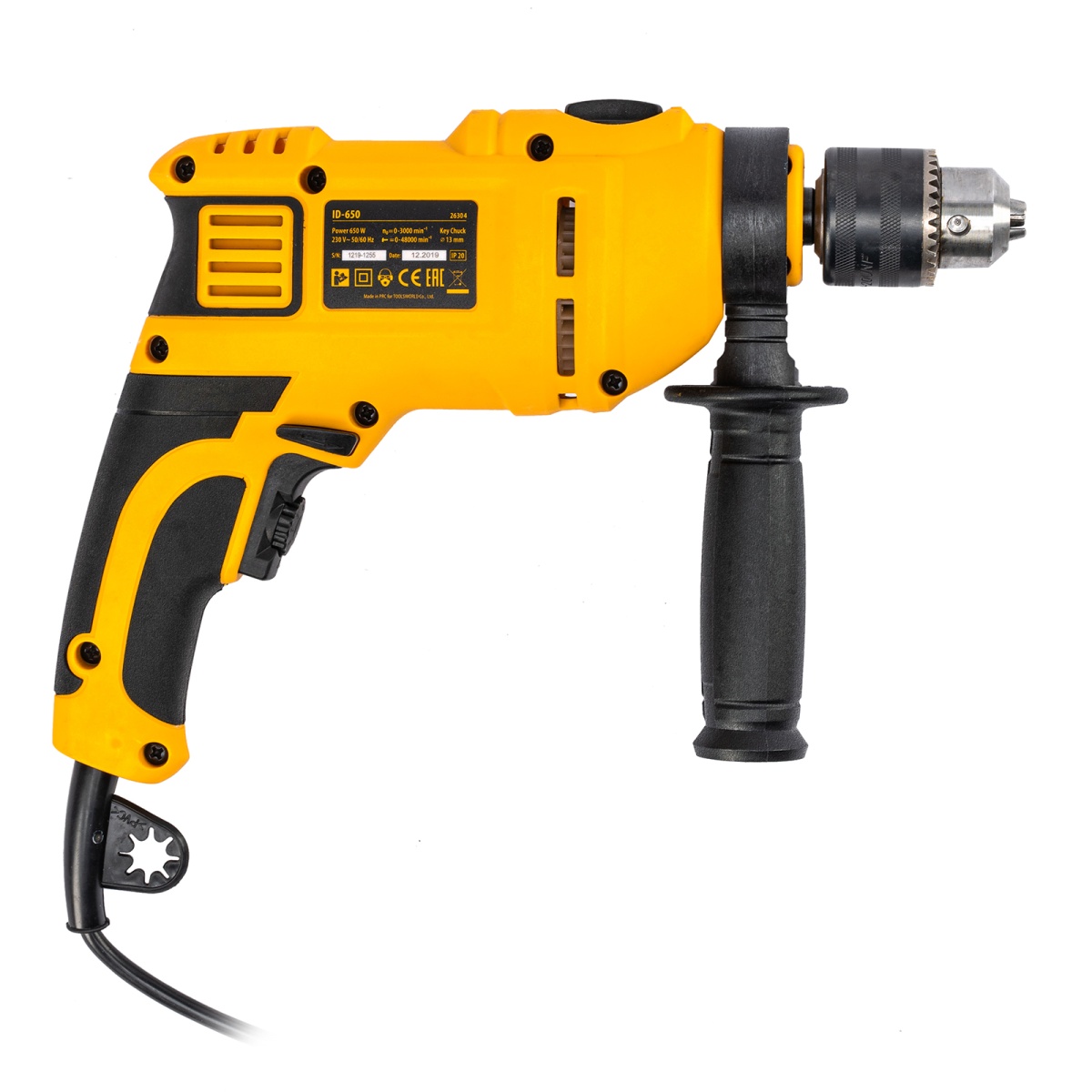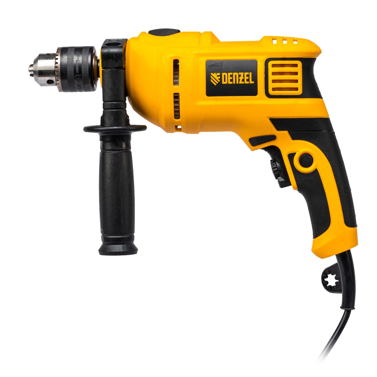 Ударная дрель Denzel ID-650 26304 мощностью 650 Вт поддерживает скорость вращения оснастки 0-3000 об/мин и частоту ударов 48000 уд/мин. Используется для ручного или ударного сверления металла, древесины, легкого бетона, кирпича, плитки или пластика. Сверлит отверстия диаметром до 25 мм в древесине, до 13 мм в бетоне и до 13 мм в металле. Эффективное сверление твердых материалов обеспечивает массивный промщит ударного механизма. Дрель работает со сверлами с диаметром хвостовика 1,5-13 мм, что позволяет эффективно решать различные задачи.ПреимуществаВыбор оптимального режима — предусмотрена плавная регулировка частоты вращения патрона и возможность отключения ударного режима для работы с материалами разной плотности.Высокий ресурс — медная обмотка двигателя, усовершенствованная конструкция щеточного узла и прочный пластиковый корпус выдерживают интенсивное использование.Безопасность пользователя — токопроводящие элементы имеют двойную изоляциюРеверс — можно изменять направление вращения патрона для использования левосторонних сверл или шлифовальной оснастки.Удобное использование — клавиша фиксации кнопки включения позволяет избежать самопроизвольного переключения частоты вращения.Надежная фиксация оснастки — трехкулачковый самоцентрирующийся патрон затягивается с помощью ключа.Сверление отверстий заданной глубины — предусмотрена возможность установки специального ограничителя.Держатель для ключа — аксессуар не потеряется во время работы и хранения.Защита от перегрева — вентиляционные отверстия на корпусе обеспечивают эффективный отвод тепла.Свободное перемещение по рабочей зоне — длина кабеля питания составляет 3 м.Комфортная работа — основная и боковая рукоятки не выскальзывают из рук, дрель весит 1,85 кг, что позволяет долго работать без ощущения усталости.Удобное хранение и транспортировка — дрель поставляется в прочном кейсе.Гарантия 3 года — надежность инструмента подтверждена производителем.