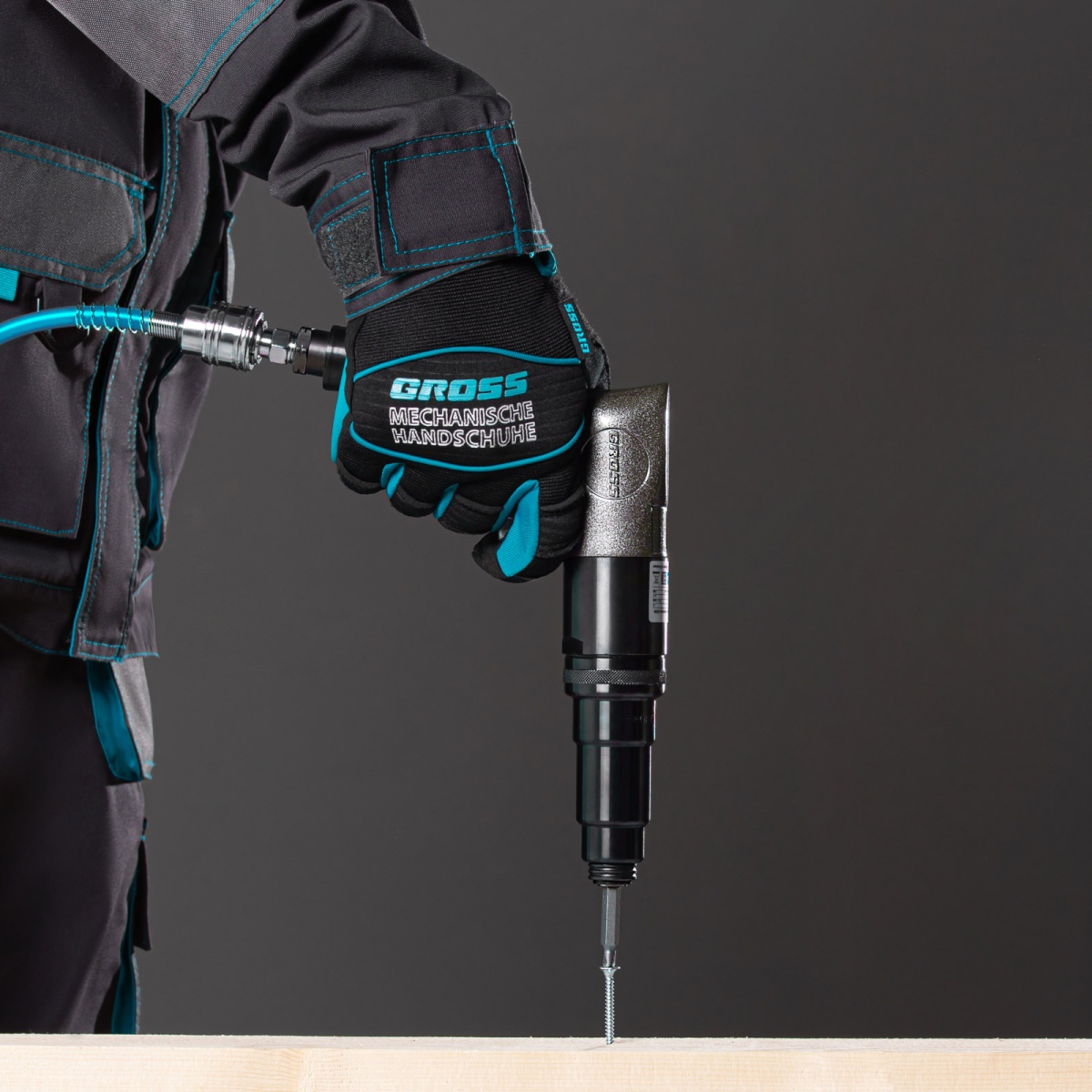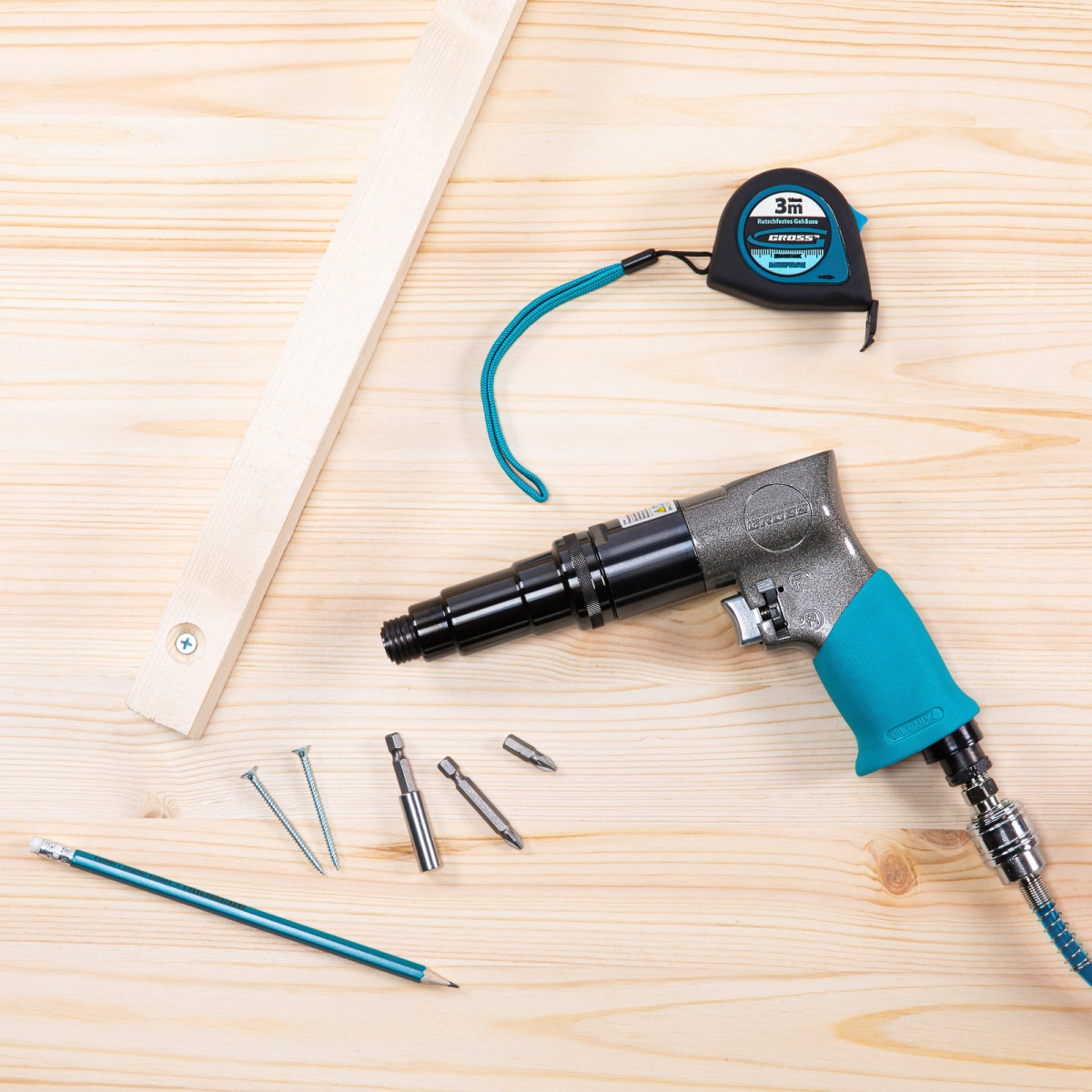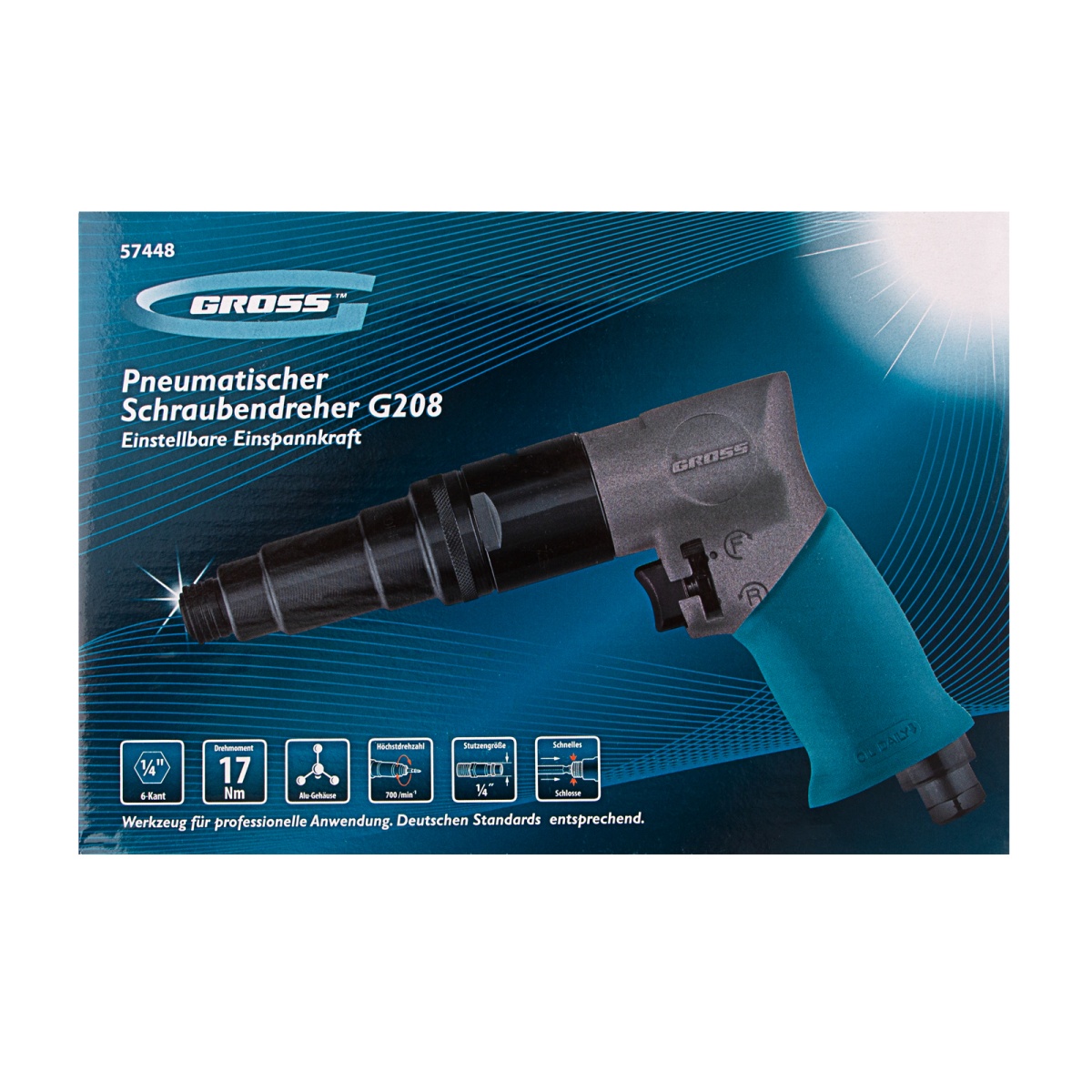 Пневматический шуруповерт Gross G208 57448 с присоединительным размером 1/4″, максимальным крутящим моментом 17 Нм и скоростью вращения шпинделя 700 об/мин, используется для демонтажа старых крепежей и вкручивания новых.