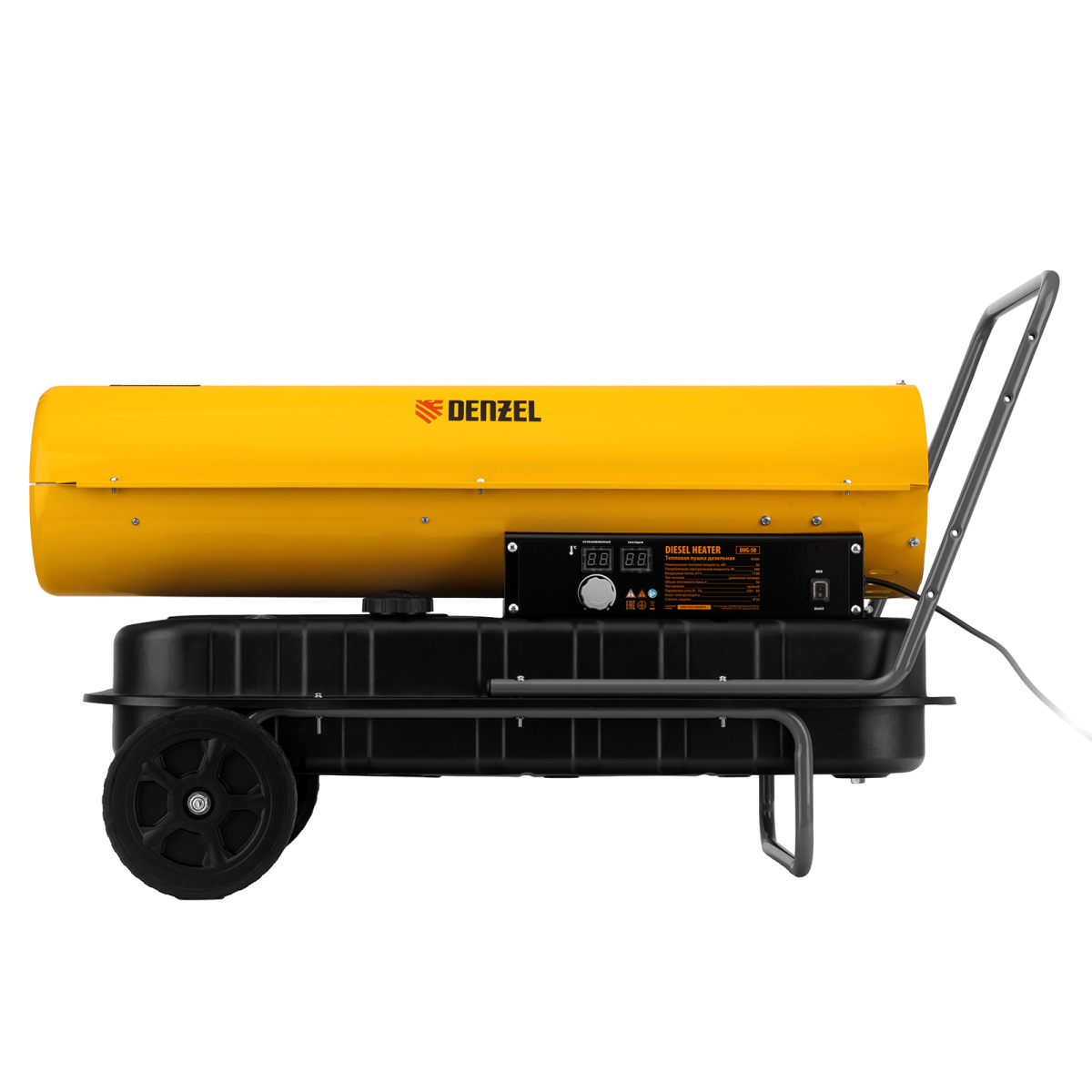 Дизельная тепловая пушка Denzel DHG-50 96486 мощностью 50 кВт и производительностью 1100 куб. м/ч предназначена для прямого нагрева воздуха в цехах, ангарах, хранилищах и других нежилых помещениях с хорошей вентиляцией. Максимальная площадь обогрева составляет 500 кв. м. Пушка служит эффективным источником тепла в полярных экспедициях. Пригодится также на строительной площадке для прогрева бетона, просушки стен и разморозки траншей. Для заправки может использоваться любое дизельное топливо: летнее, зимнее и арктическое.
