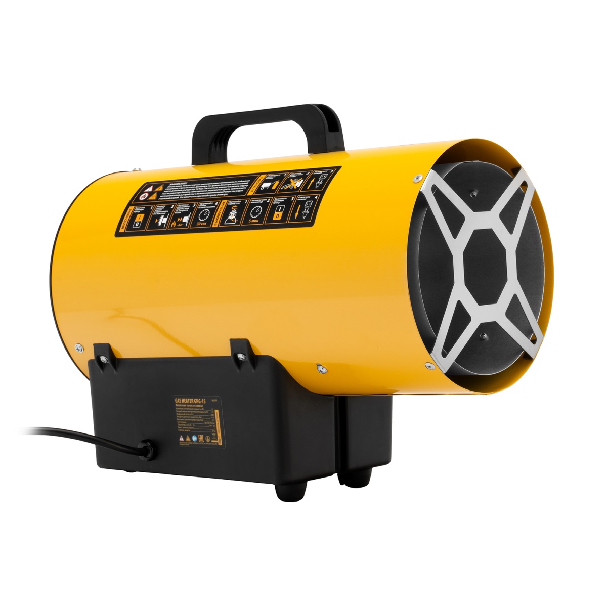 Газовая тепловая пушка Denzel GHG-15 96477 мощностью 15 кВт работает на смеси пропан-бутан и выдает тепловой поток со скоростью 500 куб. м/ч. Используется для обогрева складов, цехов, гаражей, теплиц и других нежилых помещений площадью до 150 кв. м. Будет полезна на строительных площадках и в производственных помещениях, а также для монтажа натяжных потолков.