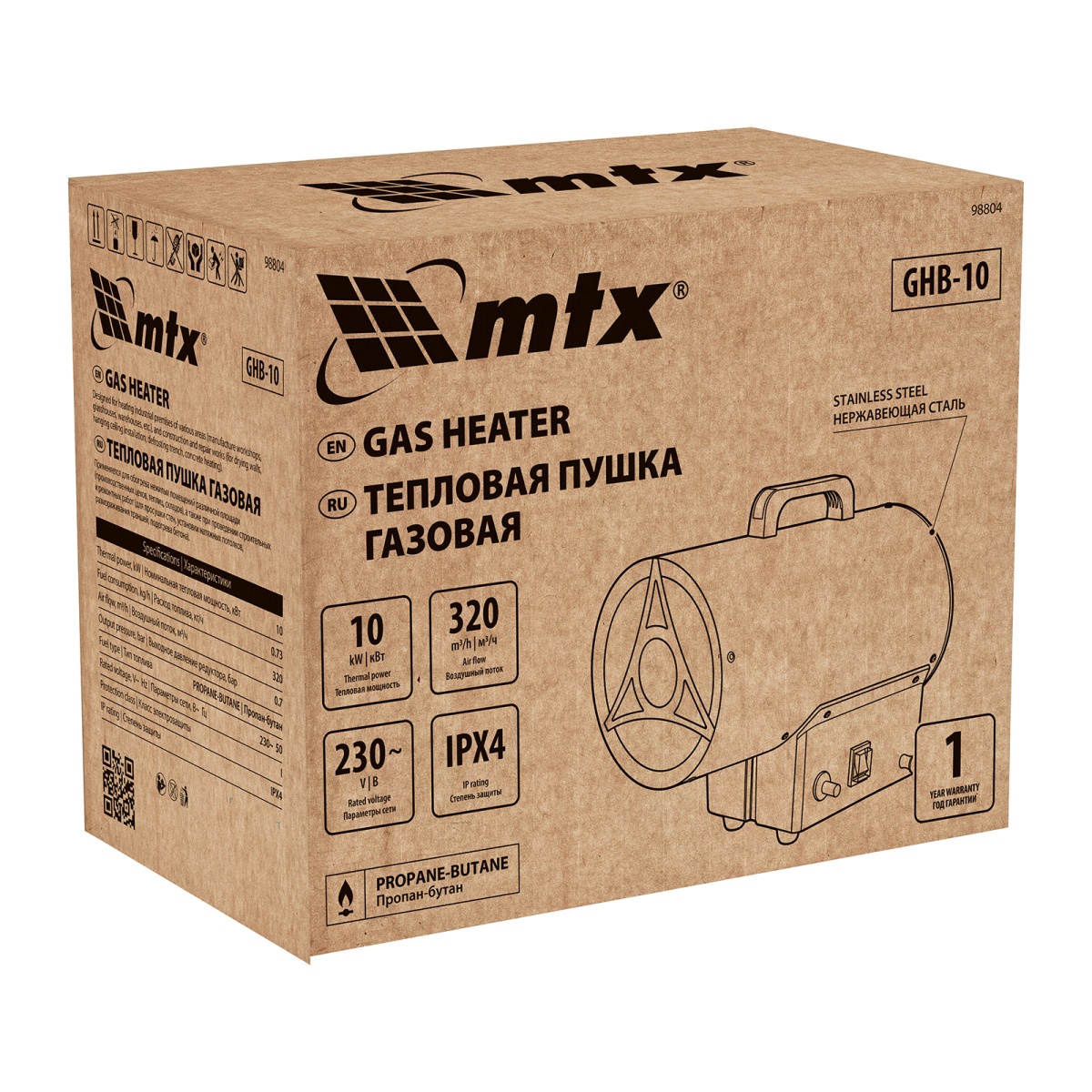 Газовая тепловая пушка MTX GHB-10 98804 номинальной тепловой мощностью 10 кВт работает на смеси пропан-бутан и генерирует поток теплого воздуха объемом 320 м3/ч. Используется для обогрева цехов, складов, теплиц и других нежилых помещений. Также будет полезна во время установки натяжных потолков. С помощью пушки можно быстро просушить стены, разморозить траншею, подогреть бетон. Газовая тепловая пушка незаменима на строительной площадке, пригодится во время проведения ремонтных работ.