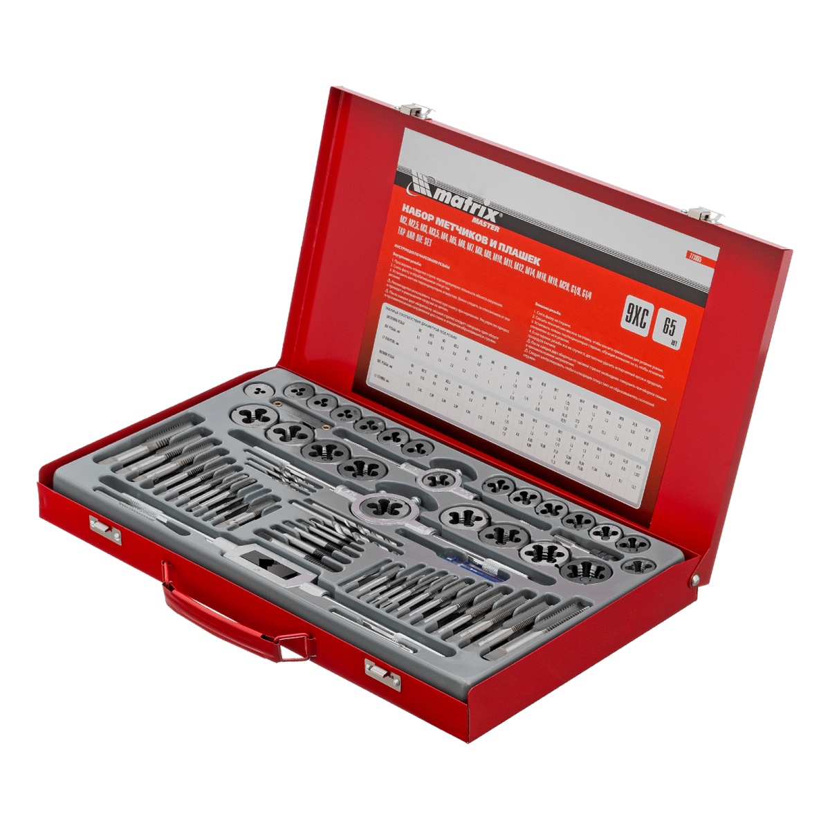 - В набор входит резьбомер, позволяющий оценить соответствие полученной резьбы заданным параметрам. На метчиках и плашках указаны шаг и размер резьбы, что облегчает подбор нужного инструмента.