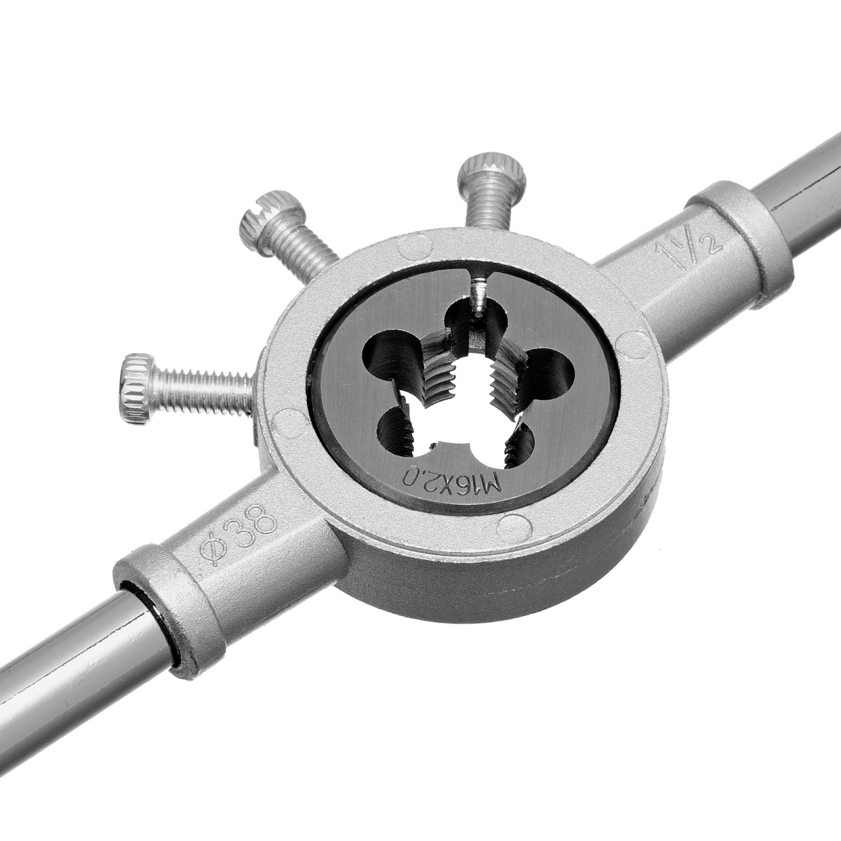- Боковые винты плашкодержателей надежно фиксируют плашки, что обеспечивает точность нарезаемой резьбы. На калибрующей части плашек увеличено число зубьев, что повышает качество работ.