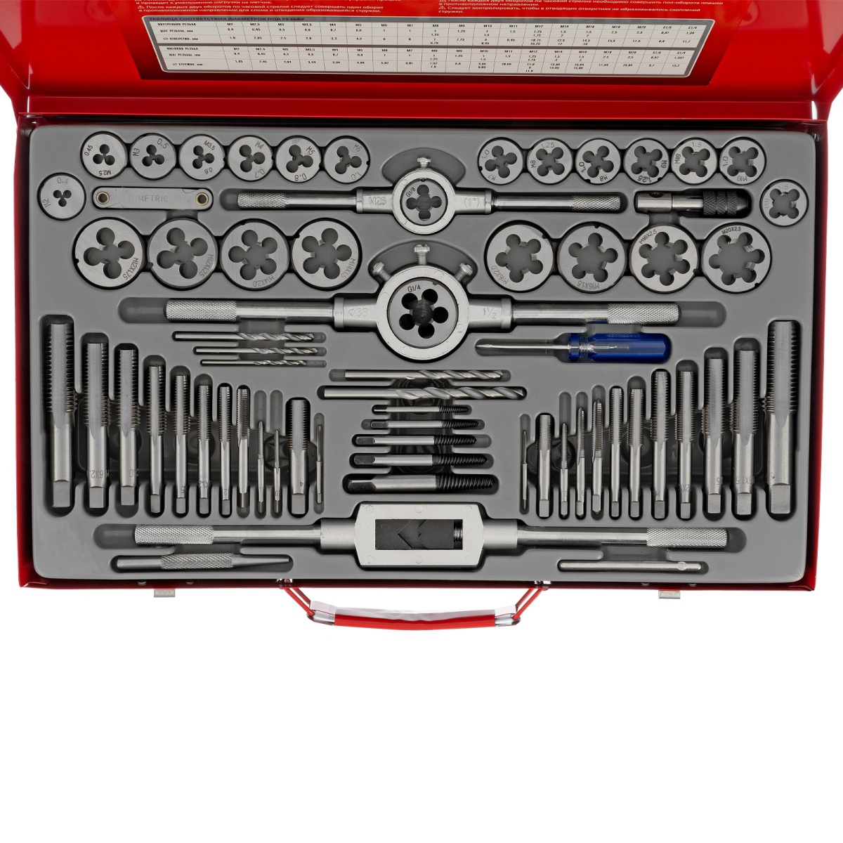 Входящие в комплект инструменты используются для создания внутренней и внешней резьбы различного диаметра и шага. Отвертки служат для монтажа и демонтажа резьбовых соединений, а экстракторы — для извлечения сломавшихся болтов и шпилек. Набор предназначен для проведения слесарных работ, будет полезен при ремонте автомобилей.