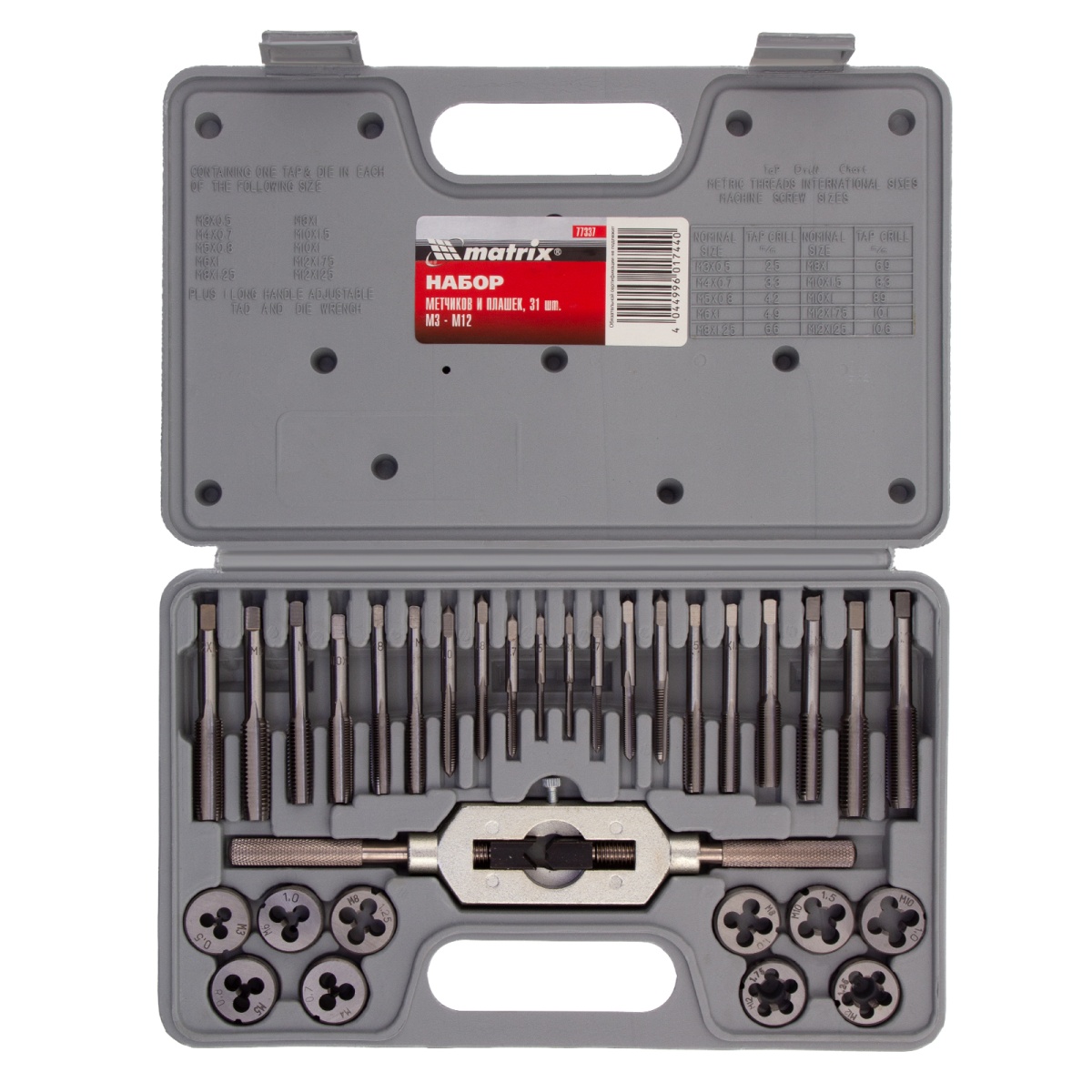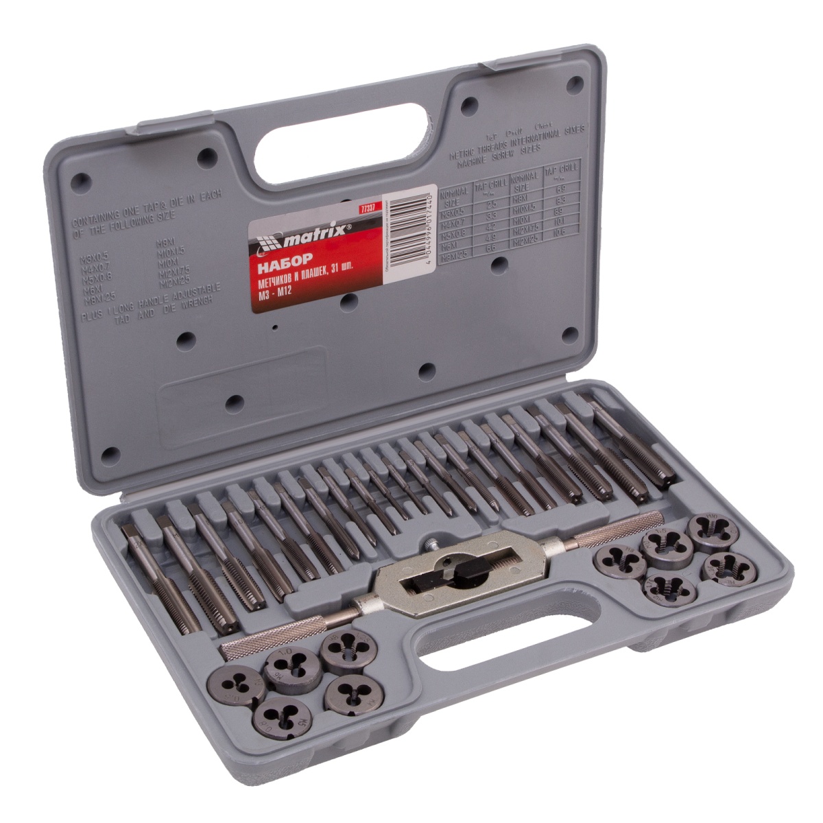 Набор метчиков и плашек М3-М12 Matrix 77337 применяется для восстановления сорванной резьбы. Все инструменты хранятся в удобном пластиковом боксе. Набор предназначен для ремонтных работ, используется в профессиональной и бытовой сфере.
