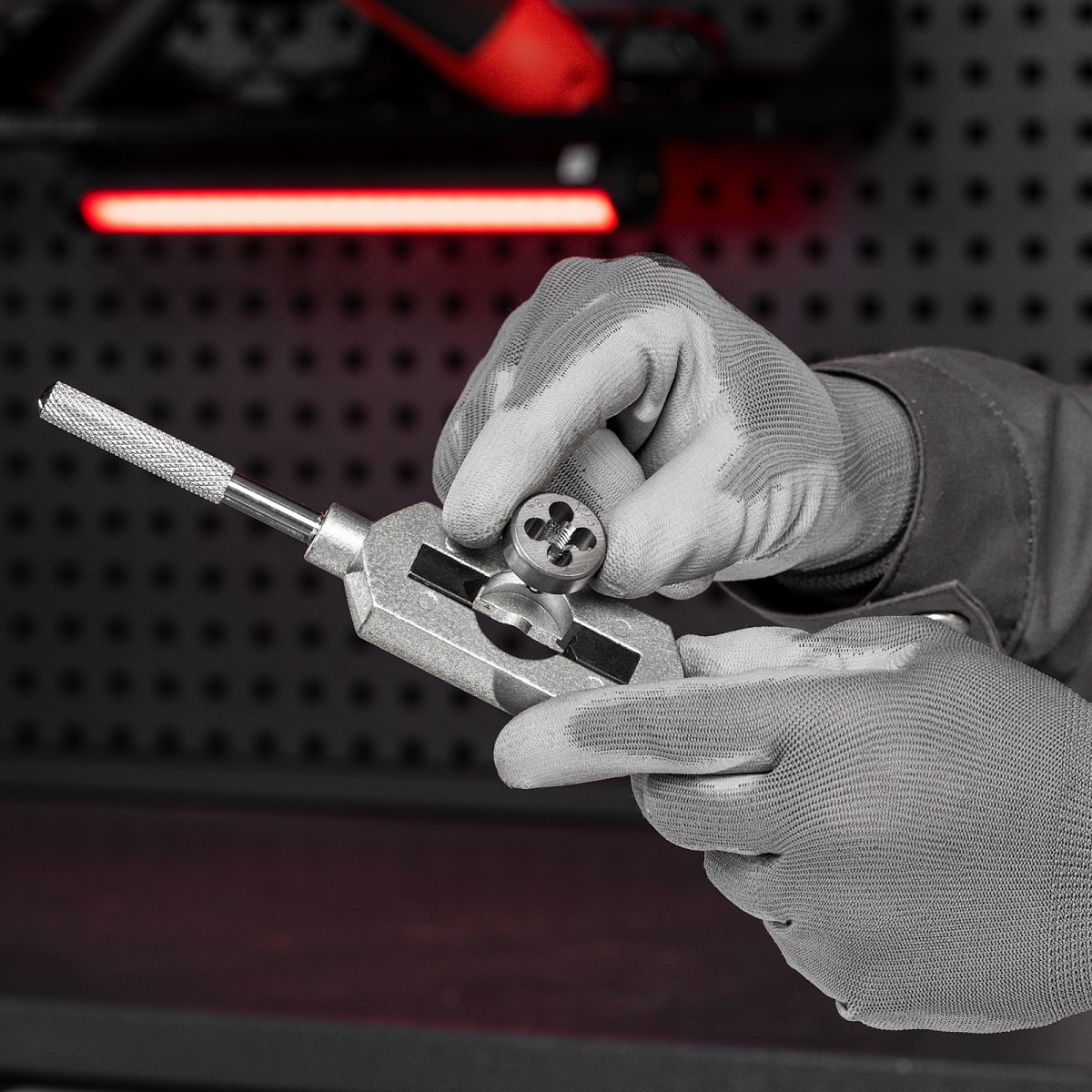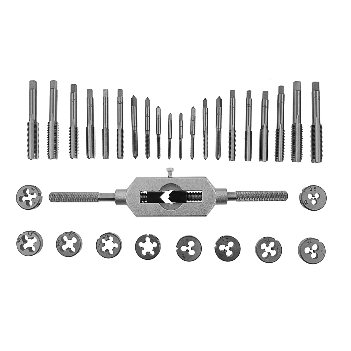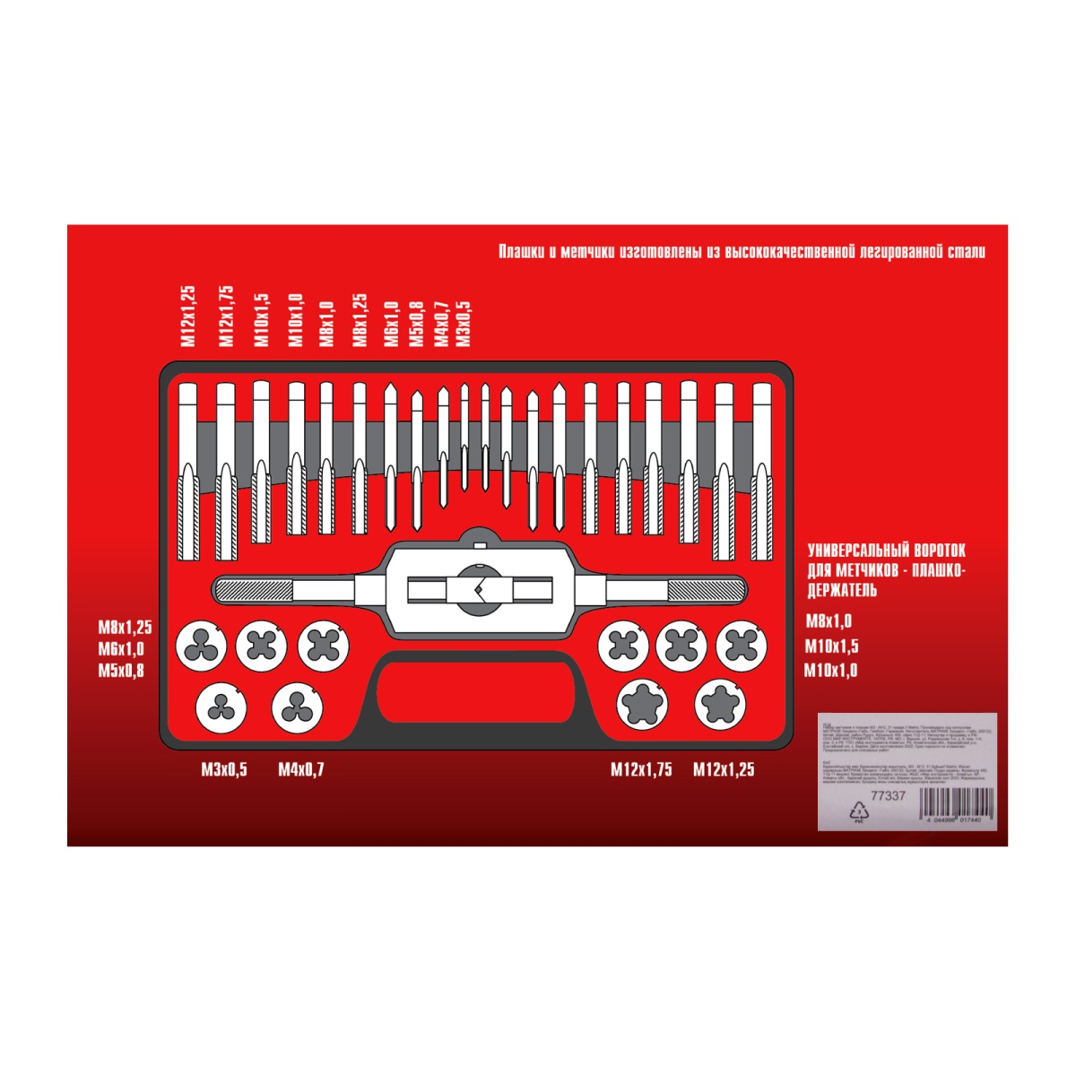 - Материал плашек и метчиков — высокоуглеродистая легированная сталь 9ХС, поэтому они прочные и износостойкие.Твердость режущих частей составляет 59-62 HRC, поэтому они долго сохраняют рабочие свойства и подходят для длительного использования.В комплекте имеются метчики первого и второго номеров, обеспечивающие высокое качество работ.Комбинированный плашко- и метчикодержатель надежно удерживает режущий инструмент, с которым можно работать при значительных усилиях.Увеличенное число зубцов на калибрующей части плашек повышает качество резьбы.Каждая позиция имеет маркировку с указанием размера и шага резьбы, что упрощает поиск нужного инструмента.
