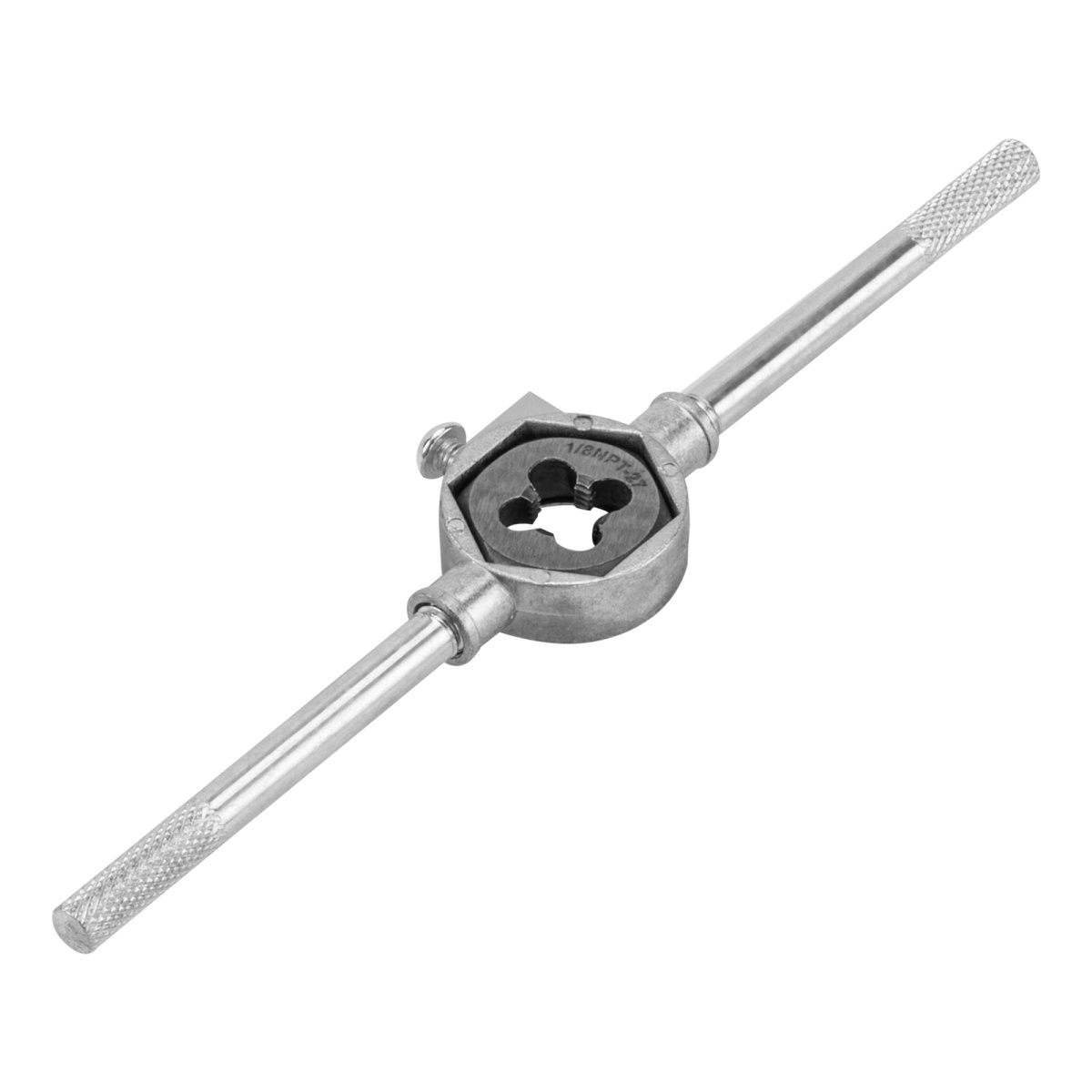 - Плашка закрепляется в держателе при помощи бокового винта, поэтому не проворачивается и ровно нарезает резьбу.