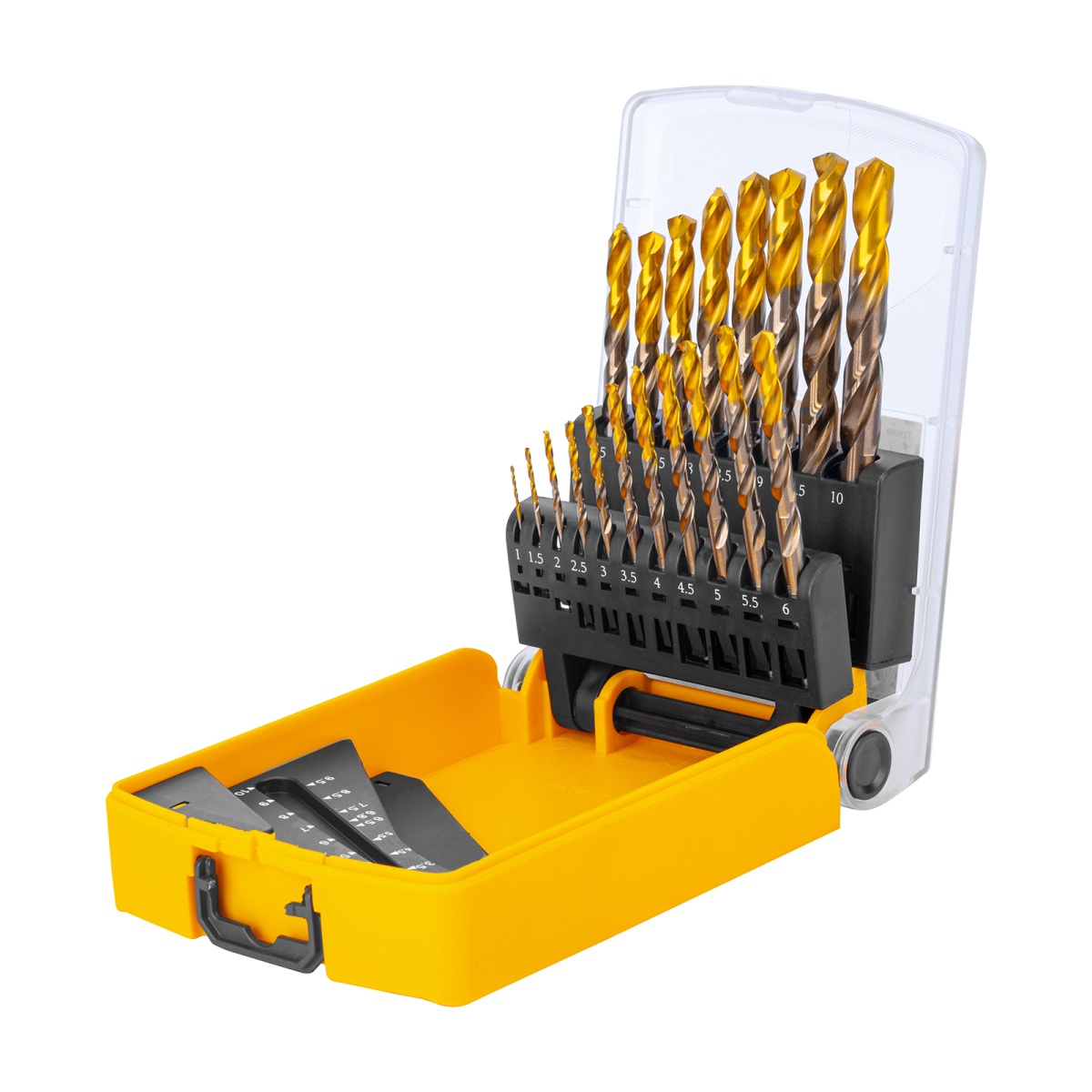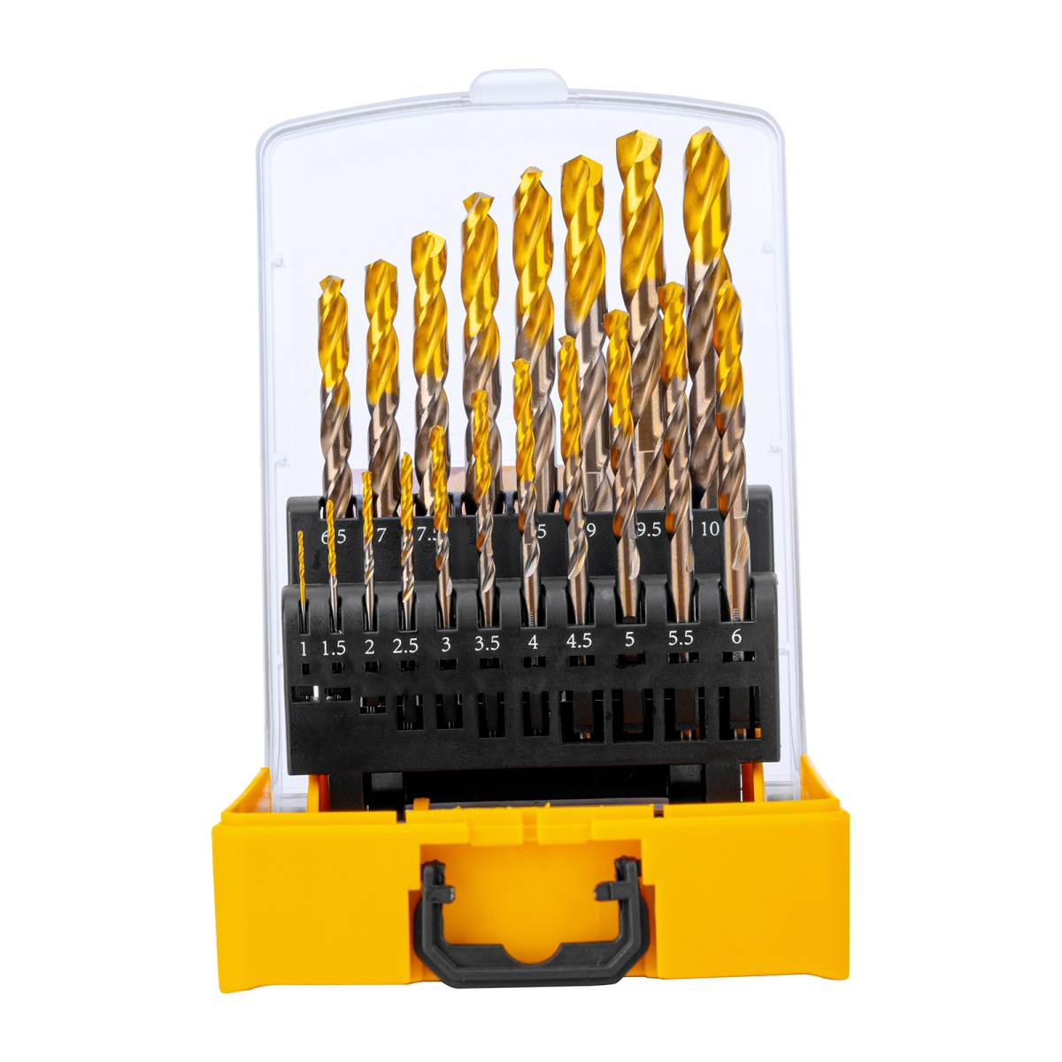 Набор Denzel Golden Tip 723008 состоит из 19 сверл по металлу диаметром 1-10 мм, изготовленных из стали P6M5K8. Угол заточки составляет 135°, что позволяет получать чистые и ровные отверстия в закаленной и нержавеющей стали, цветных и черных металлах, а также жестком пластике. Сверлам присвоен класс точности A1, что гарантирует высокое качество выполняемых работ. Оснастка характеризуется пониженным коэффициентом трения, что облегчает сверление и улучшает отвод стружки. Набор будет полезен дома и в мастерской.
