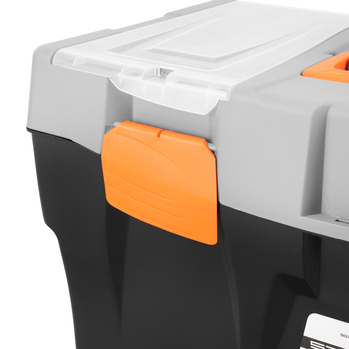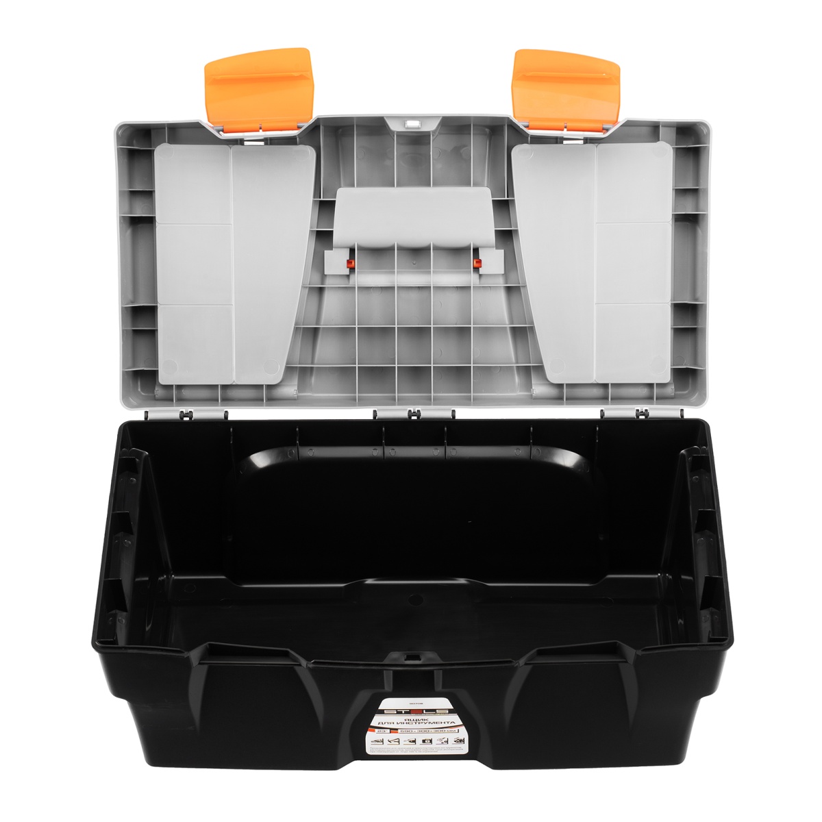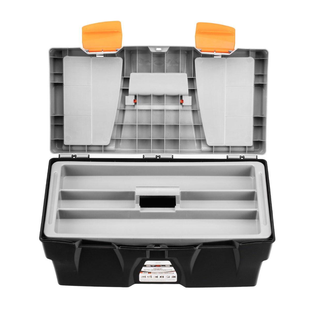 Ящик для инструмента Stels 90706, 23 дюймов, габаритами 590 х 300 х 300 мм, из пластика, предназначен для переноски и хранения инструментов, хозяйственных мелочей, рыболовных снастей. Содержимое не рассыпется, поскольку он надежно закрывается. Встроенные в крышку отделения обеспечивают быстрый доступ к крепежам и другим необходимым предметам. Большой ящик для хранения инструментов будет полезен дома, на даче, в гараже и на рыбалке.ПреимуществаЯщик выполнен из прочного и легкого пластика, рассчитан на долгий срок службы.На крышке предусмотрена ручка, облегчающая транспортировку контейнера.В ящике имеется съемный лоток, что позволяет удобно расположить инструменты разного размера, а также крепежи и мелкие детали.