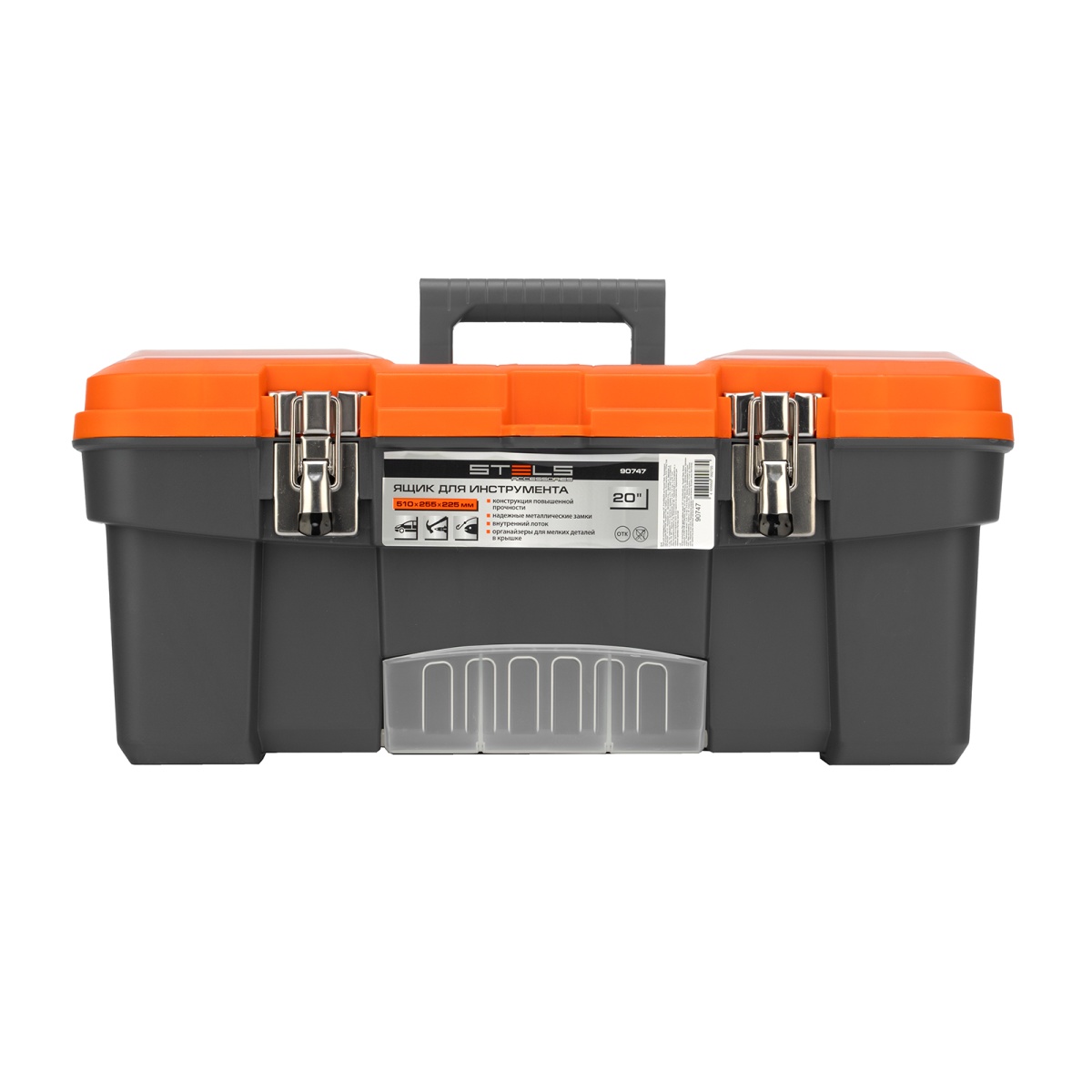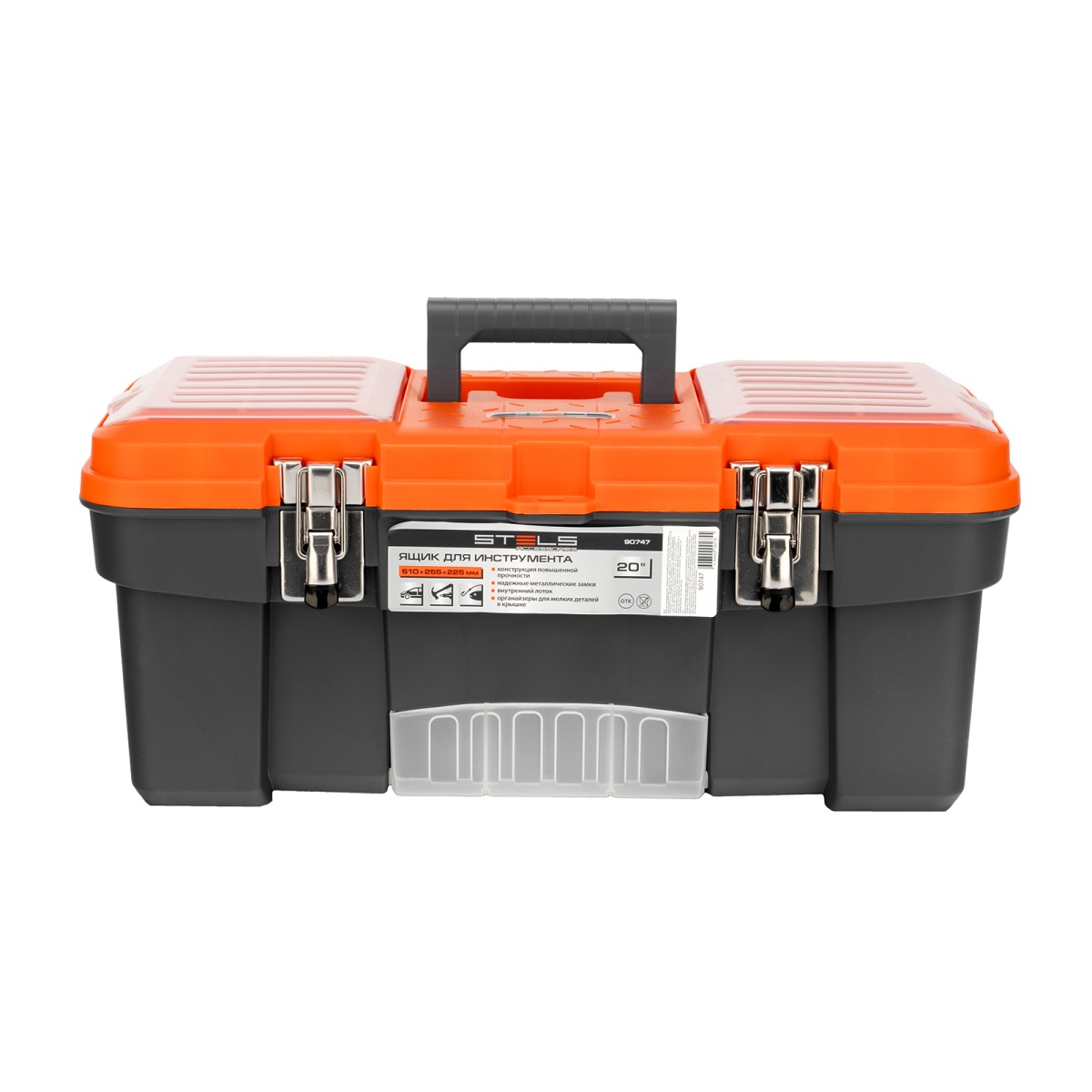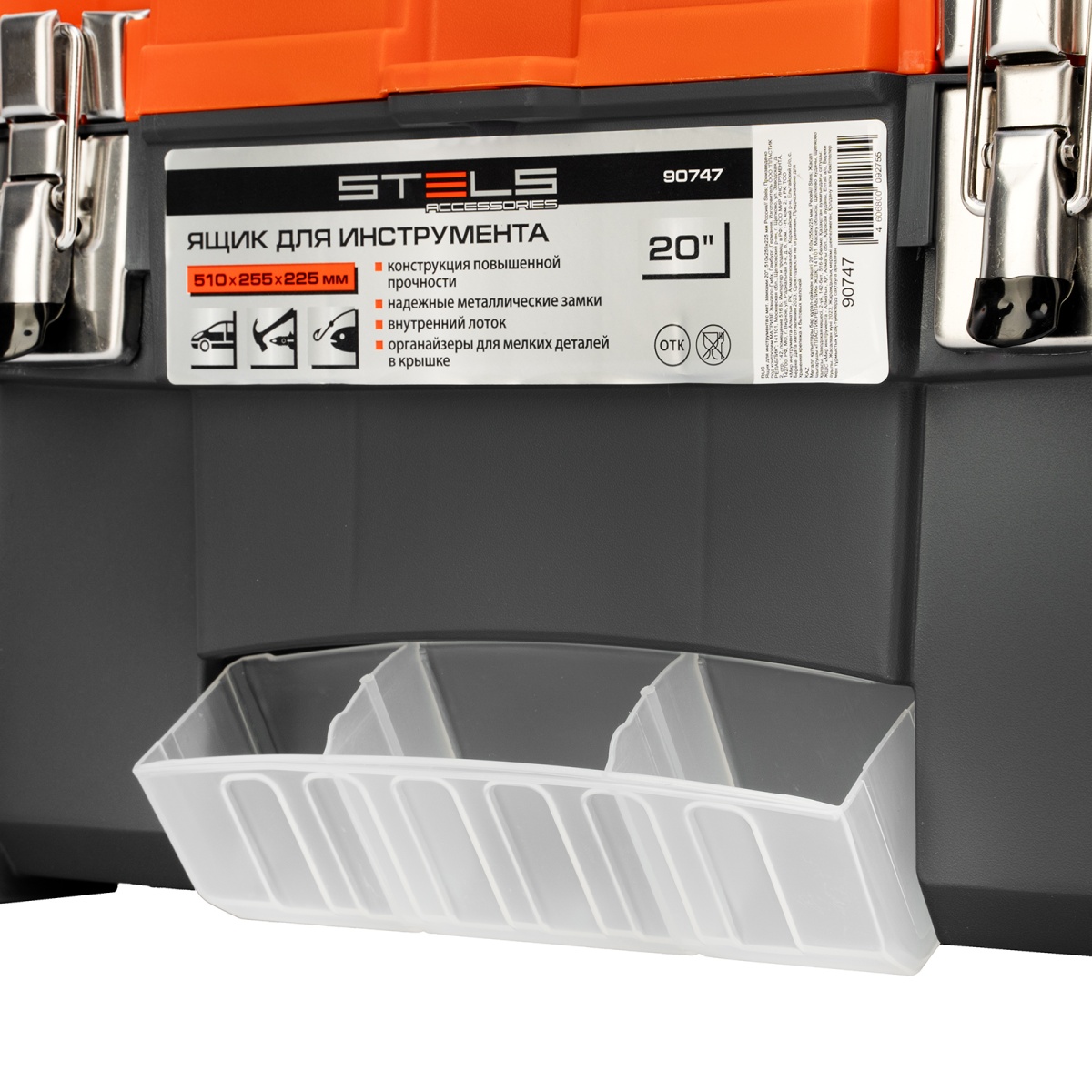 Ящик для инструмента с металлическими замками Stels 90747, 20 дюймов, 510 х 255 х 225 мм, — альтернатива коробке для инструментов. В нем можно расположить ручной инструмент, крепежи, хозяйственные мелочи, а также рыболовные снасти. В крышке имеются встроенные органайзеры, на дне - выкидной лоток с отсеками для мелких деталей, что увеличивает функциональность ящика. Его удобно брать в поездки, также ящик пригодится дома, на даче или в гараже.ПреимуществаЯщик рассчитан на значительные нагрузки, поэтому в него можно положить много инструментов и расходников.Благодаря замку из металла ящик надежно защищен от самопроизвольного открывания.Съемный лоток с ручкой позволяет рационально организовать пространство внутри контейнера для хранения инструментов.