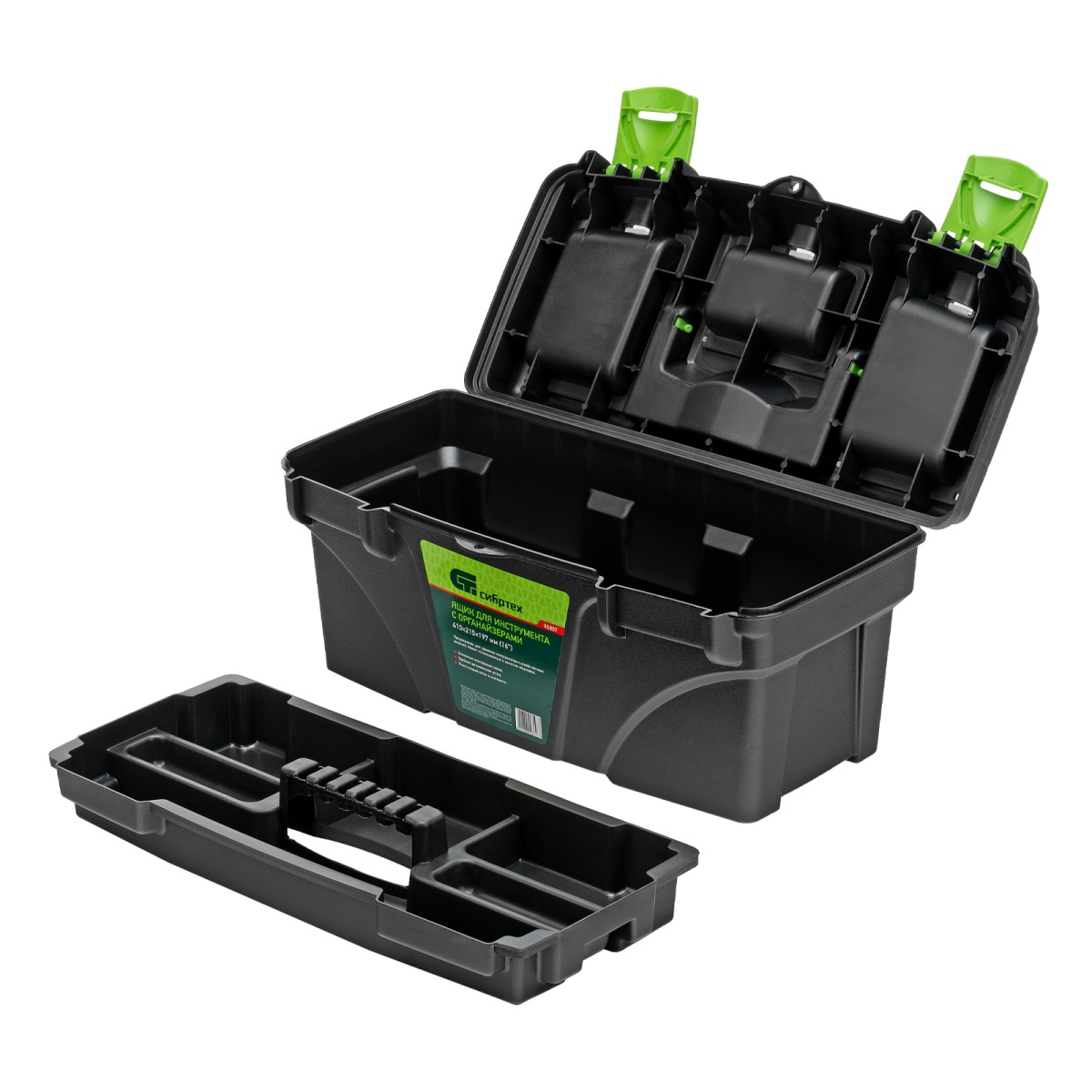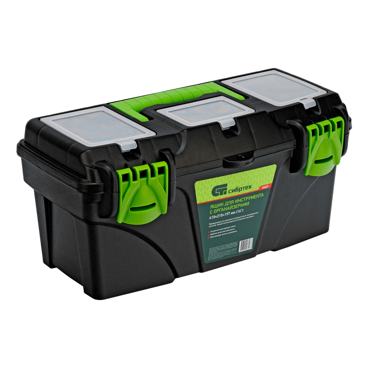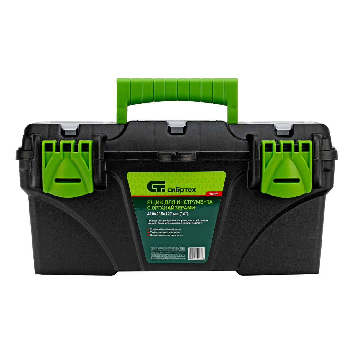 Ящик Сибртех 90807, 16 дюймов, с органайзерами, используется для хранения и транспортировки инструментов, оснастки, крепежей, хозяйственных мелочей и других предметов. Крышка и замок усилены трехрядными петлями, поэтому он выдерживает вес содержимого до 30 кг. Ящик можно брать в поездку, также он пригодится дома, на даче или в гараже.ПреимуществаВ крышке предусмотрены органайзеры, в которых можно рассортировать крепежи и другие мелкие детали.Съемный лоток с ручкой позволяет оптимизировать пространство внутри ящика.Удобная ручка облегчает транспортировку даже максимально заполненного ящика.Ручка утапливается в крышке, поэтому при необходимости ящик может служить подставкой.
