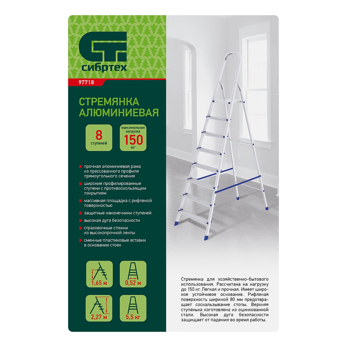 Стремянка Сибртех 8 ступеней с прочной алюминиевой рамой из прессованного профиля прямоугольного сечения.