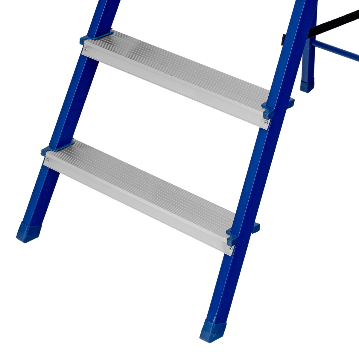 Прочная стальная рама прямоугольного сечения.Защитное покрытие стального профиля эмалью - цвет антрацит.Широкие профилированные ступени для длительной работы на высоте с противоскользящим рифлением.Устойчивая конструкция и надежная фиксация в рабочем положении.Высокая дуга безопасности, стальная рабочая площадка.Прочная страховочная лента для безопасной работы на большой высоте.Пластиковые рифленые наконечники на основании опорных направляющих предотвращают скольжение на рабочей поверхности, не повреждают покрытие пола.Устойчива к неблагоприятным внешним воздействиям, таким как коррозия.