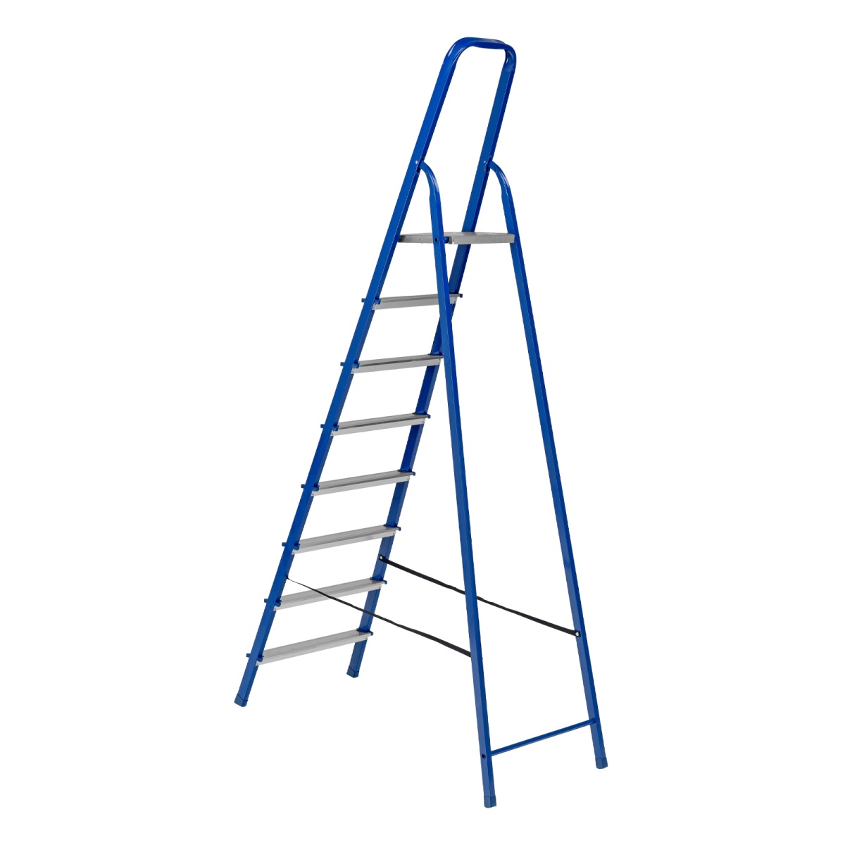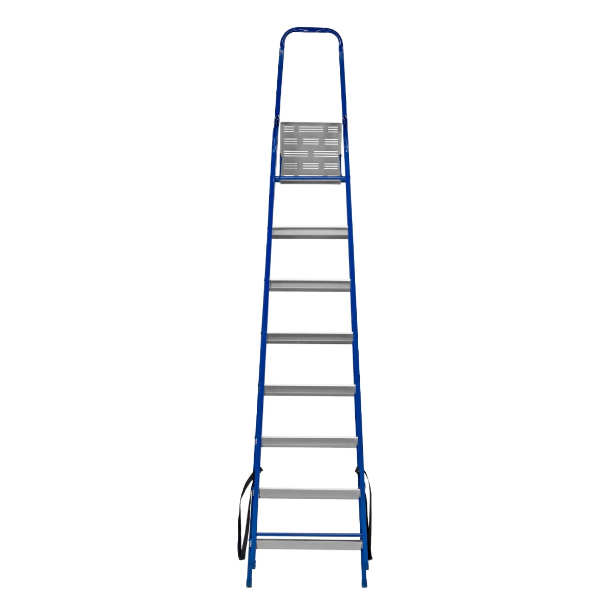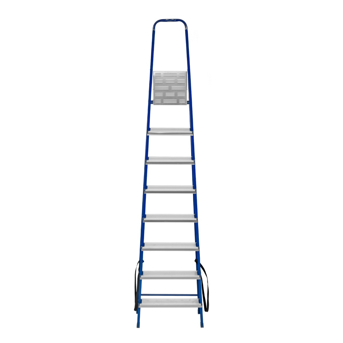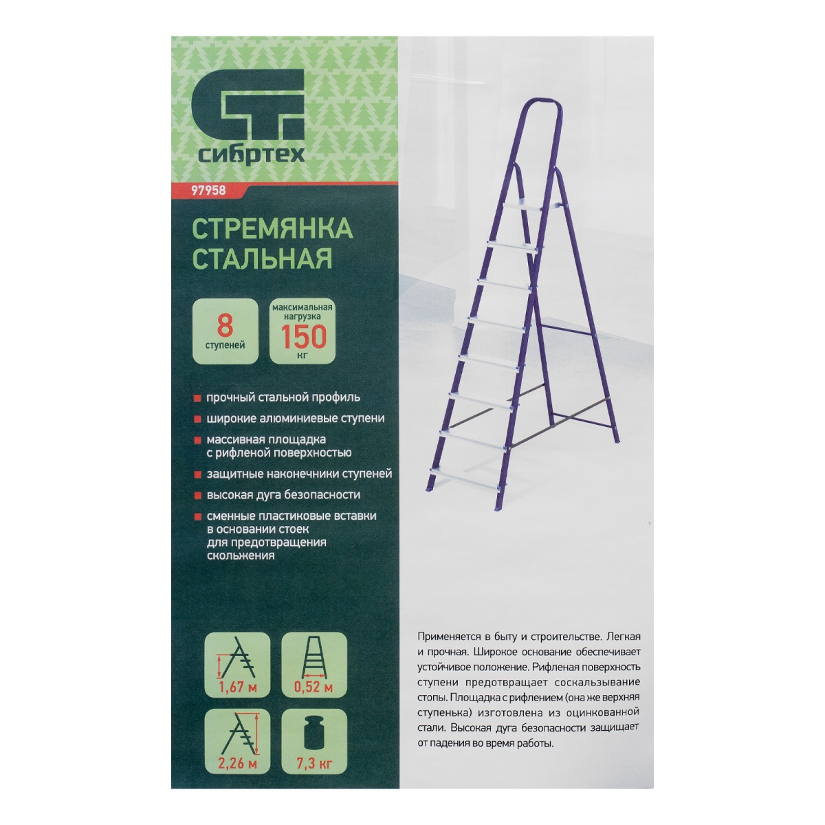 Стремянка Сибртех 8 ступеней из стального профиля и алюминиевыми ступенями используется в быту: дом, сад, гараж, а так же коммунальной и строительной деятельности.