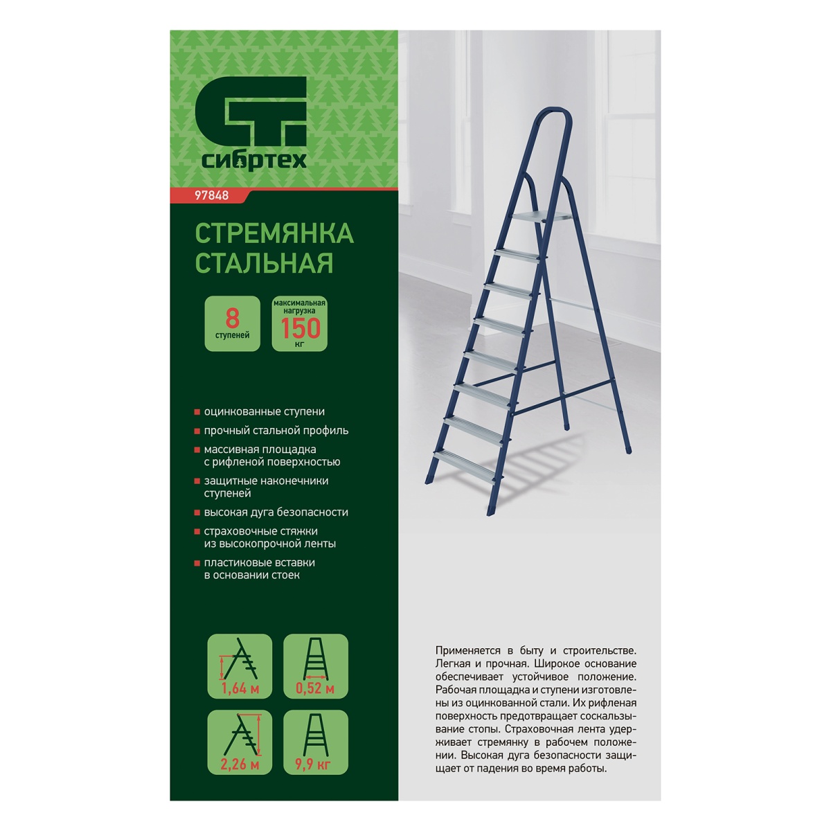 Стремянка Сибртех 8 ступеней с прочной стальной рамой прямоугольного сечения.