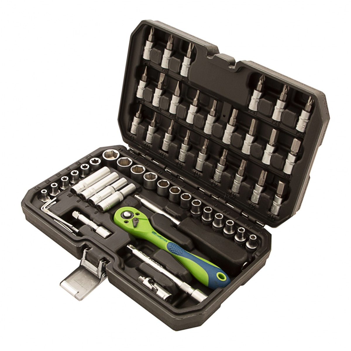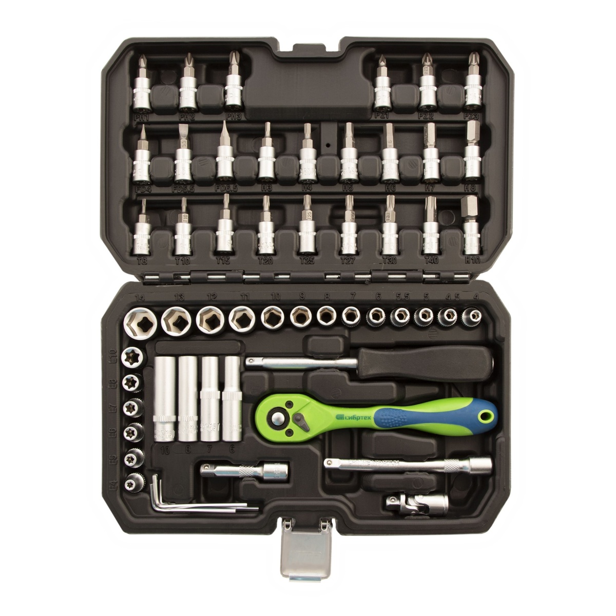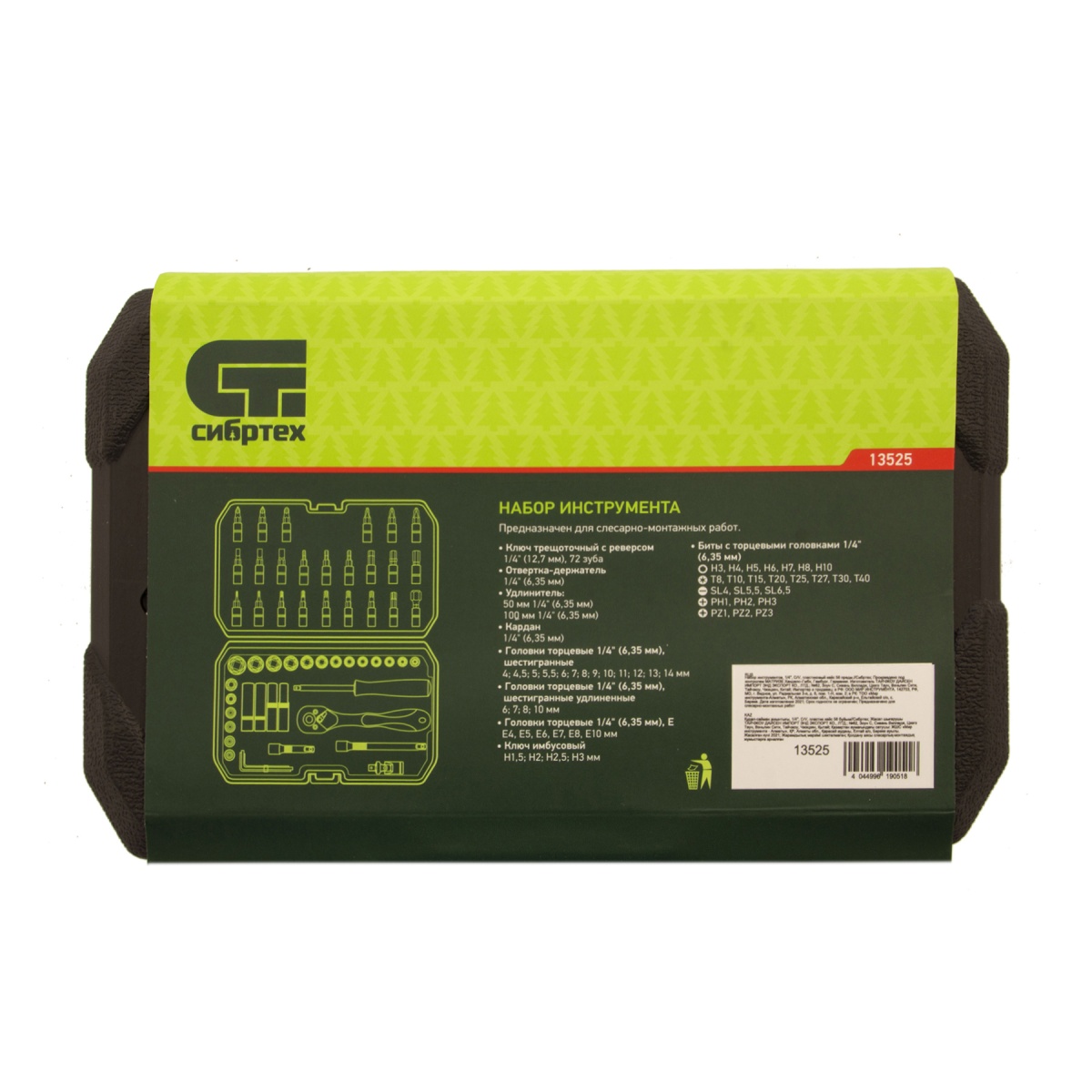 Набор инструментов Сибртех 13525, 1/4 дюйма, в пластиковом кейсе, состоит из 56 предметов, изготовленных из стали CrV-группы и предназначенных для закручивания и откручивания резьбовых крепежей. Имеющиеся в комплекте 2 удлинителя и кардан облегчают работу в труднодоступных местах. Набор будет полезен для ремонта автомобиля в гараже, пригодится также и в быту.ПреимуществаИзносостойкость — элементы набора изготовлены из высокопрочной стали хромованадиевой группы.Устойчивость к коррозии — на инструменты нанесено защитное матовое покрытие.Возможность работать в стесненных условиях — шаг трещотки составляет всего 5 градусов.Комфортная работа одной рукой — трещоточный ключ снабжен флажковым переключателем направления движения.Защита от повреждений и химических воздействий — ключ-трещотка имеет полипропиленовое покрытие по всей длине корпуса.Удобное хранение и транспортировка — инструменты и насадки упакованы в ударопрочный пластиковый кейс с металлическими замками.