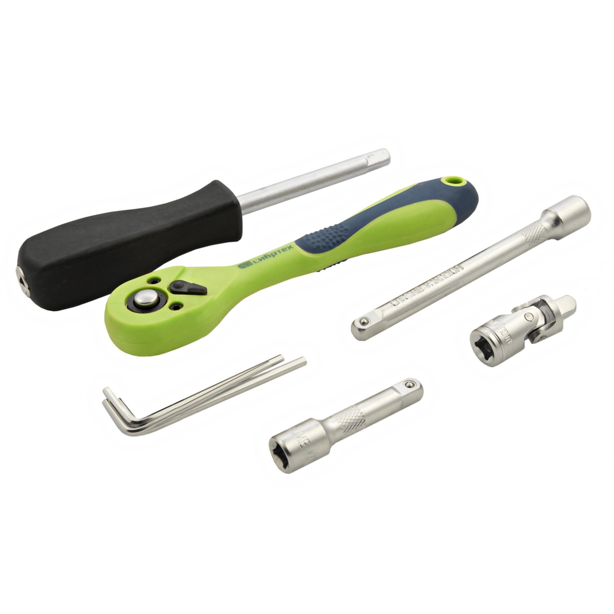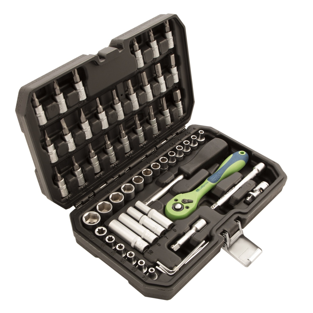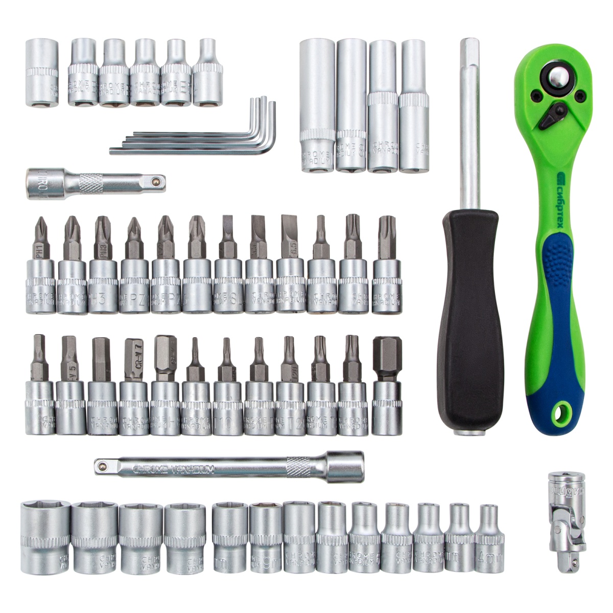 Набор инструментов Сибртех 13525, 1/4 дюйма, в пластиковом кейсе, состоит из 56 предметов, изготовленных из стали CrV-группы и предназначенных для закручивания и откручивания резьбовых крепежей. Имеющиеся в комплекте 2 удлинителя и кардан облегчают работу в труднодоступных местах. Набор будет полезен для ремонта автомобиля в гараже, пригодится также и в быту.ПреимуществаИзносостойкость — элементы набора изготовлены из высокопрочной стали хромованадиевой группы.Устойчивость к коррозии — на инструменты нанесено защитное матовое покрытие.Возможность работать в стесненных условиях — шаг трещотки составляет всего 5 градусов.Комфортная работа одной рукой — трещоточный ключ снабжен флажковым переключателем направления движения.Защита от повреждений и химических воздействий — ключ-трещотка имеет полипропиленовое покрытие по всей длине корпуса.Удобное хранение и транспортировка — инструменты и насадки упакованы в ударопрочный пластиковый кейс с металлическими замками.