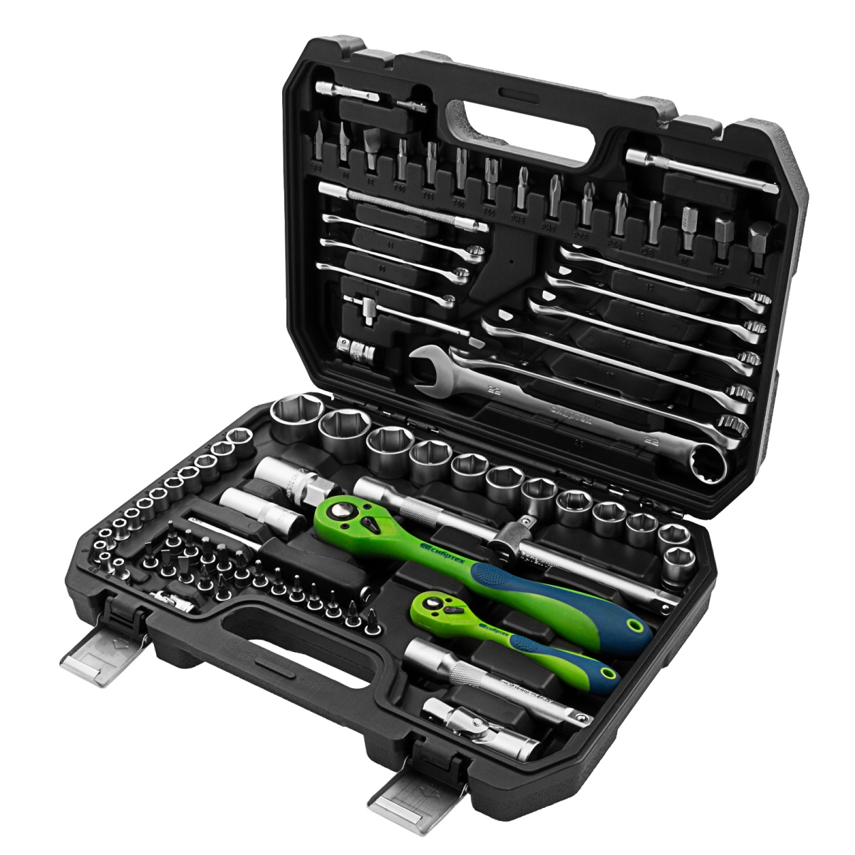 Набор инструментов Сибртех 13514, 1/2 и 1/4 дюйма, упакован в пластиковый кейс и состоит из 82 предметов из стали CrV-группы, предназначенных для слесарных работ, преимущественно монтажа и демонтажа резьбовых крепежей с разными типами шлицев. В комплект входят карданы, удлинители и переходники, облегчающие работу в труднодоступных местах. Набор используется для ремонта автомобилей, а также полезен в быту.ПреимуществаЭлементы набора устойчивы к износу и прослужат долго, поскольку изготовлены из высокопрочной стали хромованадиевой группы.Инструменты и насадки не подвержены коррозии, т.к. их защищает специальное матовое покрытие.Корпус каждого трещоточного ключа устойчив к повреждениям благодаря защитному покрытию.Трещотки имеют плавный ход, поскольку их храповики имеют 72 зуба.Ключи-трещотки адаптированы для комфортной работы одной рукой благодаря переключателям с насечкой.Набор удобен в хранении и транспортировке, т.к. упакован в ударопрочный пластиковый кейс с металлическими замками.