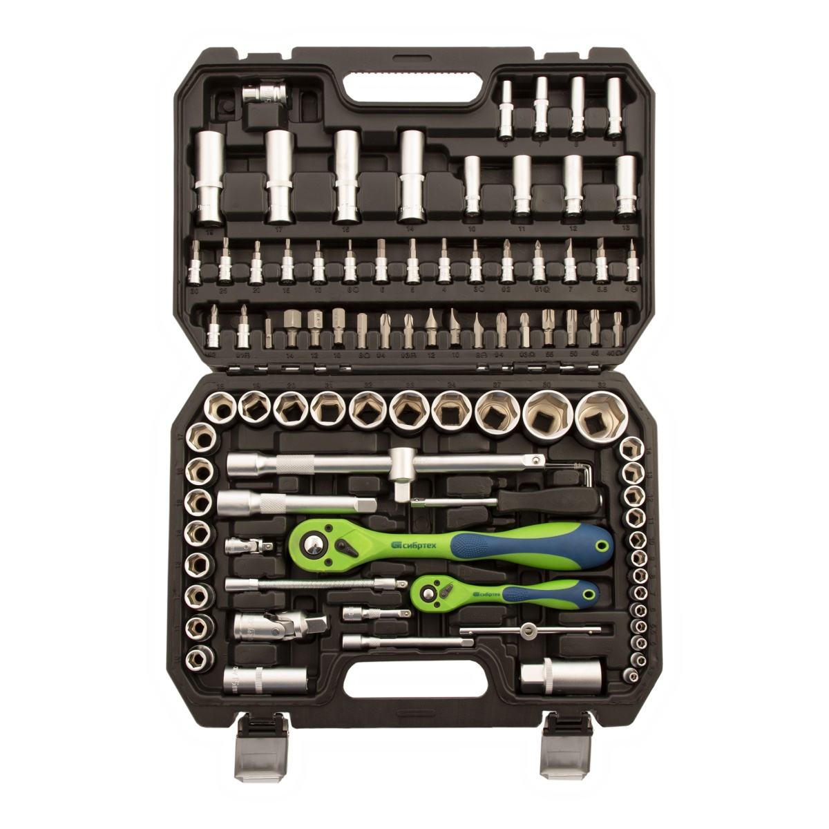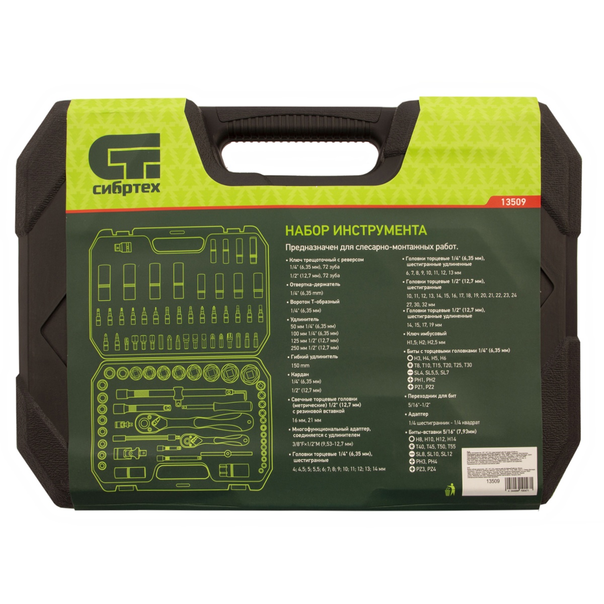 Набор инструментов Сибртех 13509, 1/2 и 1/4 дюйма, упакован в пластиковый кейс и состоит из 94 предметов из стали CrV-группы, предназначенных для монтажа и демонтажа резьбовых крепежей с разными типами шлицев. В комплект входят карданы, удлинители и переходники, облегчающие работу в труднодоступных местах. Набор используется для ремонта автомобилей, а также полезен в быту.ПреимуществаЭлементы набора устойчивы к износу и прослужат долго, поскольку изготовлены из высокопрочной стали хромованадиевой группы.Инструменты и насадки не подвержены коррозии, т.к. их защищает специальное матовое покрытие.Корпус каждого трещоточного ключа устойчив к повреждениям благодаря защитному покрытию.Трещотки имеют плавный ход, поскольку их храповики имеют 72 зуба.Ключи-трещотки адаптированы для комфортной работы одной рукой благодаря переключателям с насечкой.Набор удобен в хранении и транспортировке, т.к. упакован в ударопрочный пластиковый кейс с металлическими замками.