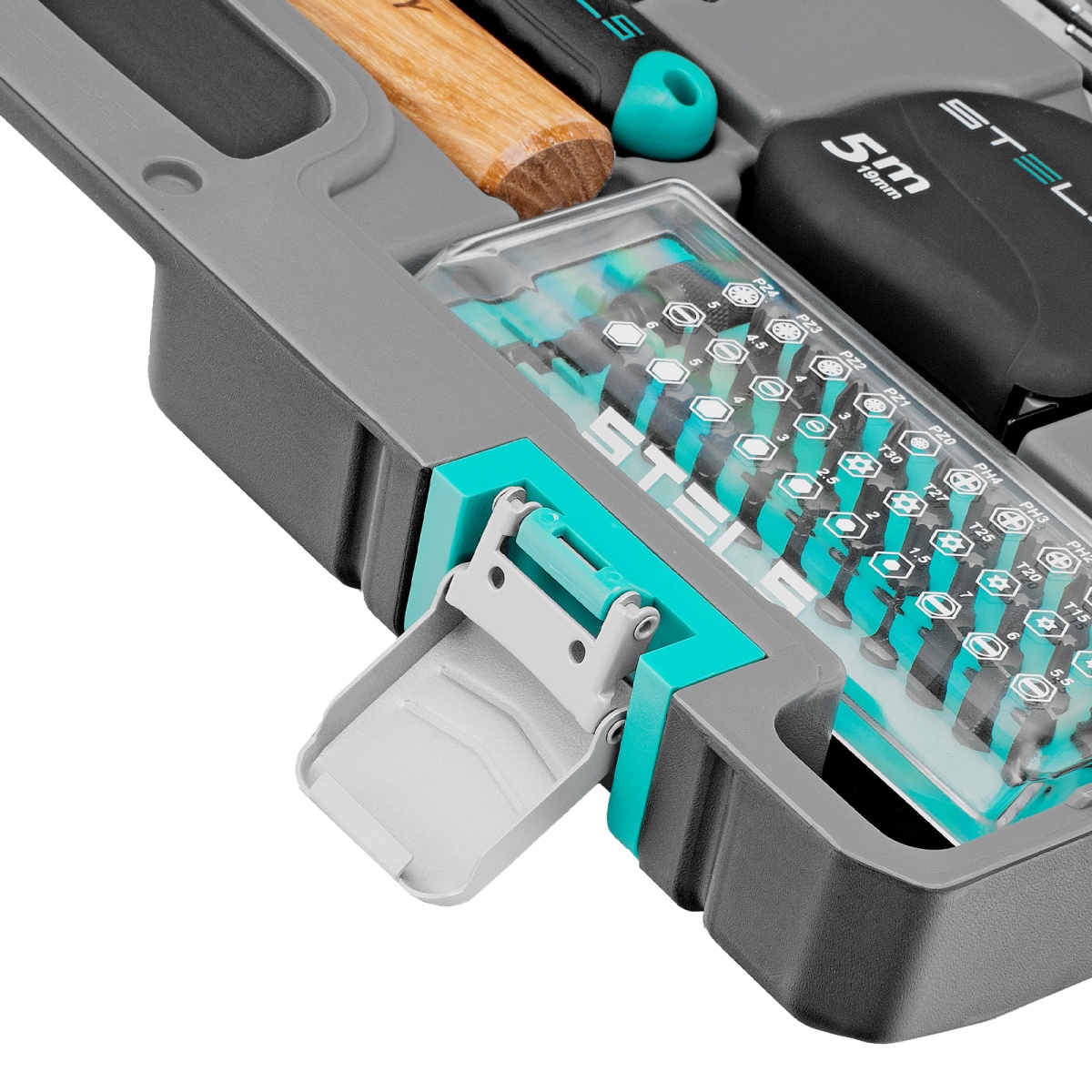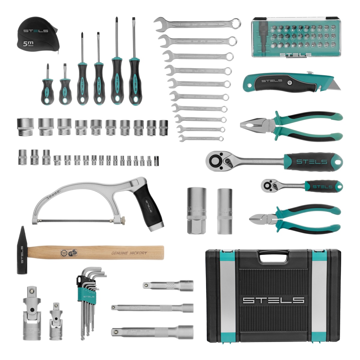 Комплектация: Головки 4, 4.5, 5, 5.5, 6, 7, 8, 9, 10, 11, 12, 13, 14, 16, 17, 18, 19, 20, 22, 24, 27, 30, 32 - 26 шт, Головки свечные 16, 22 - 2 шт, Ключ трещoточный - 2 шт, Кардан шарнирный - 2 шт, Удлинители - 3 шт, Адаптер для бит - 2 шт, Биты-вставки - 31 шт, Ключи комбинированные 8, 9, 10, 11, 12, 13, 14, 15, 17, 19 - 10 шт, Ключи имбусовые - 9 шт, Бокорезы -1шт, Плоскогубцы - 1 шт, Молоток - 1 шт, Ножовка ручная - 1 шт, Отвертки - PH, SL - 6 шт, Нож хозяйственный - 1 шт, Рулетка - 1 шт, Кейс - 1 шт