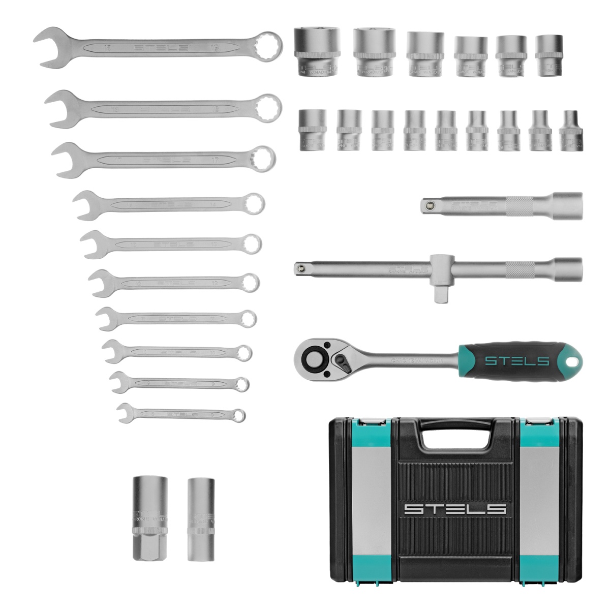 Набор инструментов Stels 14102, 1/2 дюйма, сталь CrV-группы, упакован в пластиковый кейс и состоит из 31 предмета для работы с гайками, винтами и другими резьбовыми крепежами. В комплект входит ключ-трещотка с шагом 5 градусов и удлинители, облегчающие работу в труднодоступных местах. Набор будет полезен в гараже или в поездке, а также пригодится для проведения мелкого ремонта дома или на даче.ПреимуществаЭлементы набора изготовлены из термически обработанной стали хромованадиевой группы, что придает им легкость и вместе с тем устойчивость к повышенным нагрузкам.Поверхность инструментов хромирована, что обеспечивает им защиту от коррозии и увеличивает срок их службы.Трещоточный ключ имеет механизм быстрого сброса, позволяющий заменить головку за несколько секунд.Благодаря переключателю реверса можно мгновенно изменить направление вращения трещотки.Храповый механизм трещоточного ключа имеет 72 зуба, что дает непревзойденную плавность хода.Инструменты зафиксированы в ложементе кейса из жесткого ударопрочного пластика, закрывающегося на металлические замки, поэтому набор удобно хранить и перевозить.Все этапы производства сопровождаются строгим технологическим контролем, что гарантирует высокое качество инструментов.На набор предоставляется пожизненная гарантия, подробности которой указаны в гарантийном талоне.