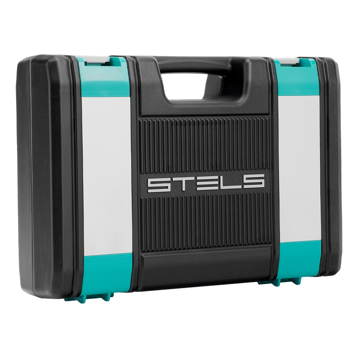 Набор инструментов Stels 14103 в пластиковом кейсе включает в себя 60 предметов с присоединительным размером 1/2 дюйма из стали CrV. Он применяется для монтажа и демонтажа резьбовых соединений во время обслуживания и ремонта авто, а также выполнения бытовых работ. Инструменты пригодятся автолюбителям и домашним мастерам.ПреимуществаВысокая прочность и износостойкость — все элементы набора изготовлены из высококачественной стали хромованадиевой группы и термически обработаны.Защита от разрушения — матовое антикоррозийное покрытие предотвращает появление ржавчины, а рукоятка трещотки из полипропилена и резины устойчива к воздействию бензина и масла.Простое переключение между задачами — механизм быстрого сброса позволяет легко менять насадки на трещотке.Быстрый поиск нужного инструмента — элементы набора надежно зафиксированы в ячейках ложемента с подписанными типоразмерами.Комфортная работа — трещотка с 72 зубьями вращает крепеж мягко и плавно, а эргономичная рукоятка удобно лежит в руке.Удобное хранение и транспортировка — набор поставляется в пластиковом ударопрочном кейсе с металлическими замками.Высокое качество — характеристики изделий соответствуют международным стандартам, гарантия на торцевые головки размером от 8 мм действует пожизненно.
