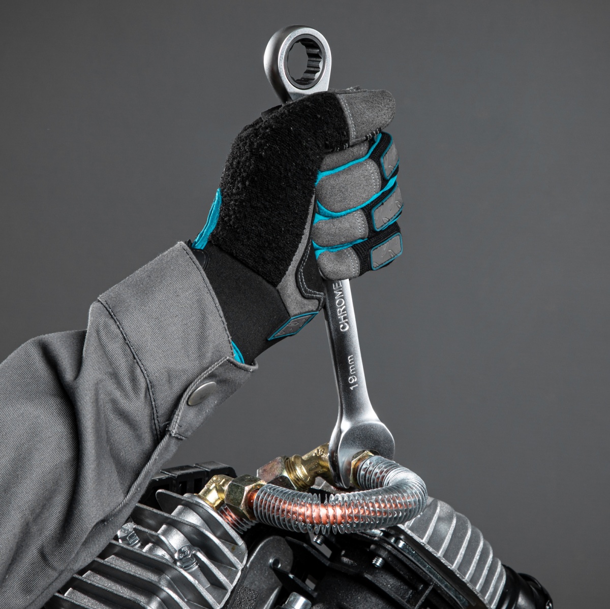 - Эффективная работа — 12-гранный профиль накидной части ключа плотно охватывает поверхность крепежа, предотвращая деформацию его граней.