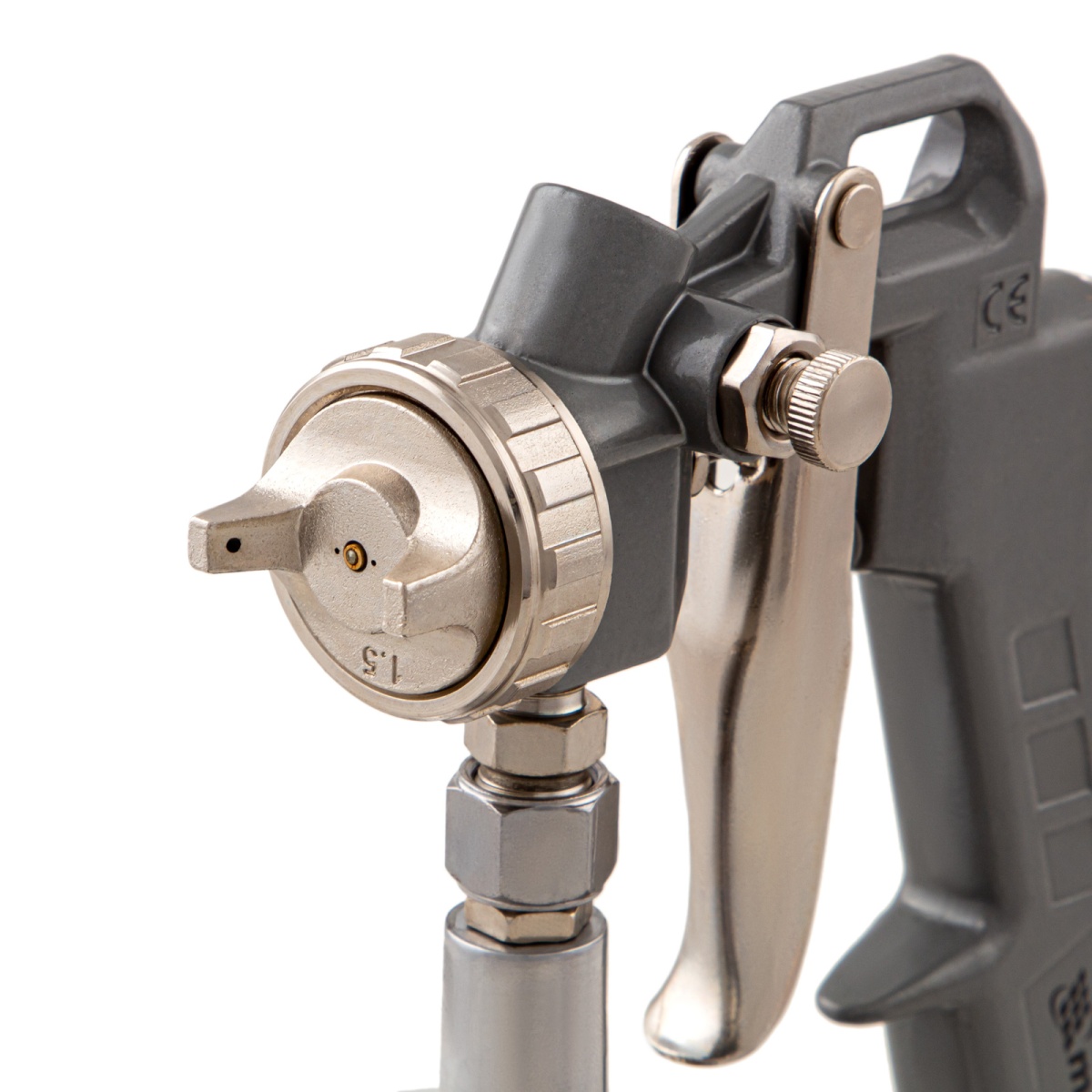 - Надежность — пистолеты всех инструментов изготовлены из прочного металла.Качественное окрашивание — технология распыления HVLP (высокий объем, низкое давление) позволяет снизить потери краски при работе краскораспылителем.Удобная эксплуатация — бак краскораспылителя расположен снизу и не загораживает обзор мастеру.Выбор режима окрашивания — краскораспылитель оснащен регуляторами расхода краски и формы распыления.Промывка труднодоступных мест — промывочный пистолет имеет удлиненное сопло (205 мм).Прочная и вместительная емкость — стальной бак промывочного пистолета объемом 0,85 л обеспечивает значительный запас жидкости.Легкое накачивание шин на спаренных колесах — гибкий шланг на пистолете подкачки упрощает работу в труднодоступных местах.Контроль давления — пистолет подкачки шин оснащен точным механическим манометром.Безопасная работа — предохранительный клапан предотвращает аварийные ситуации, снижая избыточное давление в шинах.Надежная фиксация — на конце шланга для накачки шин имеется специальный зажим.Эффективная продувка — пневмопистолет производительностью 250 л/мин обеспечивает мощный воздушный поток, а небольшие размеры и малый вес 0,125 кг позволяют использовать его в труднодоступных местах.Прочный шланг — он изготовлен из полиамида, устойчивого к воздействию агрессивной среды.Удобное использование — спиральный шланг не перегибается и не нуждается в скручивании после окончания работ, а его длины 5 м достаточно для свободного передвижения по рабочей зоне.