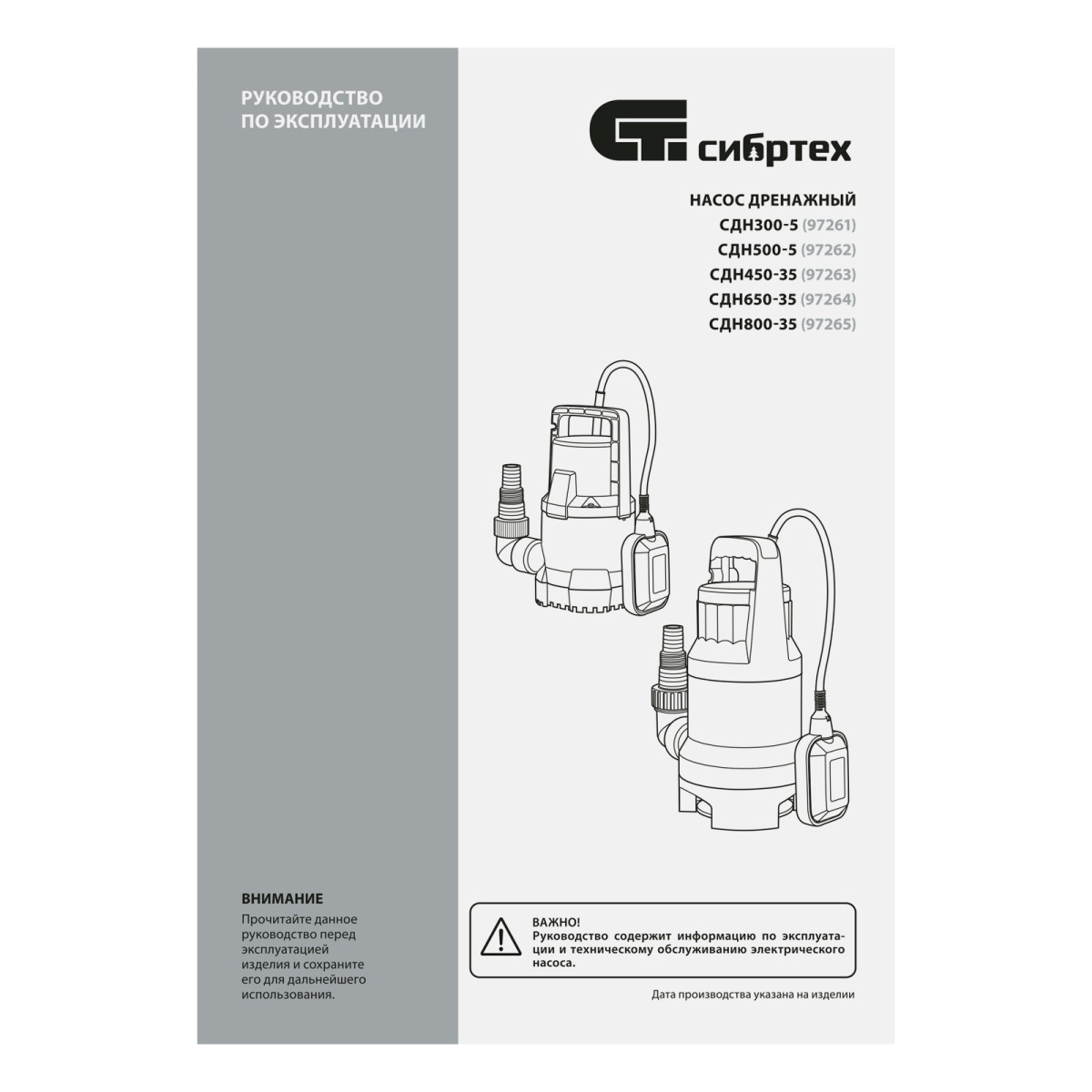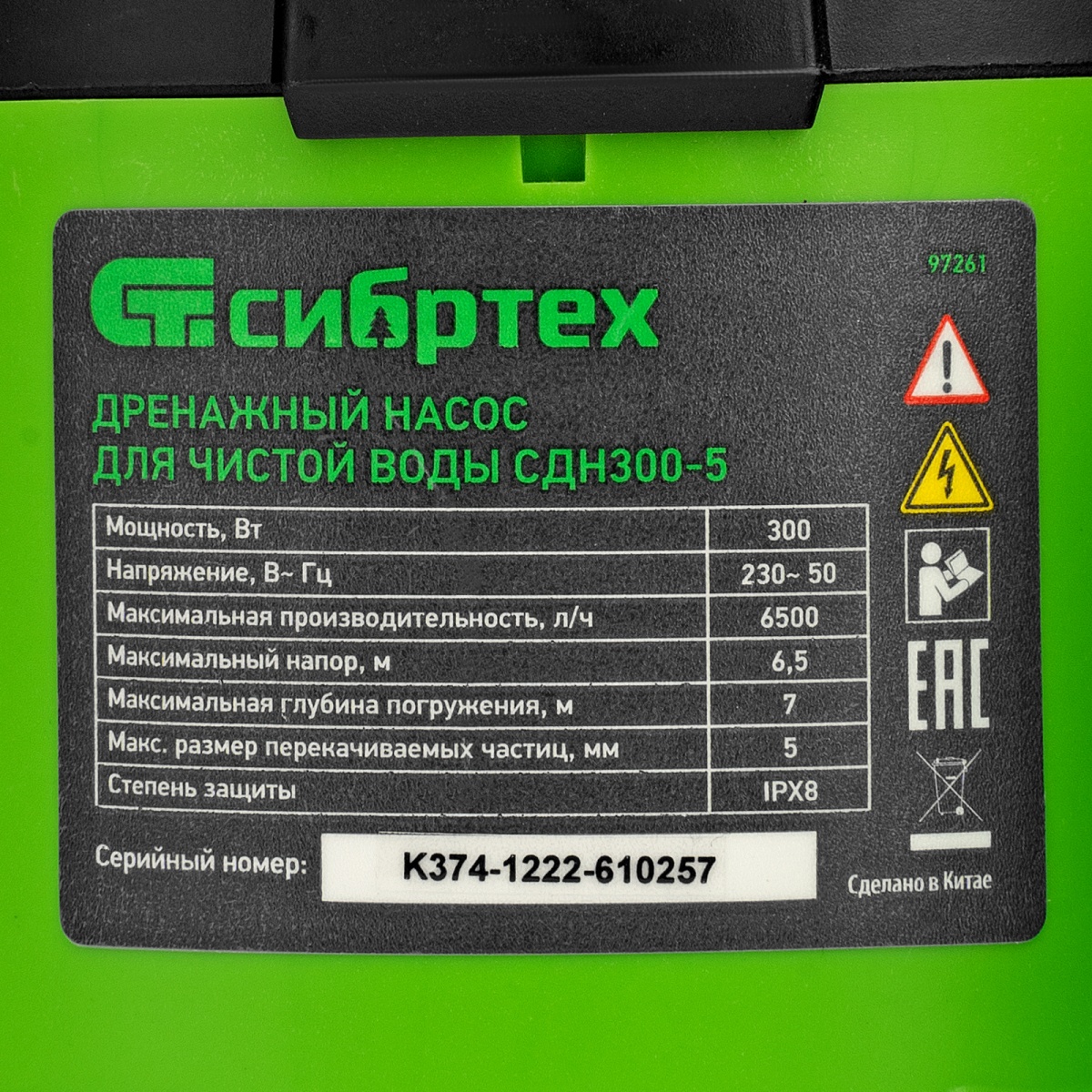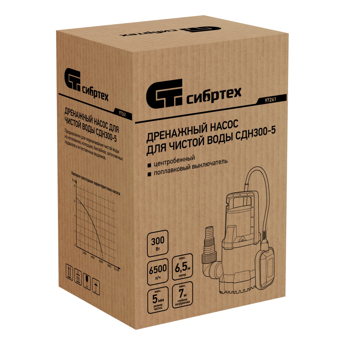Дренажный насос для чистой воды Сибртех СДН300-5 97261 мощностью 300 Вт предназначен для осушения колодцев, затопленных помещений, бассейнов, а также для организации систем орошения и водоснабжения со скоростью 6500 л/ч, обеспечивая напор 6,5 м. Насос питается от однофазной сети с напряжением 230 В, поэтому идеально подходит для применения в частных домах, дачных коттеджах и небольших строительных объектах.ПреимуществаНадежная и комфортная работа — корпус из пластика предохраняет внутренние узлы от повреждений и снижает уровень шума от работающего двигателя.Степень защиты IPX8 — погружение насоса на большую глубину полностью безопасно, риск попадания воды на электронные компоненты исключен.Автоматическая работа — поплавок-выключатель запускает и отключает двигатель при достижении необходимого уровня воды, что предотвращает эксплуатацию всухую и позволяет пользователю не находиться постоянно около насоса.Герметичное соединение — шланги и трубы надежно стыкуются с насосом, это исключает потерю воды и позволяет добиться стабильно высокой производительности.Электробезопасность — сетевой кабель длиной 7 м и штепсельная вилка с заземлением входят в комплект поставки и позволяют эксплуатировать насос, не боясь поражения током.Удобное погружение и комфортная транспортировка — переносная ручка позволяет привязывать к насосу веревку (трос) и эксплуатировать его в вертикальных ямах или колодцах, а также перемещать до нужного места.Минимальное техническое обслуживание — за насосом достаточно просто ухаживать, необходимо лишь очищать пластичную крыльчатку по мере ее засорения.