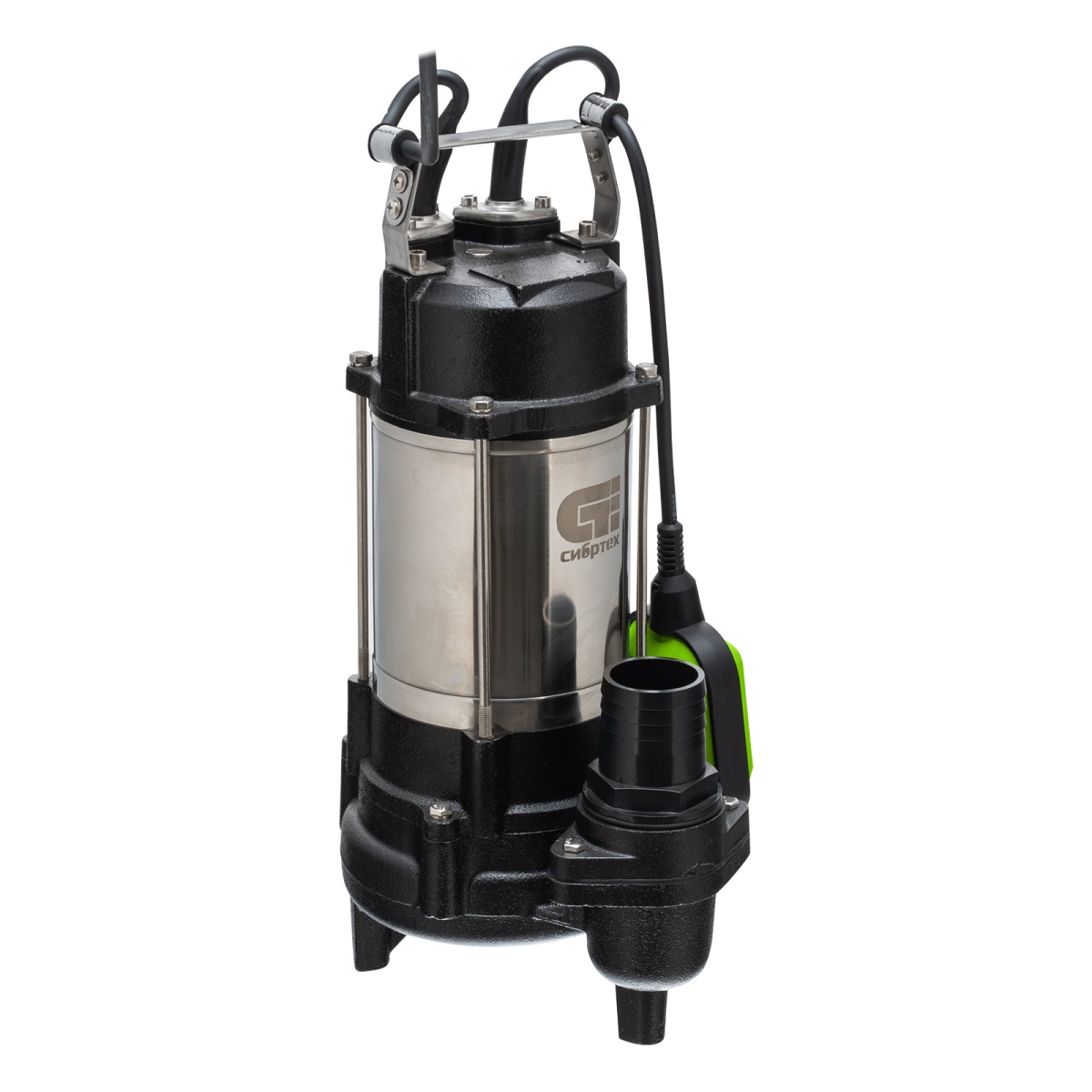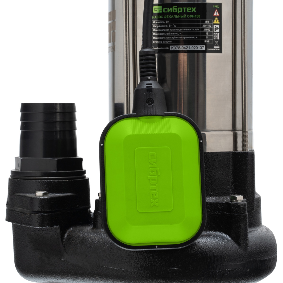 Фекальный насос Сибртех СФН450 99802 мощностью 450 Вт и производительностью 21000 л/ч обеспечивает напор до 15 м, совместим со шлангами диаметром 2 дюйма и предназначен для перекачивания грязных бытовых, сточных и смешанных вод с частицами диаметром до 25 мм. С помощью насоса можно организовать дренажную систему осушения затапливаемых помещений, принудительную канализационную систему на даче или систему автоматического полива с несколькими точками водоразбора. Также он используется для откачки нечистот из выгребных ям, стоков и канализаций. Насос способен работать с холодными стоками температурой не выше 35 градусов.ПреимуществаАвтоматическая работа — датчик уровня воды не дает насосу запускаться на сухом ходу, контроль пользователя при этом не требуется.Быстрый монтаж — с помощью троса насос необходимо опустить в колодец на глубину до 5 м и установить в вертикальном положении.Термозащита — двигатель автоматически отключается при перегреве, что предотвращает его поломку.Работа в агрессивной среде — корпус насоса, изготовленный из чугуна и нержавеющей стали, устойчив к внешним воздействиям.Долговечность — чугунный импеллер отличается высокой износостойкостью.Влагонепроницаемость — насос имеет степень защиты IPX8, а значит, его корпус полностью герметичен и вода не попадает на электронные компоненты.Устойчивость — благодаря ножкам в нижней части корпуса насос не опрокидывается во время работы.Удобная транспортировка — при помощи ручки в верхней части корпуса насос легко перемещать.