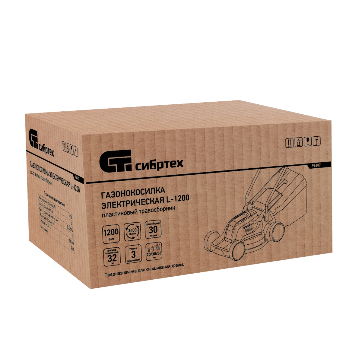 Электрическая газонокосилка Сибртех L1200 96607 мощностью 1200 Вт, с 3 уровнями скашивания, оснащена пластиковым травосборником на 30 л, а ширина ее прохода составляет 32 см. В зависимости от поставленных задач можно установить уровень скашивания 20, 38 и 56 мм. Косилка позволяет справиться в течение часа с газоном площадью до 1200 кв.м. Подойдет даже новичкам, т.к. очень проста в обслуживании и не требует смешивания и заливки топлива и масла.ПреимуществаЭкологичность — газонокосилка не загрязняет окружающую среду выхлопными газами, во время работы отсутствует неприятный запах.Надежность — использование ременного привода облегчает обслуживание косилки и замену деталей (их можно менять по отдельности), предотвращает повреждение трансмиссии и двигателя при ударах, при этом соскакивание ремня с привода исключено.Качественные комплектующие — на подшипниках имеется маркировка производителя, что подтверждает их надежность и облегчает поиск деталей на замену (при необходимости).Защита от перегрева — термодатчик в обмотке электродвигателя останавливает работу в случае превышения допустимой температуры.Защита от перегрузки — устройство защиты не допускает поломку двигателя при риске перенапряжения.Объемный травосборник — вся трава собирается в пластиковый контейнер емкостью 30 л.Индикатор наполненности контейнера — флажок поднимается под действием воздушного потока, если травы в сборнике мало, и опускается при его заполнении.Устойчивость к повреждениям — дека изготовлена из прочного полипропилена, поэтому ей не страшны ударные и деформационные нагрузки.Расходные материалы в наличии — вместе с косилкой можно сразу заказать нож Сибртех 96330, сэкономив время на его поиск в будущем.Мобильность — удобная складная ручка и небольшой вес косилки (всего 8,2 кг) позволяют легко транспортировать ее.