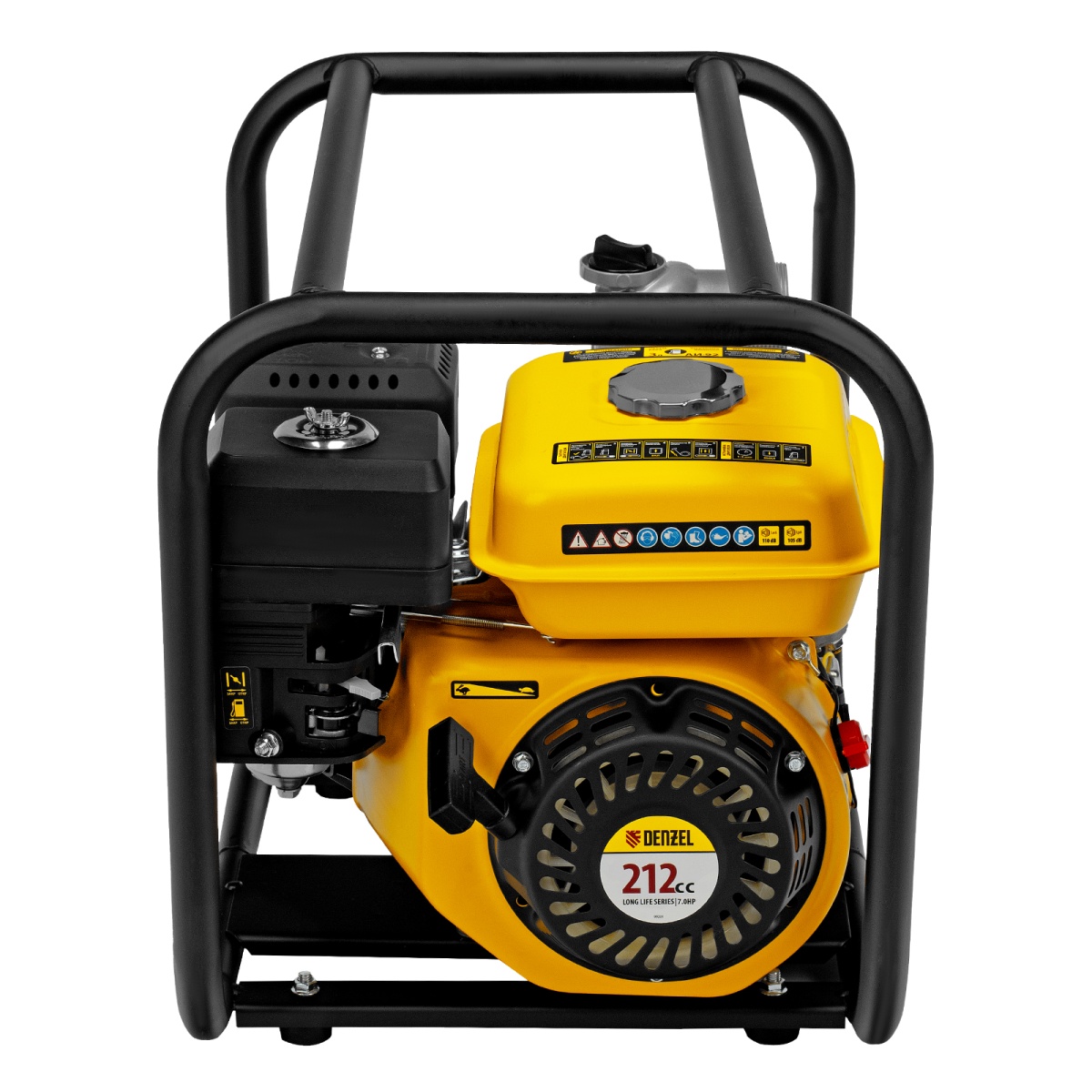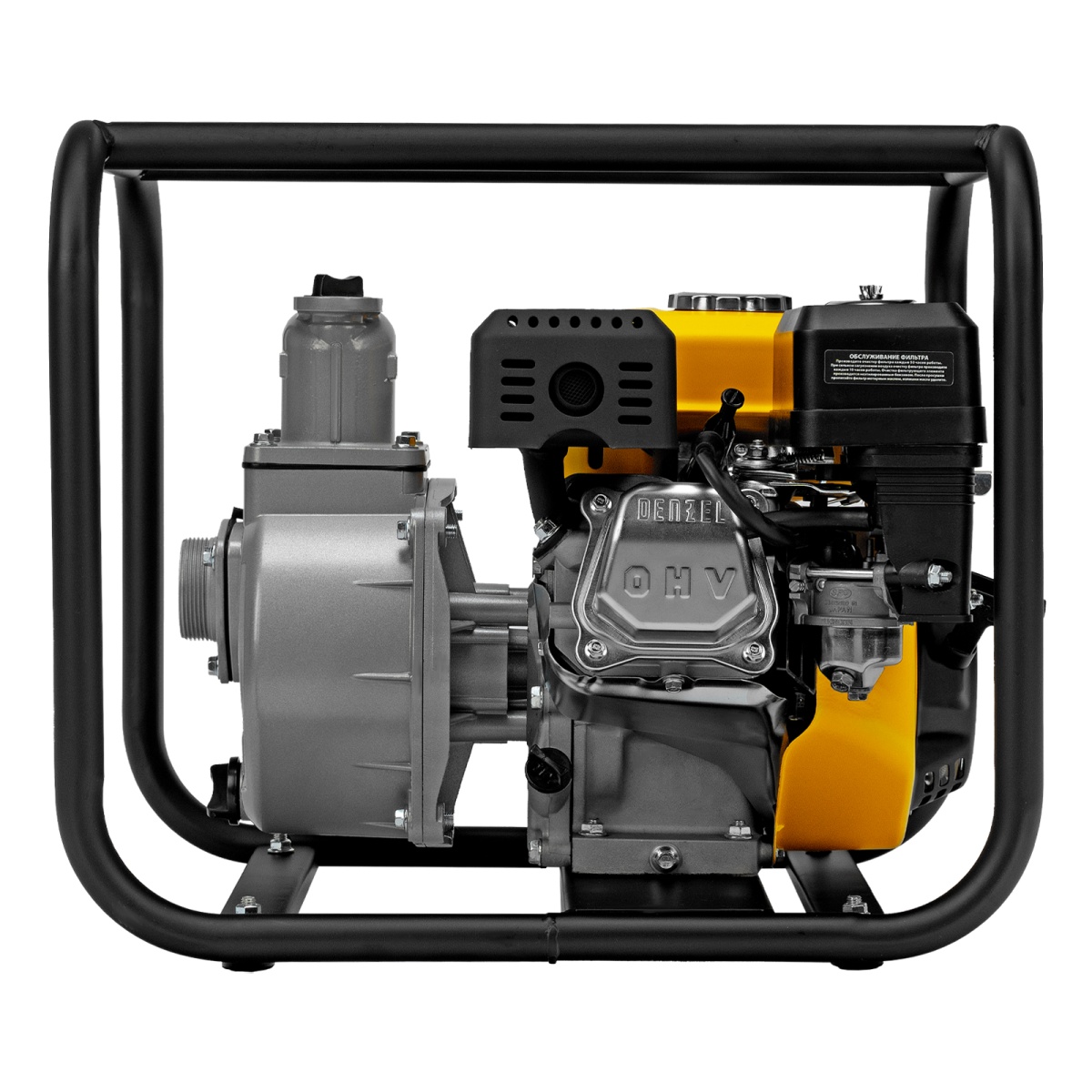 - Прочная конструкция — усиленная рама с широким основанием защищает мотопомпу от повреждений и обеспечивает устойчивость даже на неровной поверхности.
