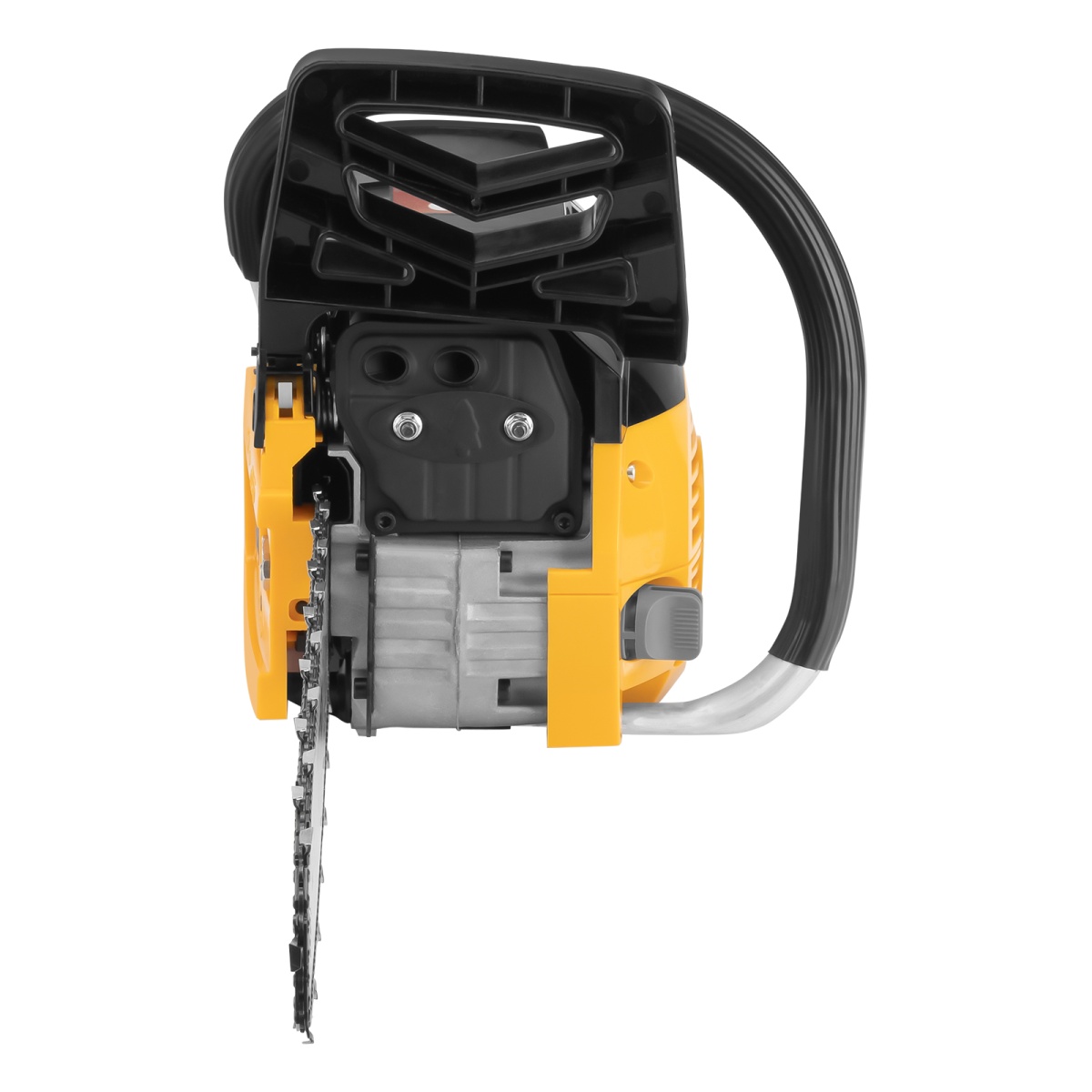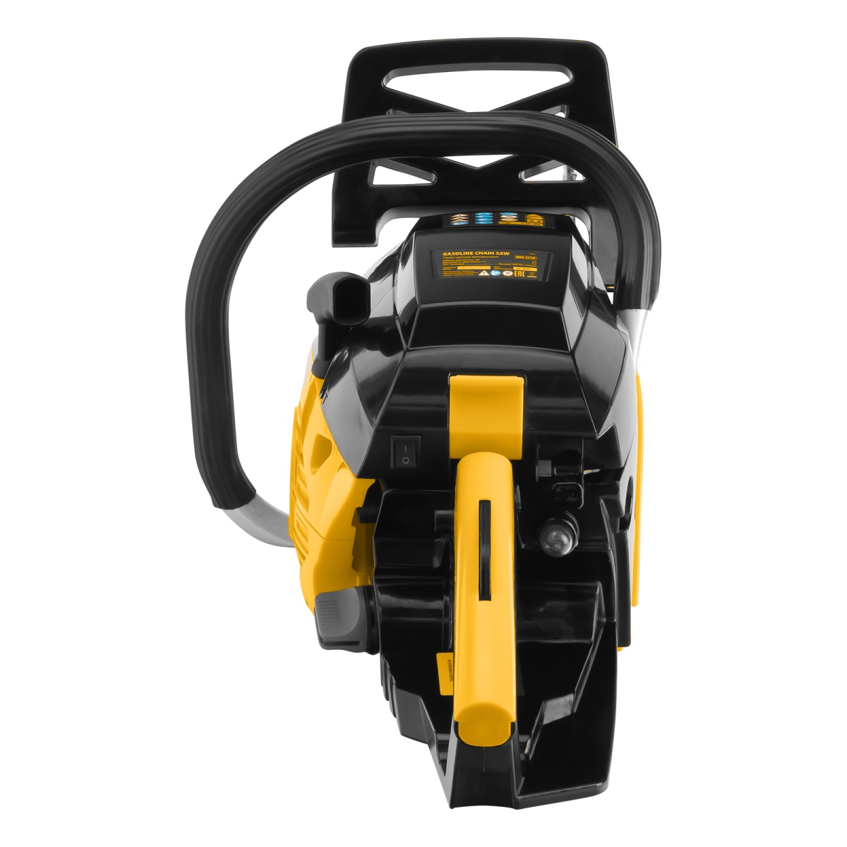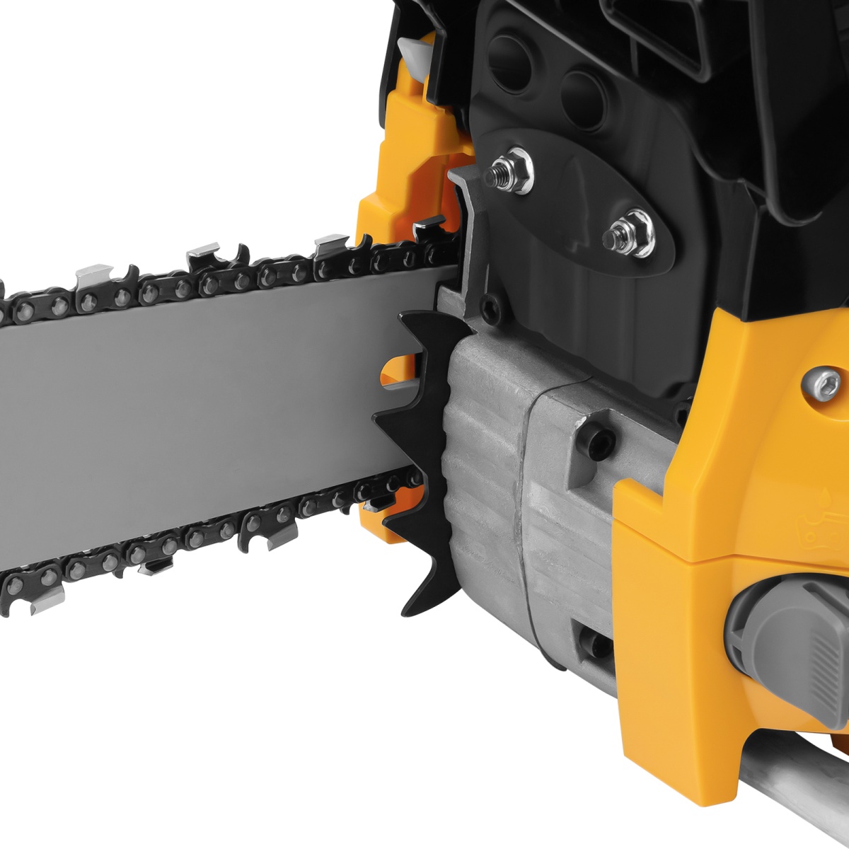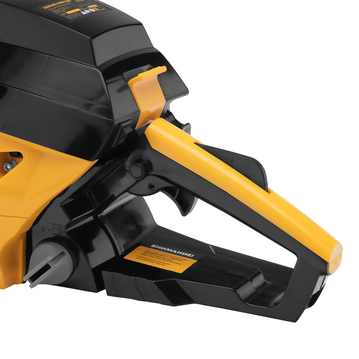 - Безопасность пользователя — специальный щиток и автоматический тормоз цепи уменьшают риск получения травм при отскоке пилы, также предусмотрена защита от случайного пуска.
