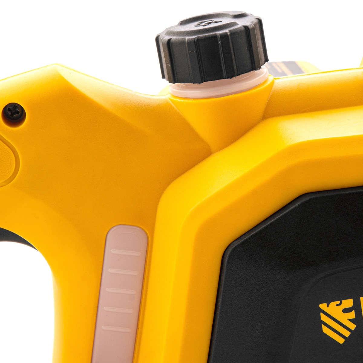 - Полупрозрачный масляный бак — удобно контролировать уровень масла и вовремя доливать его, ориентируясь на отметку max.Надежное удерживание пилы — стальной зубчатый упор служит точкой опоры, уменьшая нагрузку на пользователя и позволяя получить аккуратный срез.