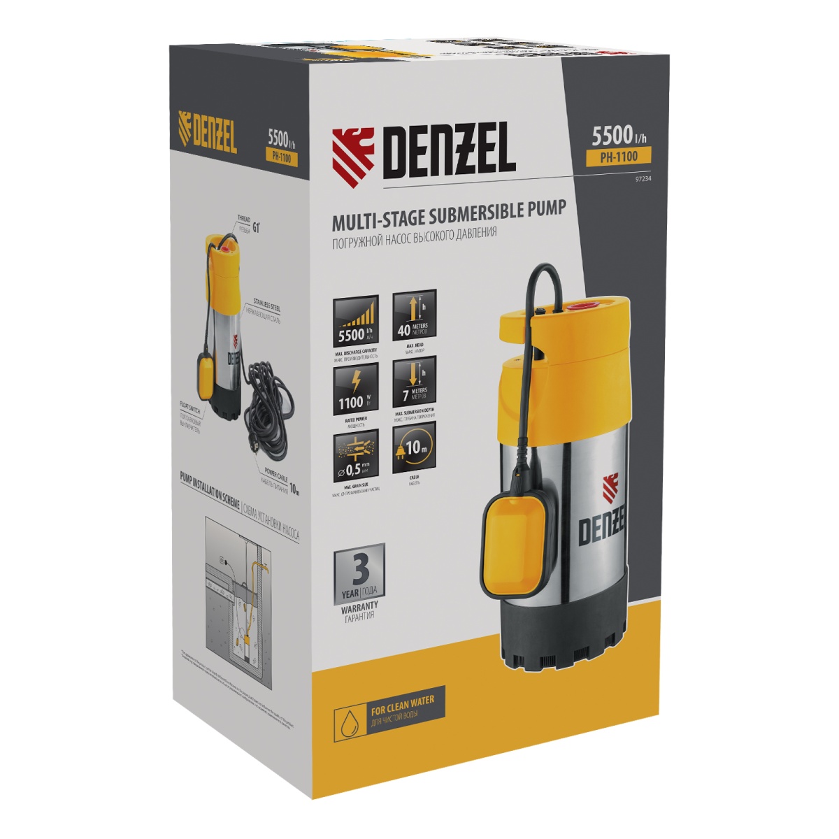 Погружной насос Denzel PH1100 97234 мощностью 1100 Вт и производительностью 5500 л/ч создает напор до 40 м и используется для подачи чистой воды под давлением до 4 бар из резервуара, водоема и колодца, даже если он находится далеко от участка. Позволяет организовать систему орошения и водоснабжения на даче. Скорости работы до 91 л/мин и напора до 40 м достаточно для подачи воды на верхние этажи в несколько точек водоразбора.