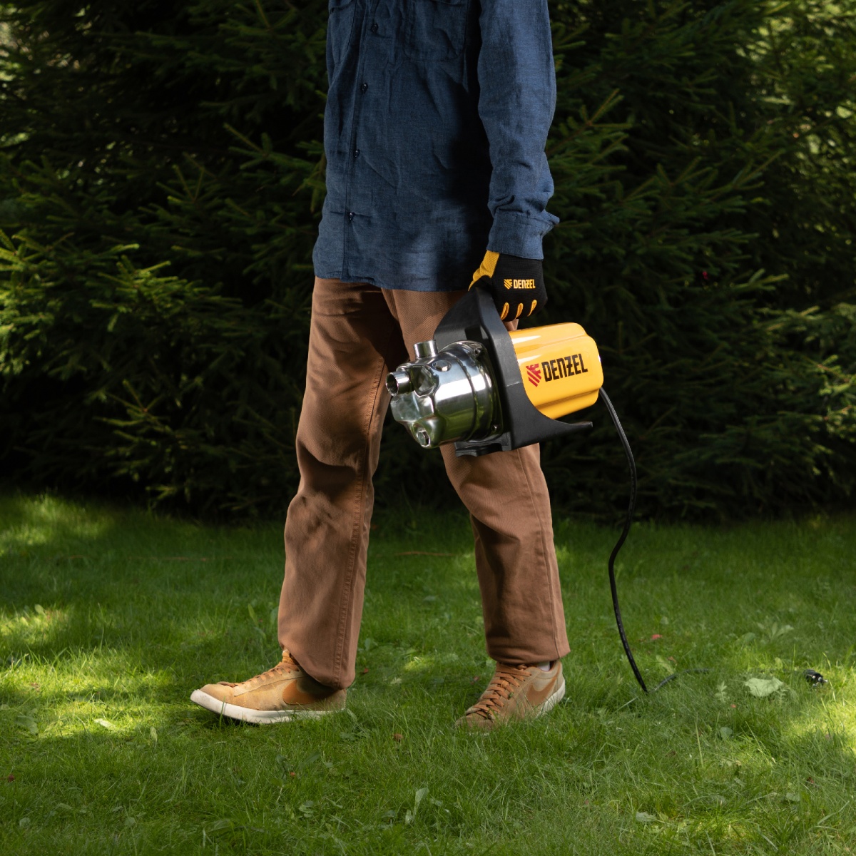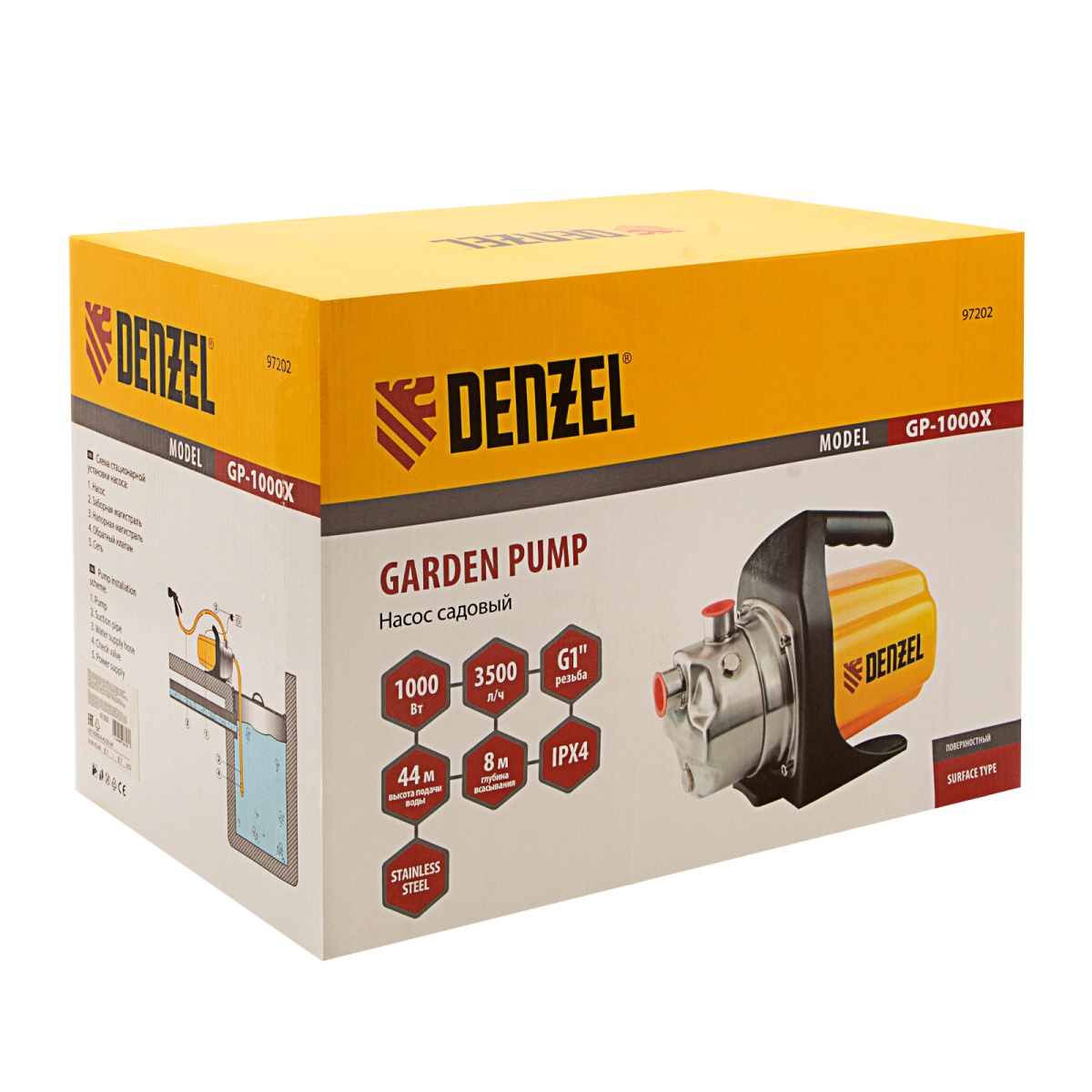 Садовый поверхностный насос Denzel GP1000X 97202 с корпусом из «нержавейки», мощностью 1000 Вт и производительностью 3500 л/ч, позволяет перекачивать большие объемы чистой воды из резервуаров и колодцев глубиной до 8 м, а высоты подъема до 44 м хватает для питания систем полива и водоснабжения загородного дома. Благодаря высокой производительности насос обеспечивает подачу воды сразу в несколько точек разбора.
