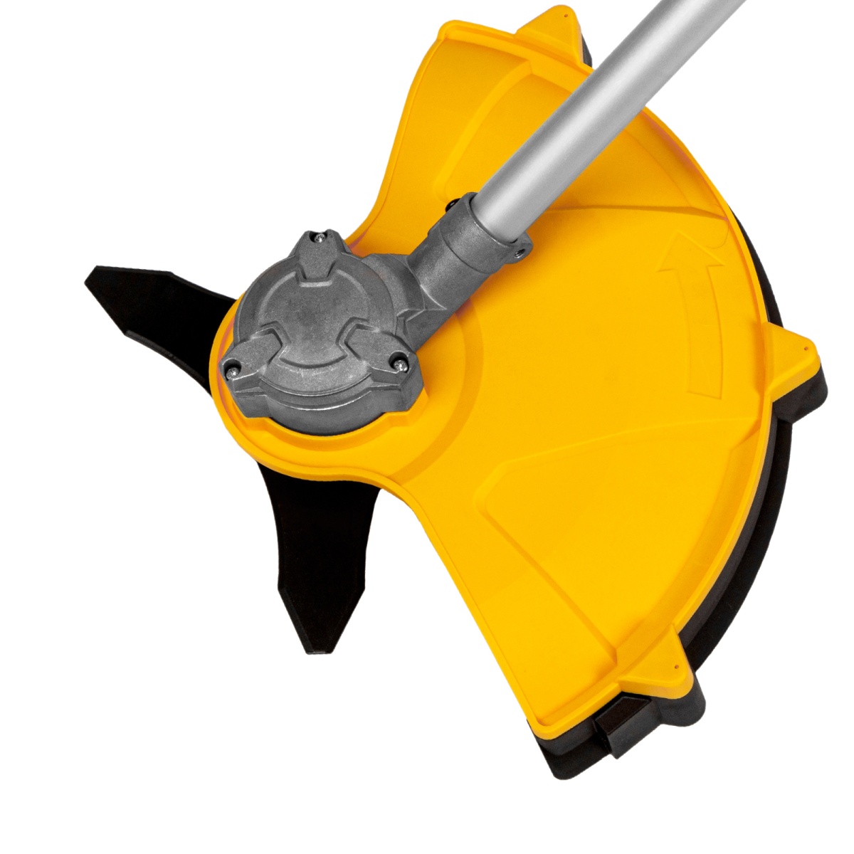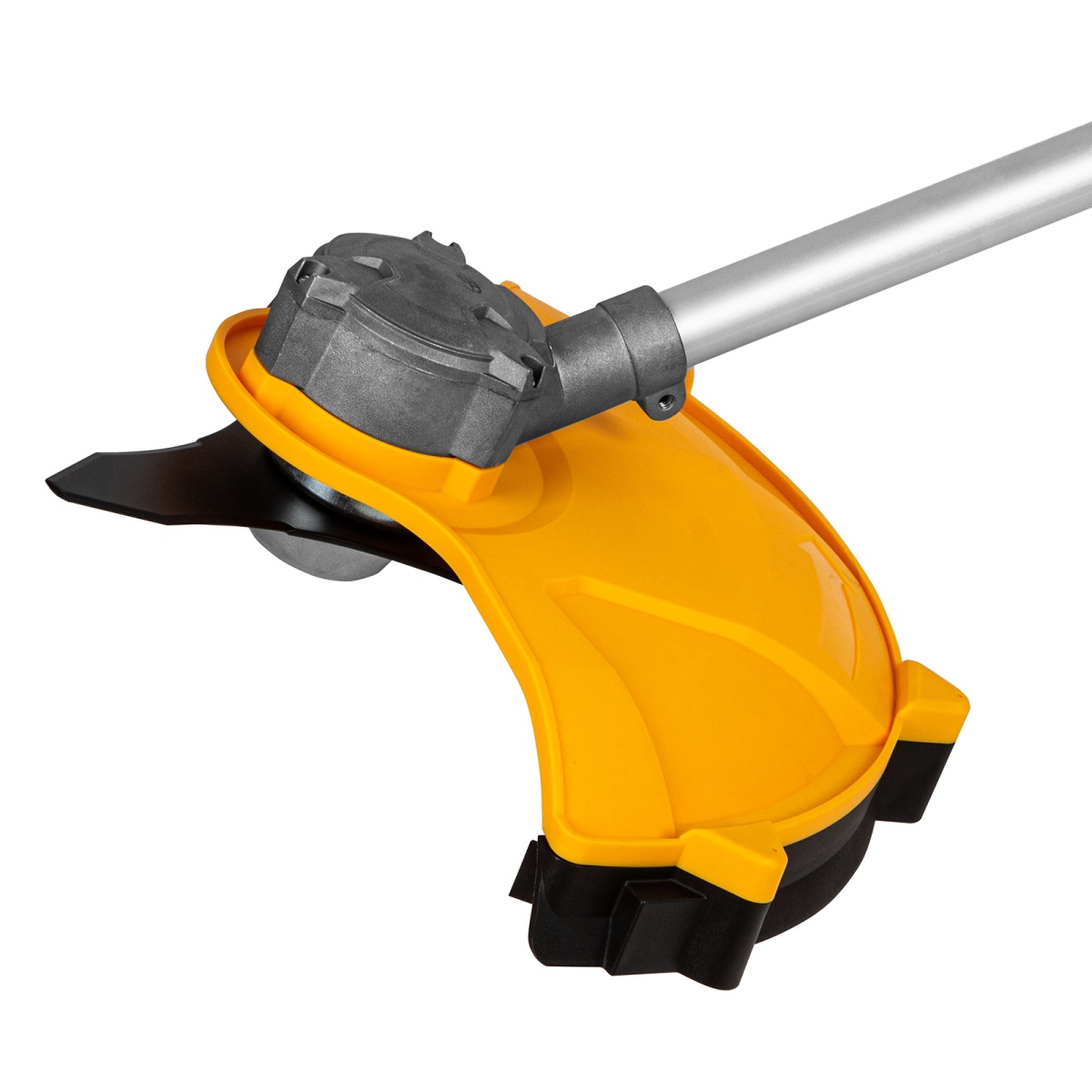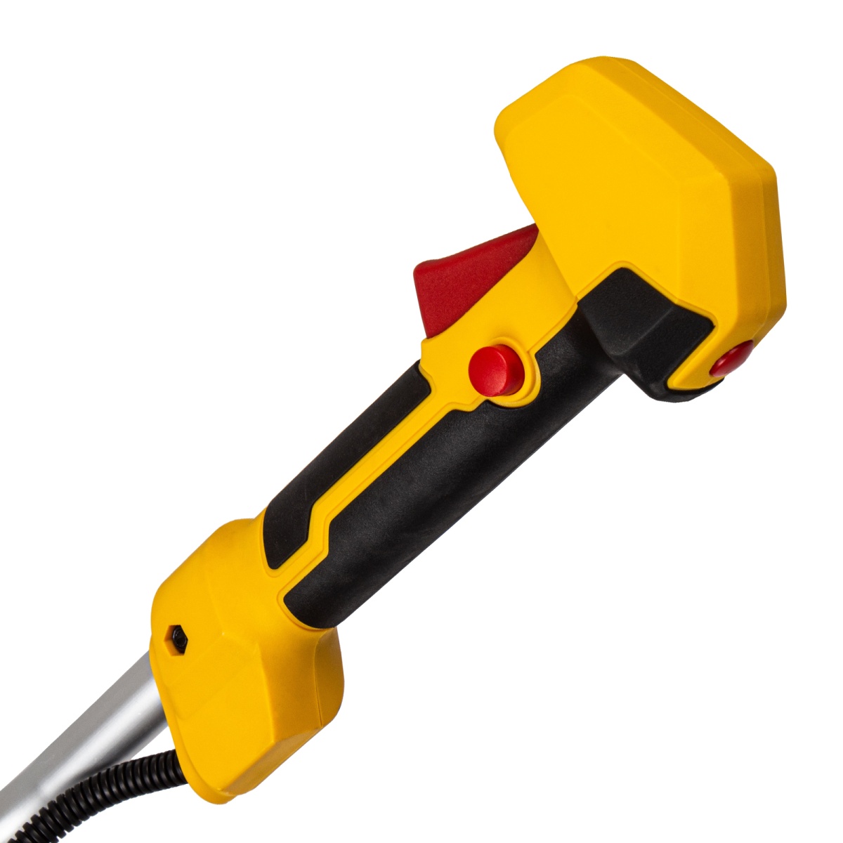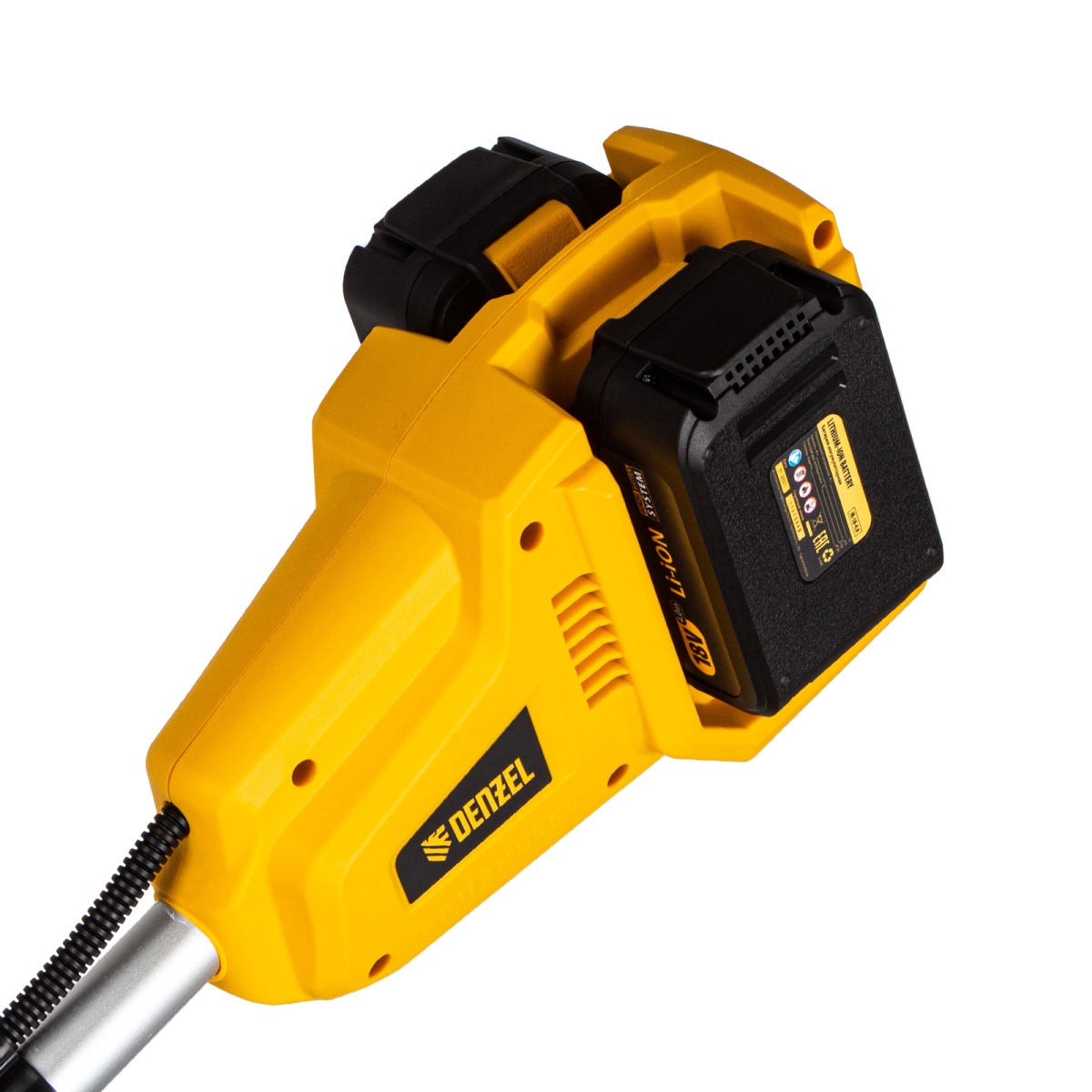 Аккумуляторный бесщеточный триммер Denzel CBC350-36 58720 с двумя батареями Li-ion, 36 В, используется для скашивания густой травы, сорняков и мелкого кустарника на приусадебном участке. В качестве оснастки используется катушка с леской диаметром 2 мм и трехлопастный нож. Ширина скашивания леской составляет 350 мм, ножом — 250 мм.Триммер работает от двух аккумуляторов увеличенной емкости с интеллектуальной системой распознавания типа нагрузки. Бесщеточный электродвигатель обеспечивает частоту вращения шпули со скоростью 6500 об/мин — этого достаточно для эффективного решения поставленных задач. Т.к. техника не зависит от электросети, работать можно даже в самых отдаленных участках сада.ПреимуществаЭкологичность — триммер не производит вредных выбросов в атмосферу, поэтому не вредит окружающей среде.Универсальность — аккумуляторы 4Ач Li-ion совместимы с любым инструментом 18V Denzel battery system серии IB.Работа без простоев — LED индикатор на корпусе позволяет оценить оставшееся до подзарядки время.Быстрая подготовка к работе — в комплект поставки входит парное зарядное устройство, позволяющее заряжать одновременно 2 аккумулятора.Защита от случайного пуска — блокировка выключателя исключает запуск двигателя неподготовленным пользователем.Функция обратного вращения — реверс двигателя позволяет легко избавляться от намотанной на вал травы и автоматически отключается через 2 секунды (частота обратного вращения составляет 1000 об/мин).Безопасная эксплуатация — прочный кожух защищает пользователя от разлетающейся травы, грязи и камней.Комфортная работа — благодаря продуманной форме рукояток и малому весу триммера 3,8 кг его удобно удерживать в руках и маневрировать на сложных участках.Плечевой ремень в комплекте — нагрузка перераспределяется таким образом, чтобы пользователь не ощущал усталости даже при длительной работе.Разборная штанга — триммер удобен для хранения и транспортировки.Гарантия 3 года — качестве аккумуляторного триммера Denzel подтверждено производителем.