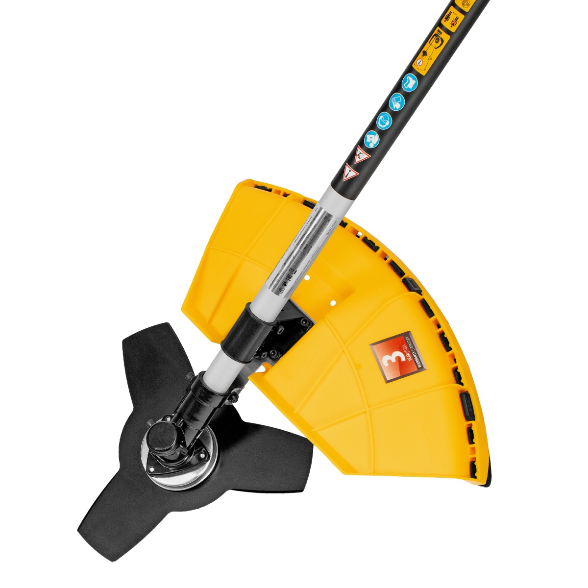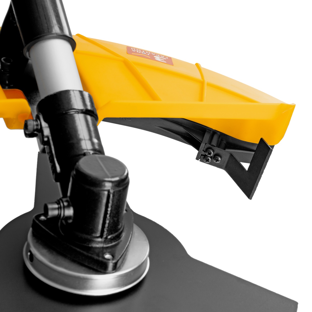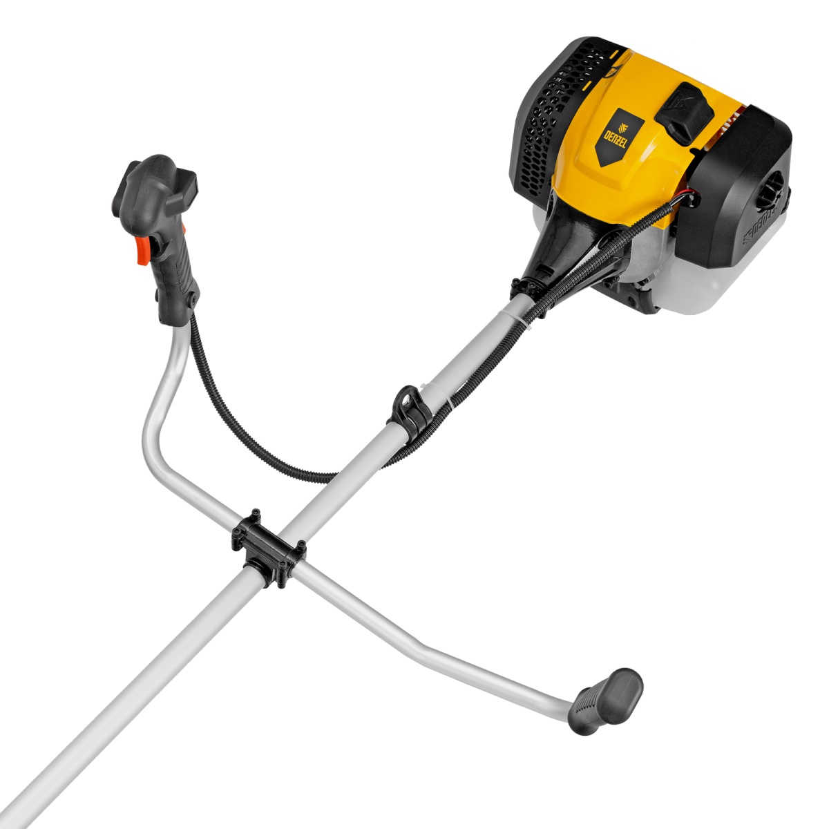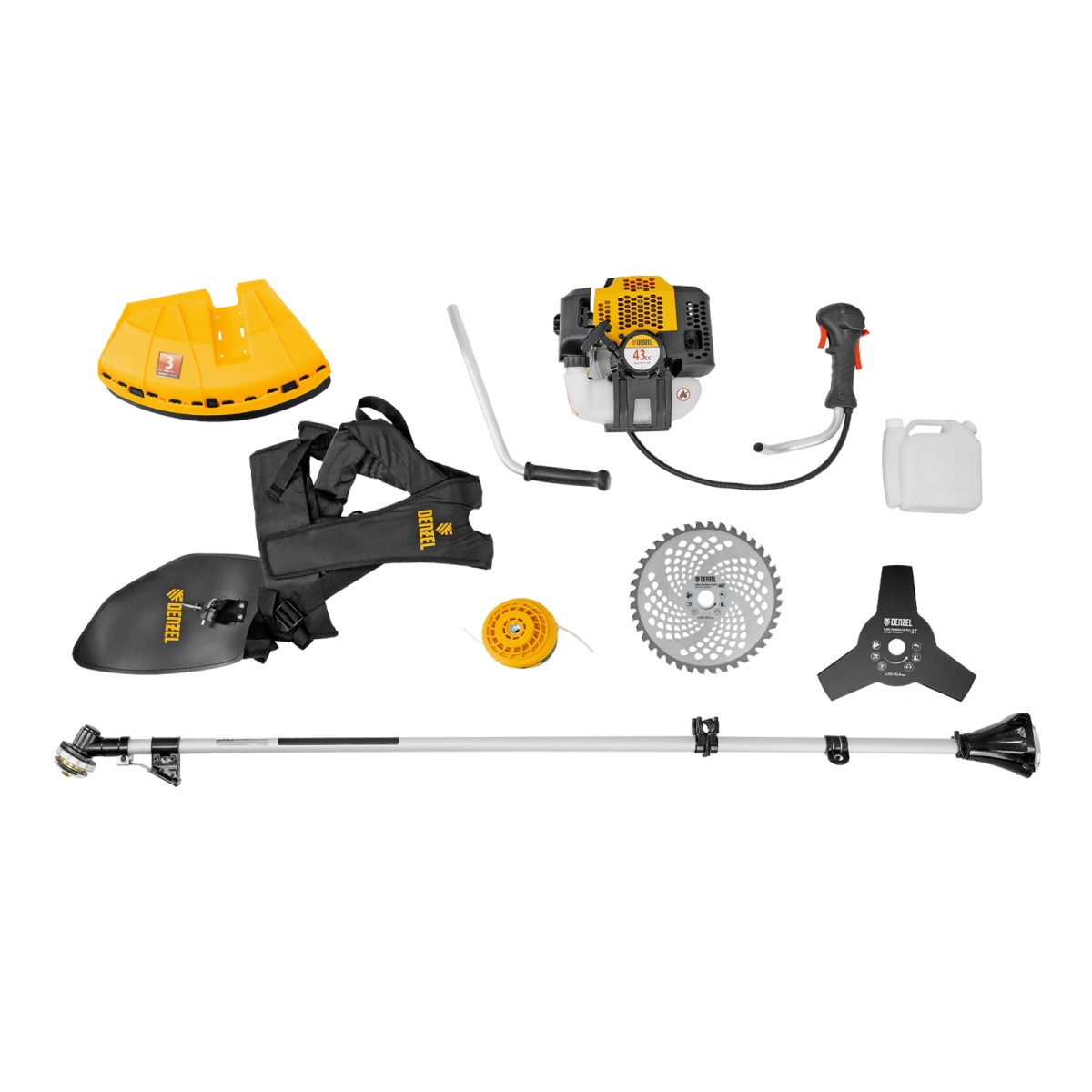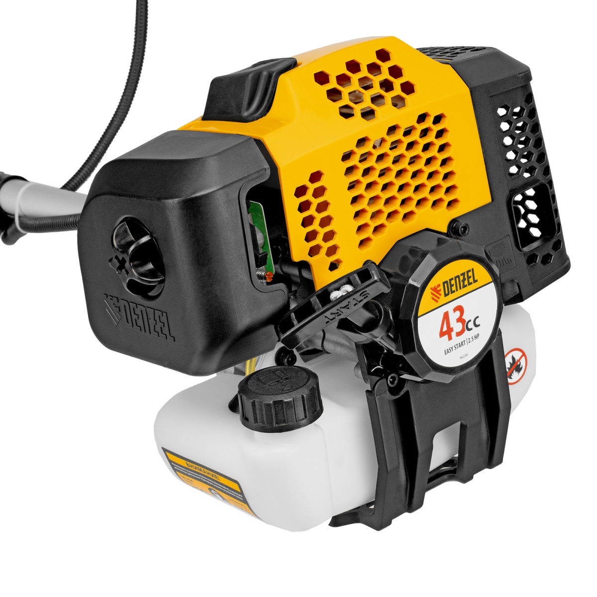 Бензиновый триммер Denzel DGT 430 96236 с неразъемной штангой состоит из 2 частей. Это отличный инструмент для борьбы с густой травой и создания аккуратных лужаек. Подходит для мест, в которых с обычными газонокосилками работать тяжело. Экономичный двигатель мощностью 2,5 л. с. позволяет эффективно работать на участке площадью до 9-10 соток.В комплект поставки входят 2 режущие насадки: усиленная полиамидная катушка для густой травы и пильный диск для молодого кустарника и побегов деревьев.Преимущества:Усиленная полуавтоматическая катушка позволяет обновить леску, не отрываясь от работы — для этого надо слегка стукнуть шпулей об землю.Пусковая система Easy Start позволяет легко и быстро запустить триммер, даже если он долго не использовался.Детали двигателя покрыты хромом, что значительно продлевает срок службы техники.Прочная алюминиевая штанга с толщиной стенок 1,5 мм выдерживает повышенные нагрузки.Пластиковый кожух защищает оператора от вылетающих твердых частиц, травы и камней.Полного бака хватит на 45 минут работы при максимальной нагрузке, этого достаточно для выполнения большого объема работ.Прозрачный бензобак позволяет контролировать расход топлива и вовремя осуществлять заправку.Всё управление собрано на прорезиненной рукоятке с улучшенной эргономикой, а клавиша зажигания вынесена под большой палец, что позволяет экстренно остановить двигатель в случае необходимости.Трансмиссионный вал закален токами высокой частоты, это повышает ресурс триммера.Воздушный фильтр легко меняется при необходимости благодаря винтовому креплению.Небольшой вес, современная антивибрационная система, хорошая сбалансированность инструмента и двухплечевой ремень позволяют работать с комфортом даже продолжительное время.Гарантия 3 года от производителя подтверждает высокое качество триммера.
