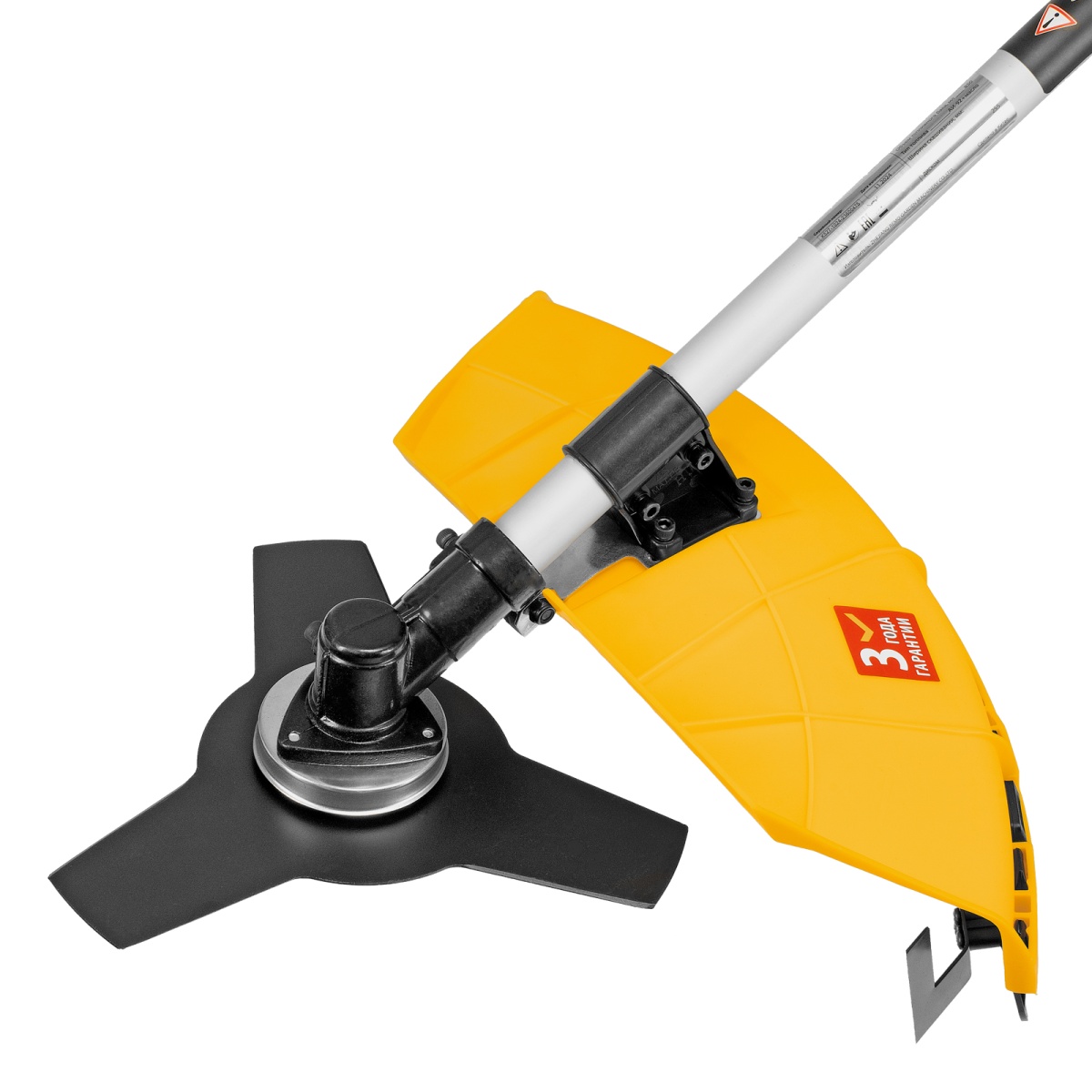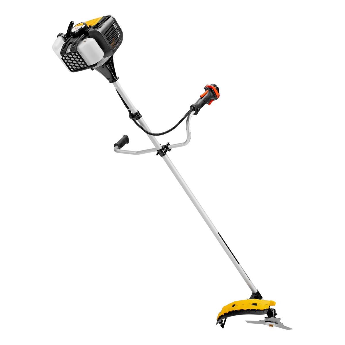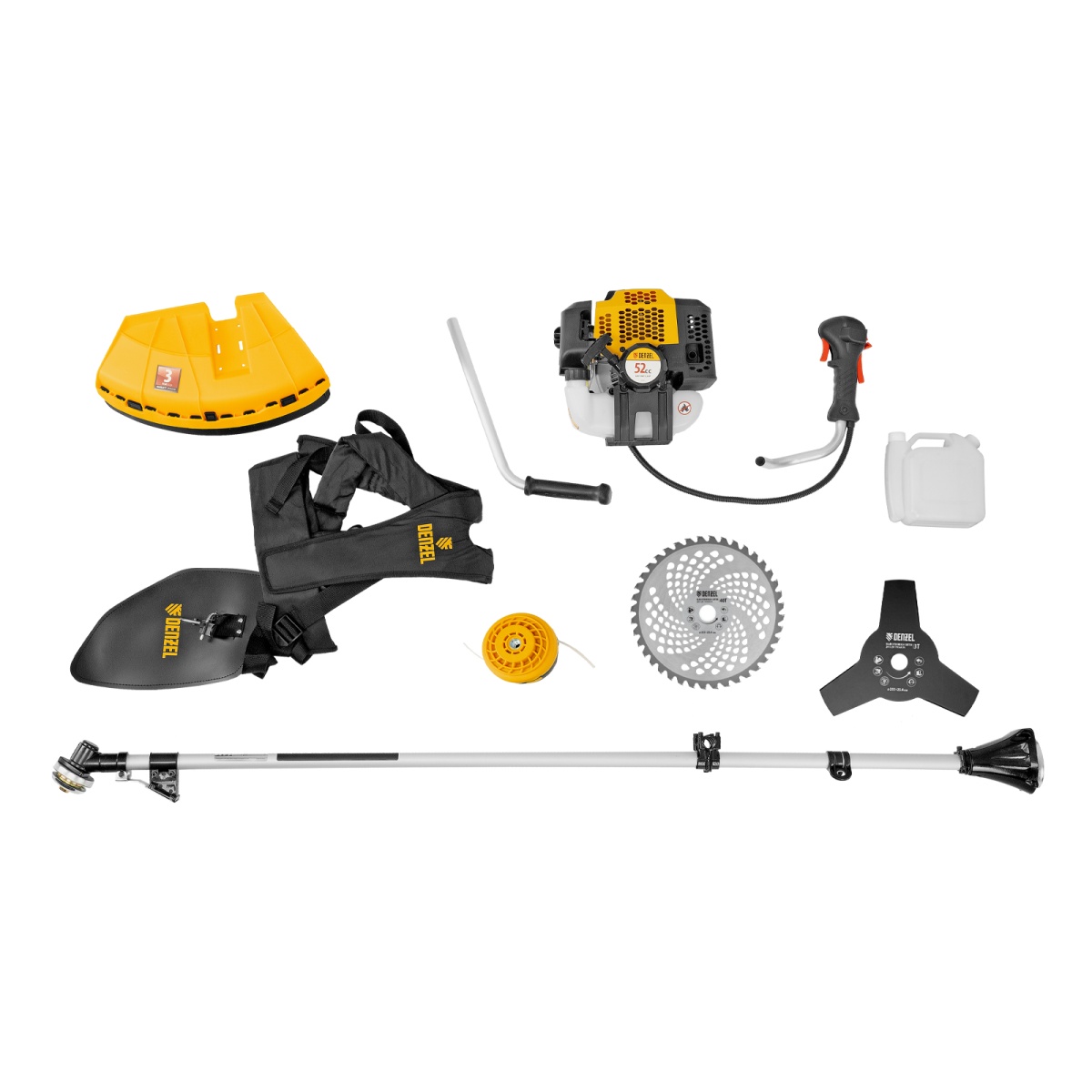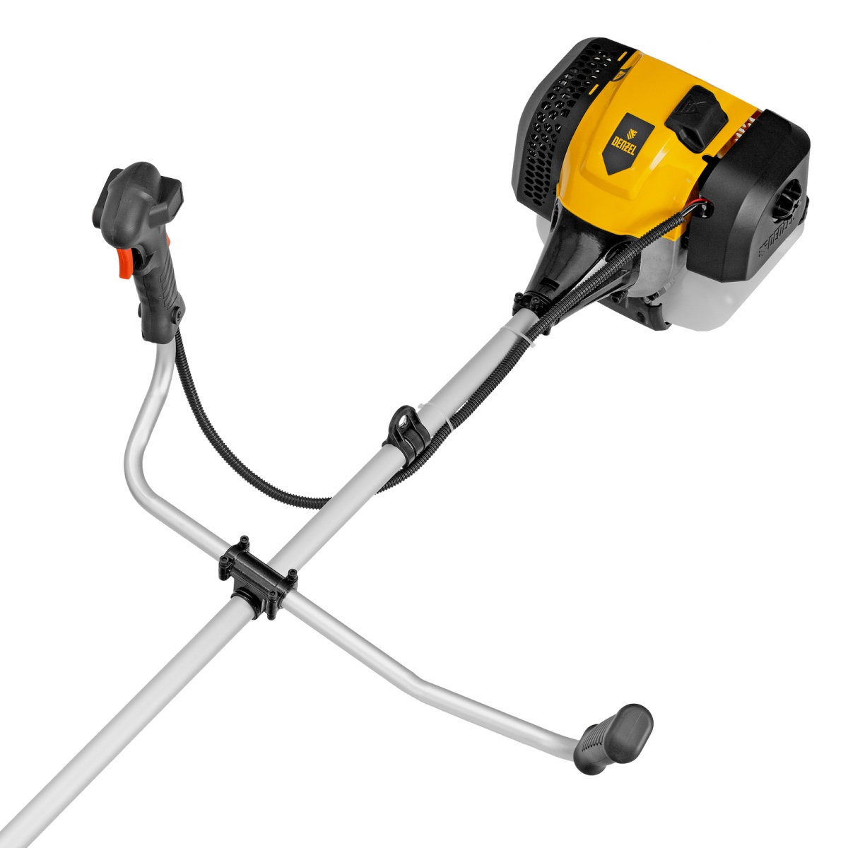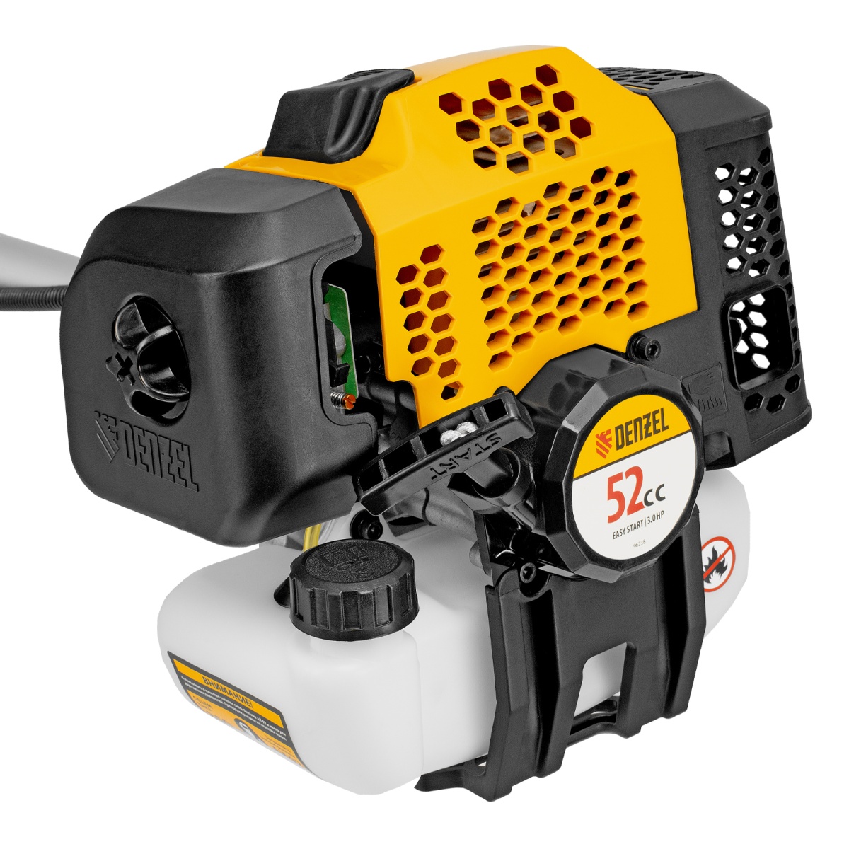 Бензиновый триммер Denzel DGT-520 96238 с неразъемной штангой состоит их 2 частей и оснащен мощным двигателем на 3 л.с., при этом отличается легкостью и экономичным расходом топлива. Детали двигателя покрыты хромом, что значительно увеличивает ресурс инструмента. Усиленная катушка из полиамида легко справится с травой любой густоты даже в недоступных для колесной косилки местах. Пильный диск позволит легко избавиться от молодой поросли деревьев и кустарника.Хорошая сбалансированность инструмента, современная антивибрационная система, подвесной двухплечевой ремень и удобное управление позволяют работать с комфортом даже продолжительное время.Преимущества:Настройка лески без отрыва от работы — достаточно слегка стукнуть шпулей катушки об землю, и леска вытянется до нужной длины.Пусковая система Easy Start — двигатель легко запустить, даже если инструмент долго не использовался.Высокий ресурс — трансмиссионный вал закален токами высокой частоты, алюминиевая штанга отличается увеличенной толщиной стенок 1,5 мм.Экономичный расход топлива — полного бака хватит почти на 45 мин работы при максимальной нагрузке.Полупрозрачный топливный бак — пользователь сможет отслеживать уровень бензина и своевременно заправлять инструмент.Точность ведения и комфортная работа — триммер оснащен велосипедными ассиметричными ручками для наиболее удобного захвата.Простое управление — все клавиши расположены на правой рукоятке, клавиша газа вынесена под большой палец и позволяет экстренно остановить двигатель при необходимости.Безопасность — защитный пластиковый кожух предохраняет пользователя от вылета травы, камней и щепок.Расширенная гарантия 3 года — качество триммера подтверждено производителем.