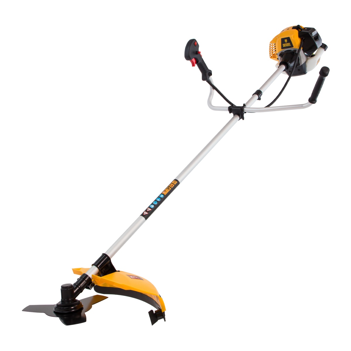 Бензиновый триммер Denzel DR-43 предназначен для скашивания мелкой, густой и слежавшейся травы, формирования границ газона, подравнивания молодого кустарника и спиливания побегов деревьев. Им удобно пользоваться в самых труднодоступных местах: на овражках, вокруг деревьев, вдоль стен и заборов. Благодаря мощности 2,5 л.с. частота вращения оснастки составляет 9500 об/мин. К триммеру прилагаются две насадки: трехлопастной нож (ширина скашивания 25,5 см) и катушка с леской (42 см).Триммер работает на бензине, поэтому может применяться для работы с мокрой травой.
