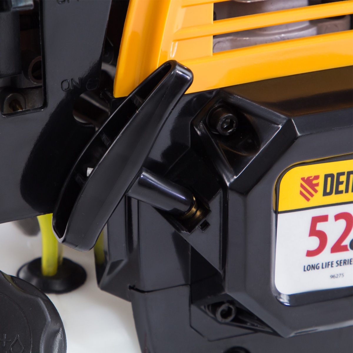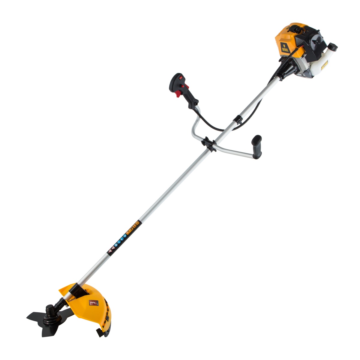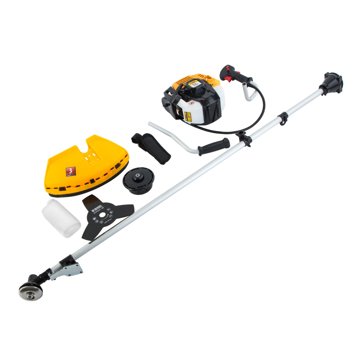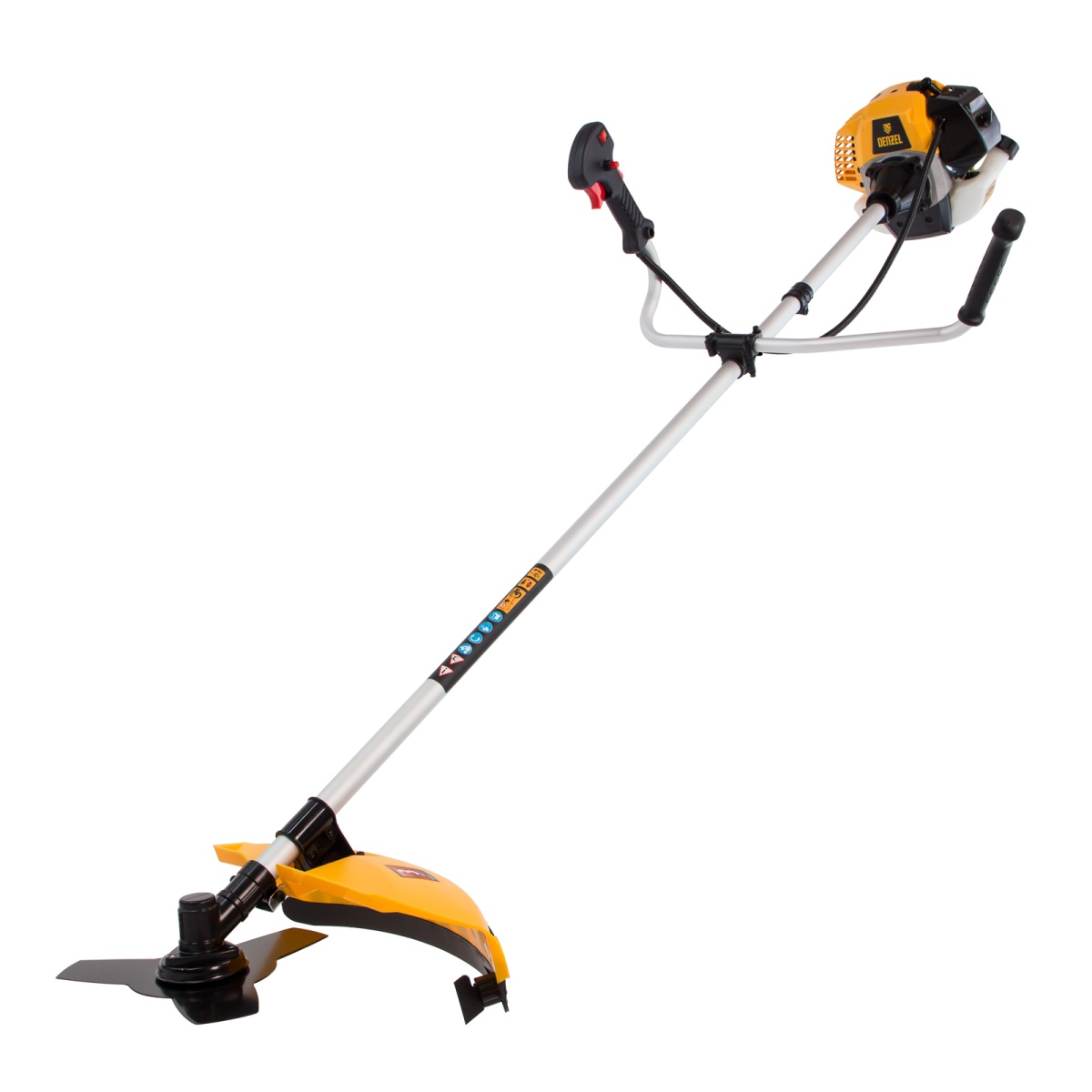Бензиновый триммер Denzel DR-52 предназначен для ухода за газоном и формирования у него ровных границ, скашивания травы любой длины, подрезания молодого кустарника. К нему прилагаются две насадки — трехлопастной нож из стали и усиленная катушка из полиамида с режущей леской. Они вращаются со скоростью 9500 об/мин, и имеют ширину скашивания 25,5 и 42 см.Данная модель является самой производительной из линейки DR. Двигатель объемом 52 см3 обеспечивает мощность 3 л.с. и уверенную работу даже на сложном рельефе. Преимущества:Несмотря на высокую мощность, топливо расходуется экономно. Одной заправки может хватить на целый час.Масло с бензином смешиваются в удобном дозаторе, который входит в комплект поставки.Прозрачный бензобак облегчает контроль за уровнем топлива и позволяет вовремя производить заправку.Надежный редуктор уверенно передает крутящий момент режущему инструменту, исключая заклинивание.Защитный корпус закрывает двигатель от загрязнения и механических повреждений, а пользователя — от ожогов.Качество деталей обеспечивает высокий ресурс поршневой группы: цилиндр двигателя хонингован и покрыт пористым хромом.Оснастка легко снимается и устанавливается, на смену режима работы не уйдет много времени.Клавиша блокировки газа обеспечивает безопасность оператора: триммер невозможно запустить случайно, получение травм исключено.Обновление лески происходит при легком ударе катушкой о землю, отключать двигатель для этого не нужно.Ограничительный нож обрезает лишние «хвосты» лески, чтобы они не мешали работе и не приводили к перегреву двигателя.Защитный кожух из противоударного пластика выдерживает даже высокие нагрузки и надежно защищает оператора от разлетающейся травы и камней.Эргономичный велосипедный руль с пластиковыми ручками обеспечивает удобный захват и не стеснят оператора в движениях.Плечевой ремень грамотно перераспределяет нагрузку, поэтому оператор меньше устает.Толщина стенок штанги увеличена до 1,5 мм, поэтому она не боится высоких нагрузок и механических воздействий.Амортизирующая система снижает вибрации и обеспечивает удобную эксплуатацию без вреда для здоровья.Вес 6.9 кг делает работу и перемещение триммера удобным.