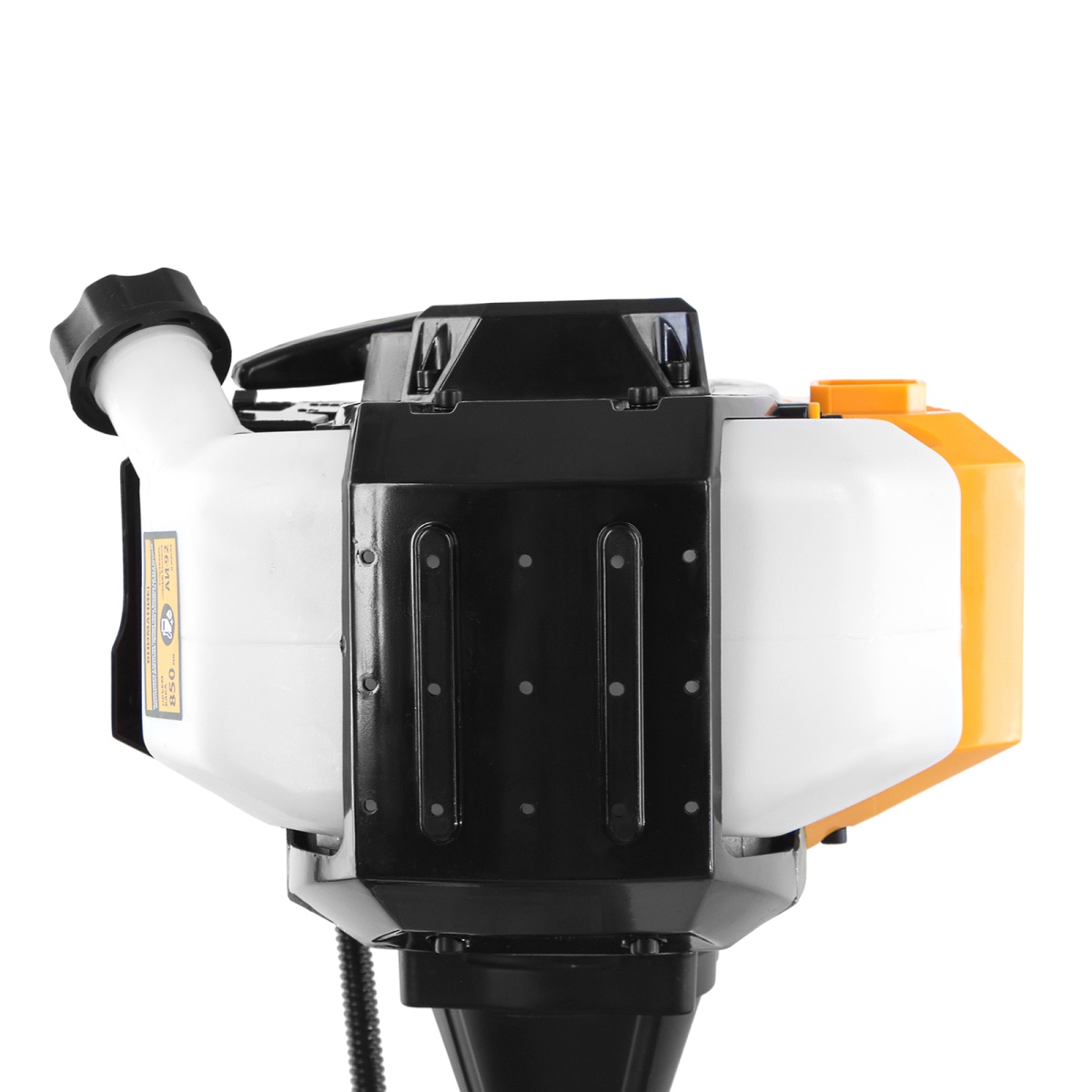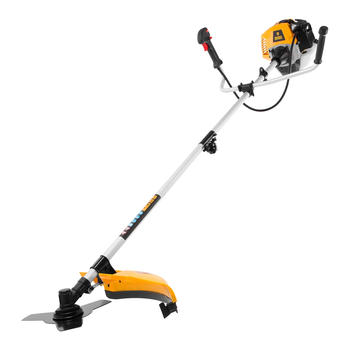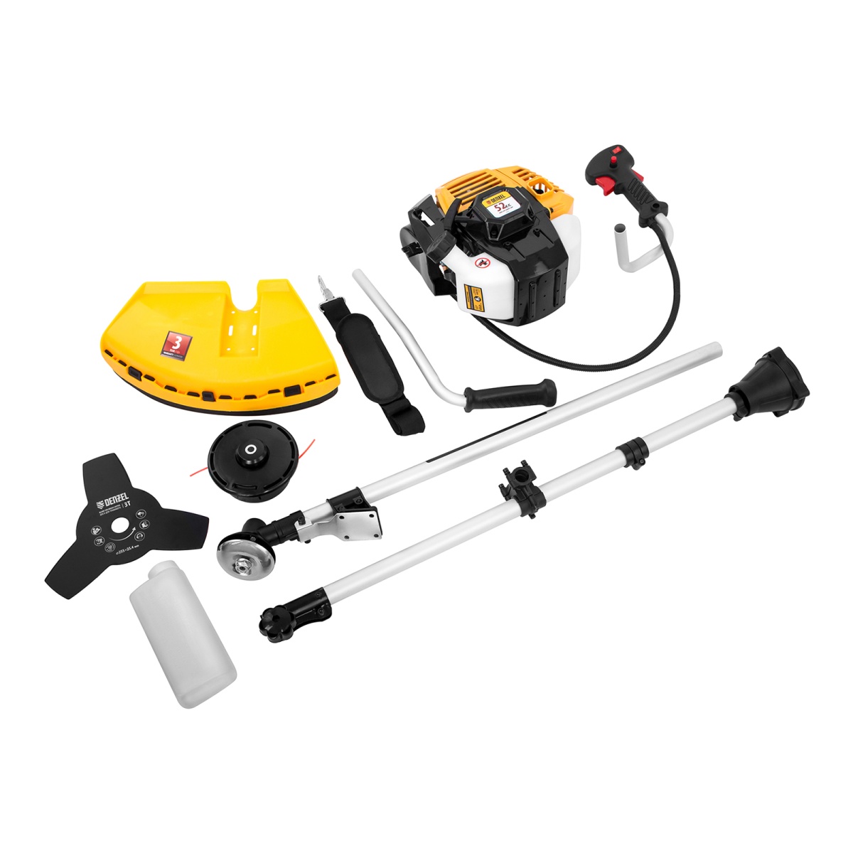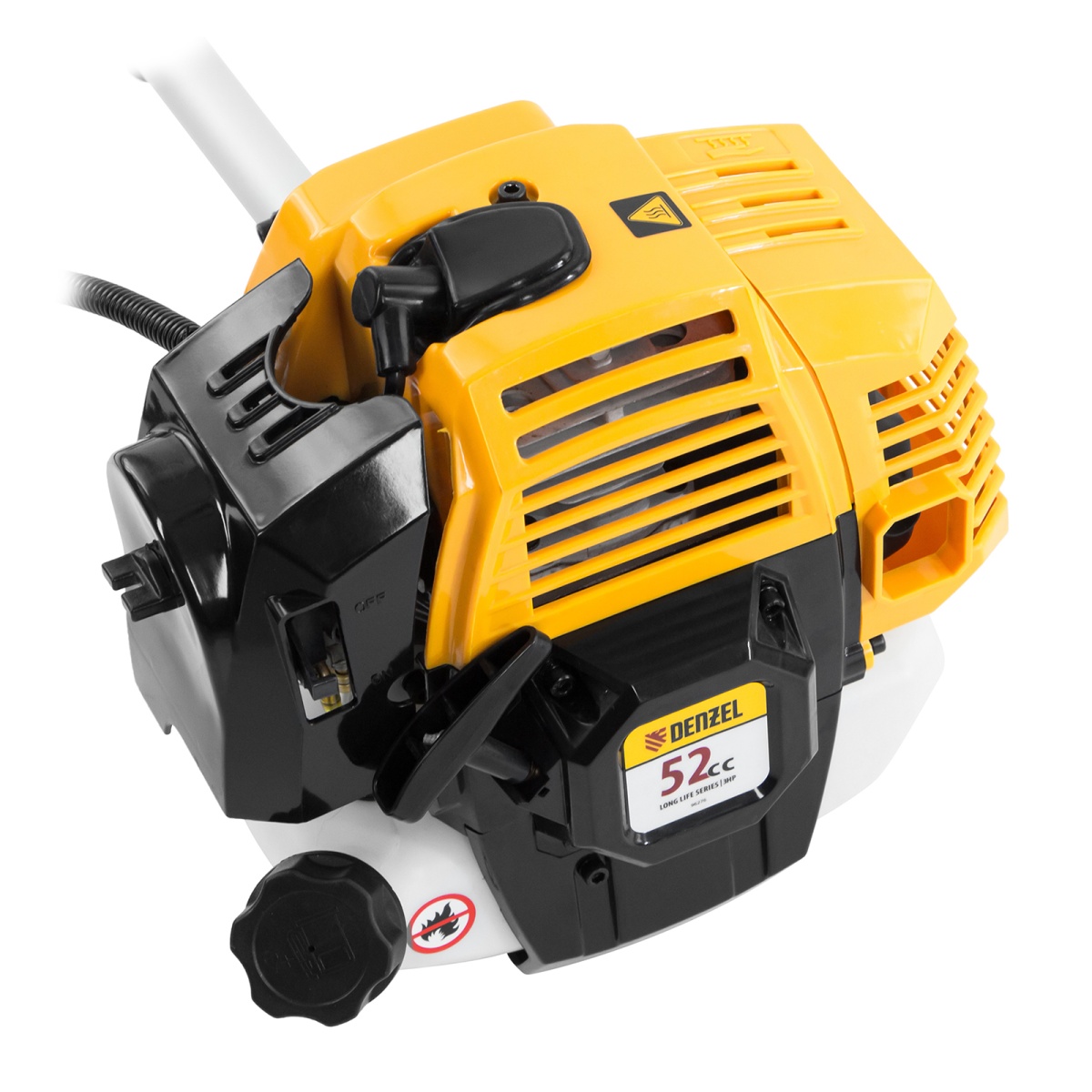 Бензотриммер Denzel DR-52S используется для ухода за газонной травой, срезания бурьяна и сорняков, подравнивания молодого кустарника. Также он будет эффективен на сложных участках: вдоль стен, в ямках и на возвышенностях, вокруг деревьев и т.д. Две режущие насадки — трехлопастной нож и катушка с леской — вращаются со скоростью 9500 об/мин, обеспечивая ширину скашивания 25,5 и 42 см.Двухтактный двигатель объемом 52 см3 обеспечивает высокую мощность 3 л.с. Несмотря на это, триммер экономично расходует топливо, поэтому часто заправлять его не придется. Преимущества:Разъемная штанга — триммер поместится на небольшой полке для инструментов, а транспортировка не составит труда.Канистра для приготовления топливной смеси прилагается к триммеру.Контроль за расходом топлива — стенки бензобака сделаны прозрачными, это позволяет вовремя осуществлять заправку и предотвращать разрушение двигателя.Надежная стыковка вала с редуктором — шлицевое соединение сделано из высокопрочного металла, закаленного до твердости 50 HRС, поэтому он не подвержен повреждениям и ему не страшны высокие нагрузки.Усиленная конструкция стартера — использование металлических, а не пластиковых деталей позволило добиться высокой износоустойчивости.Противоударный корпус — двигатель надежно закрыт от внешних воздействий и загрязнений, а пользователь защищен от ожогов.Высокий ресурс поршневой группы обеспечивают качественные детали: цилиндр двигателя покрыт пористым хромом и хонингован.Быстрая замена насадок — снять и установить режущий инструмент, будь то нож или катушка, не составит труда.Полуавтоматическая катушка — чтобы обновить леску, не нужно снижать обороты двигателя. Слегка ударьте катушкой по земле и длина лески увеличится.Ограничительный нож — леска автоматически подрезается до необходимой длины, поэтому двигатель работает без риска перегрузки и перегрева.Блокиратор газа — оператор защищен от травм, т.к. случайное включение триммера исключено.Защитный кожух — трава, ветки и камни не отлетят на пользователя.U-образный асимметричный руль — триммером легко маневрировать, т.к. он не ограничивает движения.Работа без усталости — плечевой ремень снимает часть нагрузки с рук, что повышает время комфортной работы.Антивибрационная система — можно косить траву долгое время, т.к. амортизаторы защищают оператора от негативного воздействия вибраций.Толщина стенок штанги 1,5 мм — триммер не боится ударных нагрузок, препятствий и работы в оврагах.Вес всего 7 кг — бензотриммер легко удерживать, выполнять сложные маневры и перемещать.