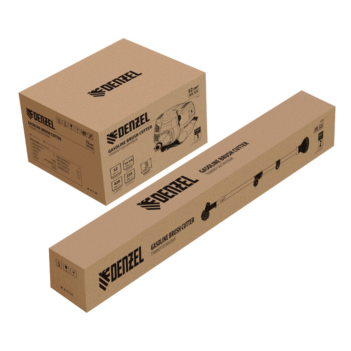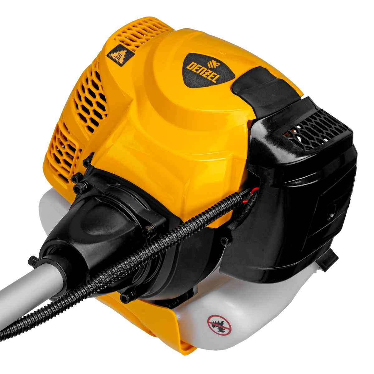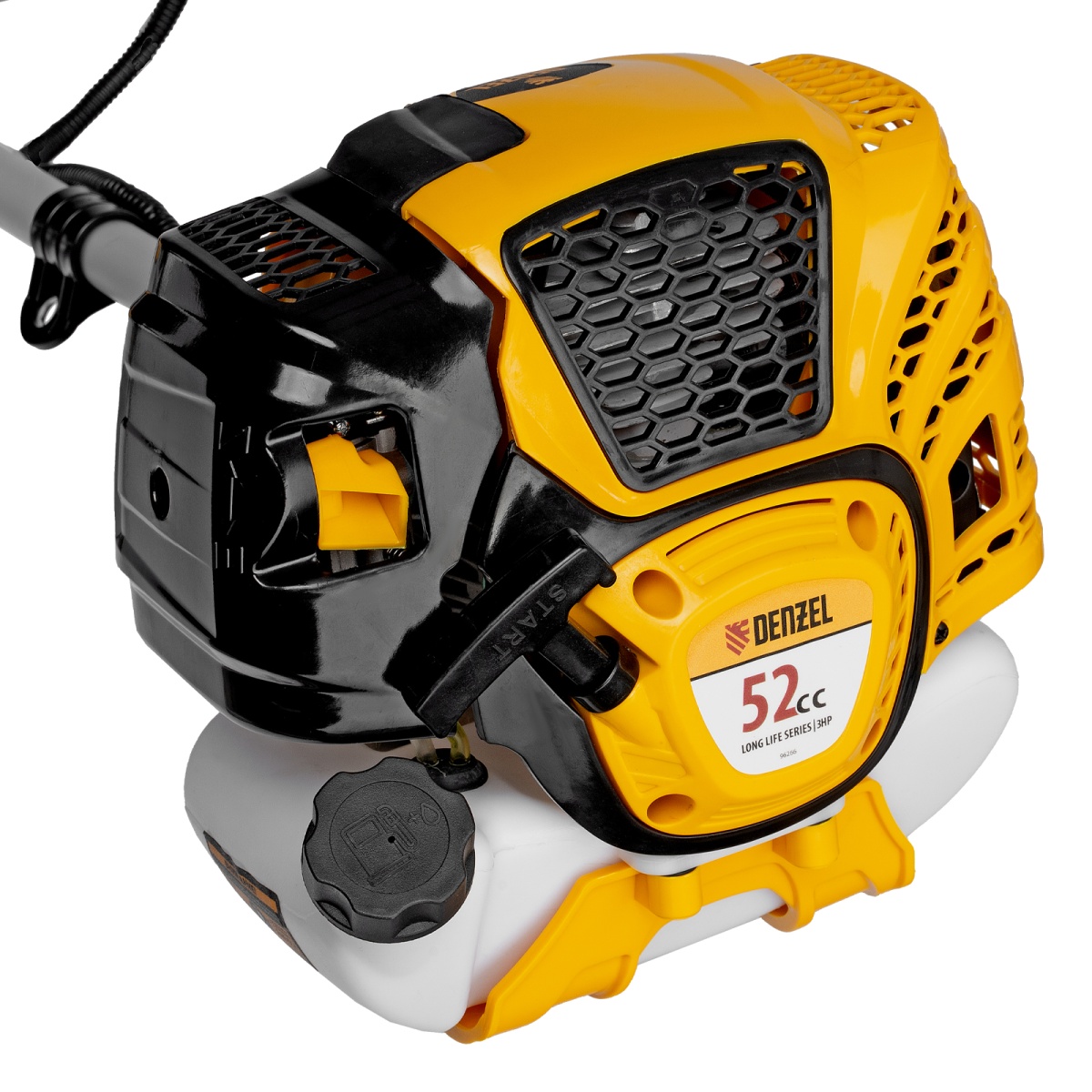 Бензиновый триммер Denzel DTL-52S предназначен для стрижки газонной травы, удаления зарослей на участке, подпиливания небольших кустов и побегов деревьев. Он комплектуется усиленной полиамидной катушкой с леской и пильным ножом из высокопрочной стали. Триммер комплектуется 2 оснастками: режущей леской и пильным диском, они обеспечивают ширину скашивания 25,5 см и 42 см.Объем двухтактного двигателя мощностью 3 л.с. увеличен до 52 см3, а бензобак вмещает в себя 1,2 л топливной смеси. Триммер работает без подключения к электросети, поэтому подходит для скашивания влажной травы и работы на отдаленных от дома участках. Преимущества:Цилиндр двигателя покрыт пористым хромом и хонингован, это повышает ресурс поршневой группы в несколько раз.Бензин и смазочное масло смешиваются в удобном дозаторе (входит в комплект) и заливаются в один бак.Прозрачные стенки топливного бака облегчают контроль уровня топлива. Такое решение позволяет минимизировать риск работы двигателя вхолостую.Клавиша блокировки газа не дает оператору случайно включить триммер, защищая его от травм.Длина режущей лески увеличивается при необходимости легким ударом шпули о землю. Такая полуавтоматическая система подачи экономит время оператора, т.к. не требует отключения двигателя.Небольшой нож на защитном кожухе предназначен для обрезания лески в случае, если ее длина превышает максимально допустимую. Таким образом обеспечивается защита двигателя от лишней нагрузки и перегрева.Защитный кожух предотвращает отскакивание веток и камней на оператора.Опция быстрой замены оснастки позволяет сэкономить рабочее время и оперативно подстроиться под участки со сложным рельефом.Эргономичная велосипедная рукоятка имеет асимметричную форму, поэтому ее удобно удерживать в руках даже при долгой эксплуатации.Качественная балансировка триммера позволяет с комфортом маневрировать даже на сложных участках, при этом устройство не заваливается в стороны.Разборная штанга триммера позволяет компактно разместить его в транспортном средстве и месте хранения.Плечевой ремень с защитой бедра снимает часть нагрузки с рук оператора и защищает ногу, с которой соприкасается триммер.Оптимизированная антивибрационная система гасит вибрации, поэтому работать даже долгое время можно без вреда для здоровья.Небольшой вес триммера 7.8 кг делает простым его перемещение.Гарантия на триммер увеличена до трех лет, а средний срок службы составляет минимум 5 лет.