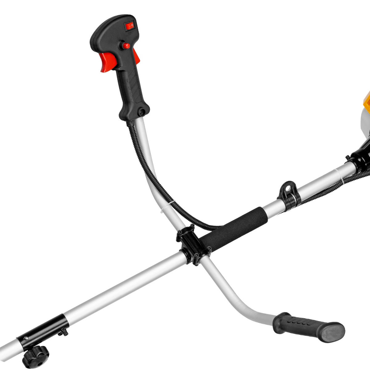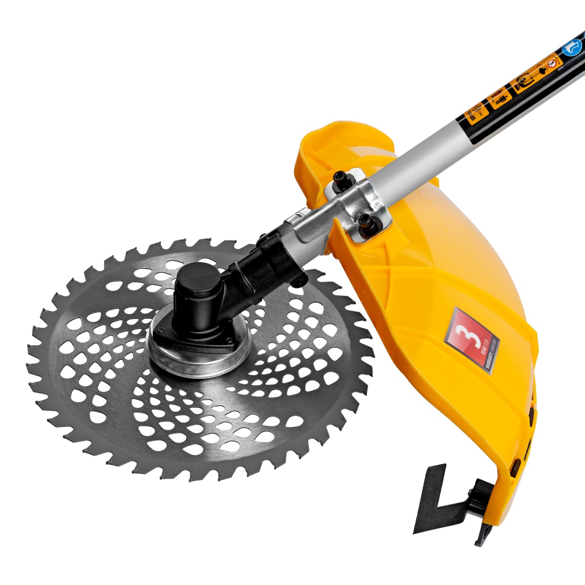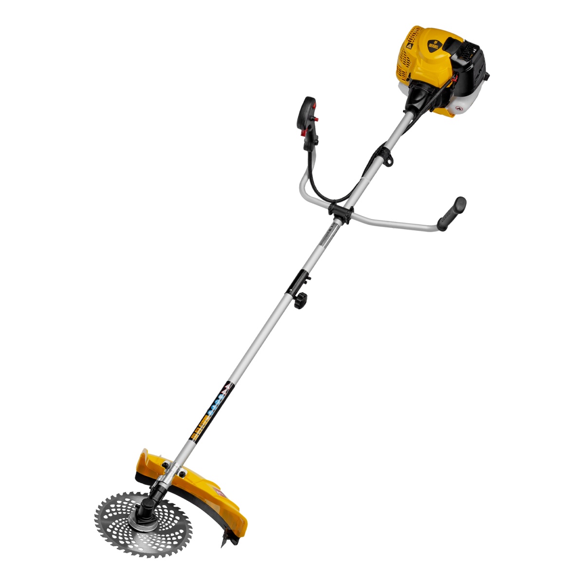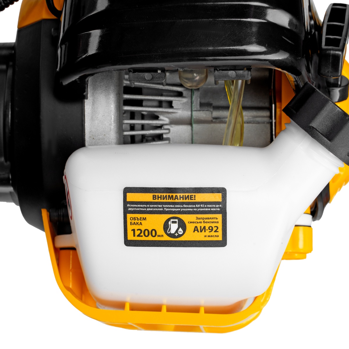 Бензиновый триммер Denzel DTL-52S предназначен для стрижки газонной травы, удаления зарослей на участке, подпиливания небольших кустов и побегов деревьев. Он комплектуется усиленной полиамидной катушкой с леской и пильным ножом из высокопрочной стали. Триммер комплектуется 2 оснастками: режущей леской и пильным диском, они обеспечивают ширину скашивания 25,5 см и 42 см.Объем двухтактного двигателя мощностью 3 л.с. увеличен до 52 см3, а бензобак вмещает в себя 1,2 л топливной смеси. Триммер работает без подключения к электросети, поэтому подходит для скашивания влажной травы и работы на отдаленных от дома участках. Преимущества:Цилиндр двигателя покрыт пористым хромом и хонингован, это повышает ресурс поршневой группы в несколько раз.Бензин и смазочное масло смешиваются в удобном дозаторе (входит в комплект) и заливаются в один бак.Прозрачные стенки топливного бака облегчают контроль уровня топлива. Такое решение позволяет минимизировать риск работы двигателя вхолостую.Клавиша блокировки газа не дает оператору случайно включить триммер, защищая его от травм.Длина режущей лески увеличивается при необходимости легким ударом шпули о землю. Такая полуавтоматическая система подачи экономит время оператора, т.к. не требует отключения двигателя.Небольшой нож на защитном кожухе предназначен для обрезания лески в случае, если ее длина превышает максимально допустимую. Таким образом обеспечивается защита двигателя от лишней нагрузки и перегрева.Защитный кожух предотвращает отскакивание веток и камней на оператора.Опция быстрой замены оснастки позволяет сэкономить рабочее время и оперативно подстроиться под участки со сложным рельефом.Эргономичная велосипедная рукоятка имеет асимметричную форму, поэтому ее удобно удерживать в руках даже при долгой эксплуатации.Качественная балансировка триммера позволяет с комфортом маневрировать даже на сложных участках, при этом устройство не заваливается в стороны.Разборная штанга триммера позволяет компактно разместить его в транспортном средстве и месте хранения.Плечевой ремень с защитой бедра снимает часть нагрузки с рук оператора и защищает ногу, с которой соприкасается триммер.Оптимизированная антивибрационная система гасит вибрации, поэтому работать даже долгое время можно без вреда для здоровья.Небольшой вес триммера 7.8 кг делает простым его перемещение.Гарантия на триммер увеличена до трех лет, а средний срок службы составляет минимум 5 лет.